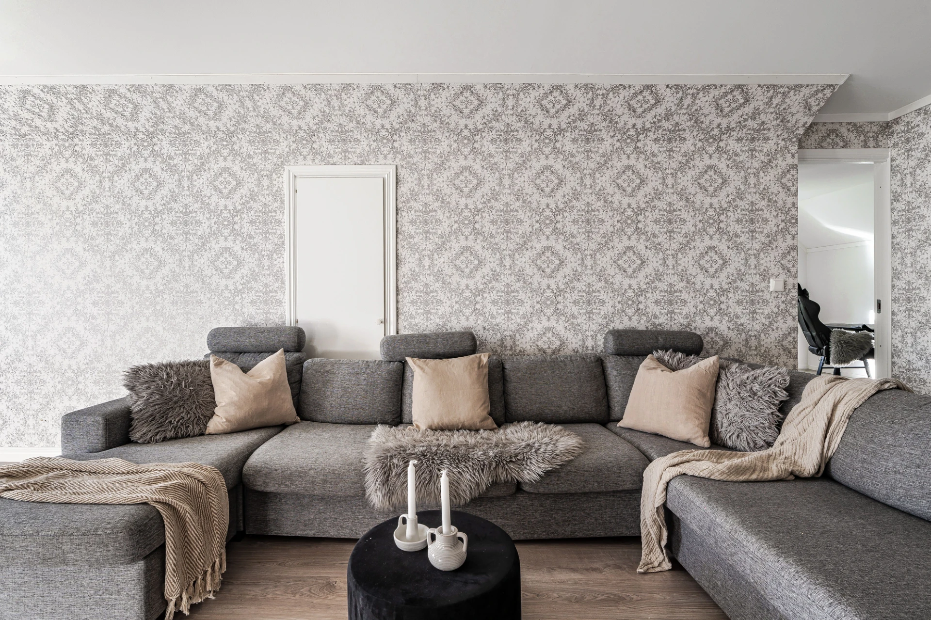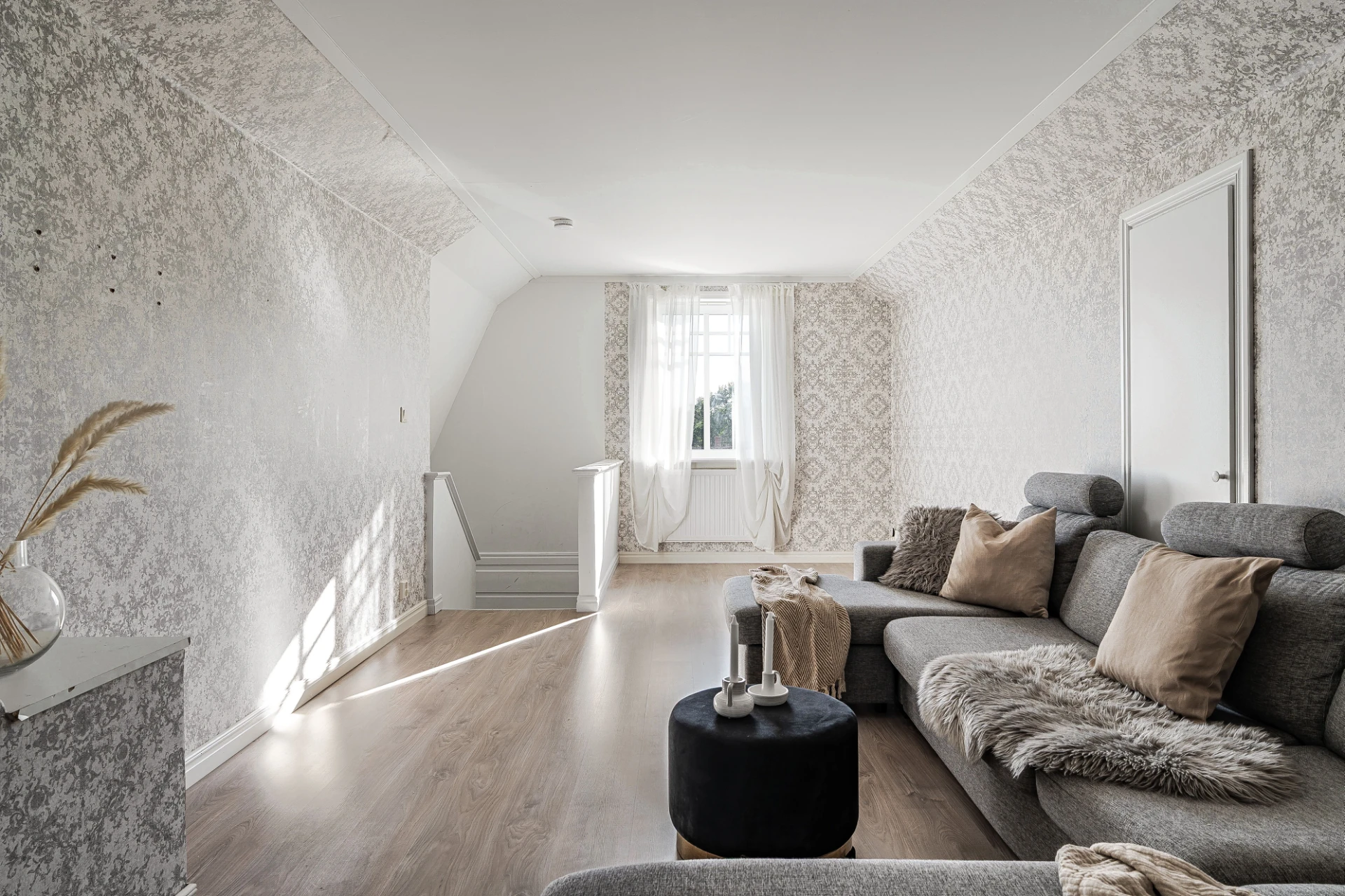 Laminatgolv och mönstrade väggar. Här finns plats för soffa med tillhörande möblemang.