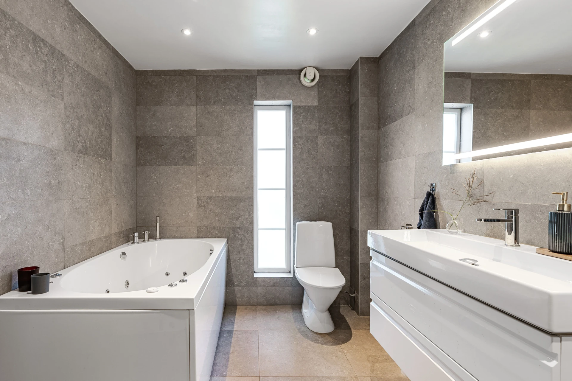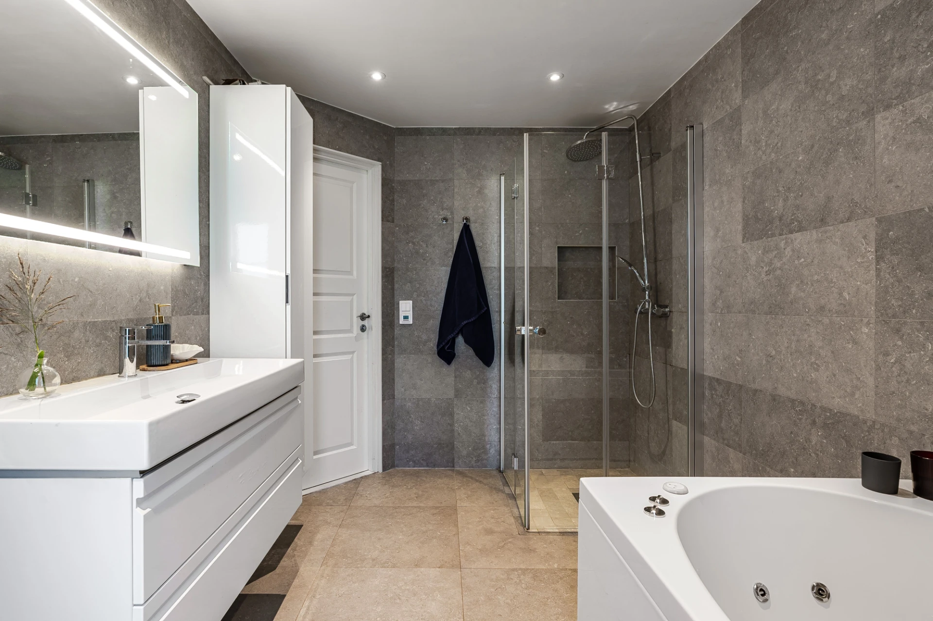 Klinkergolv och helkaklade väggar. Spotlights i tak. Badrummet är utrustat med wc, handfat med kommod, vägghängd förvaring, vägghängd spegel, dusch med vikbara glasdörrar samt badkar.