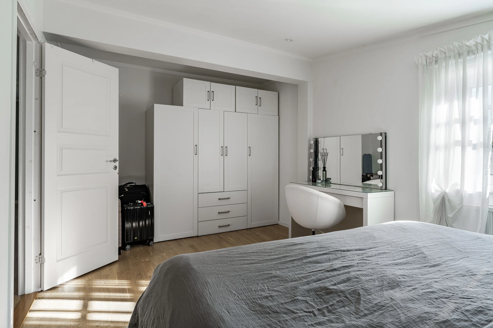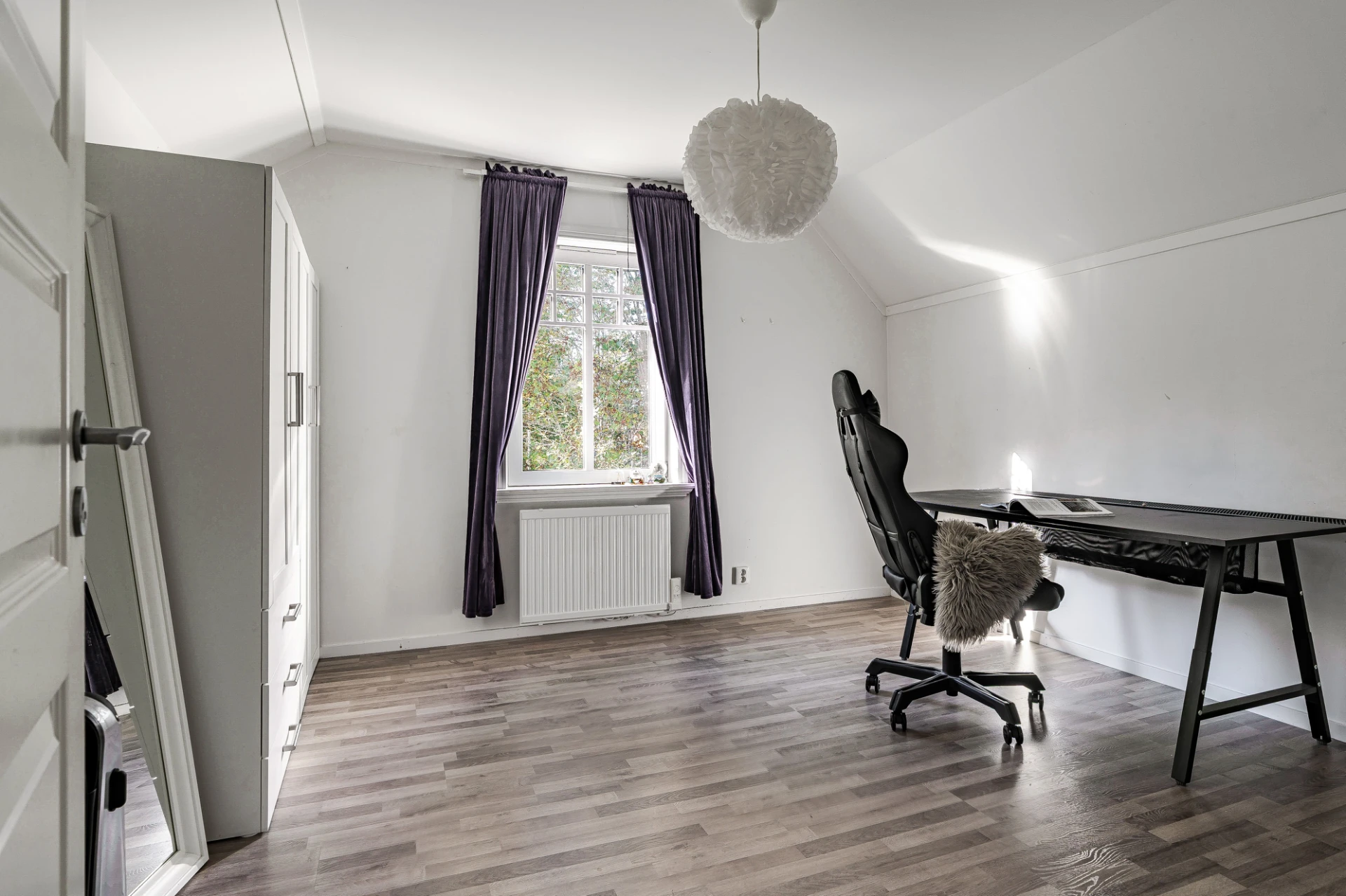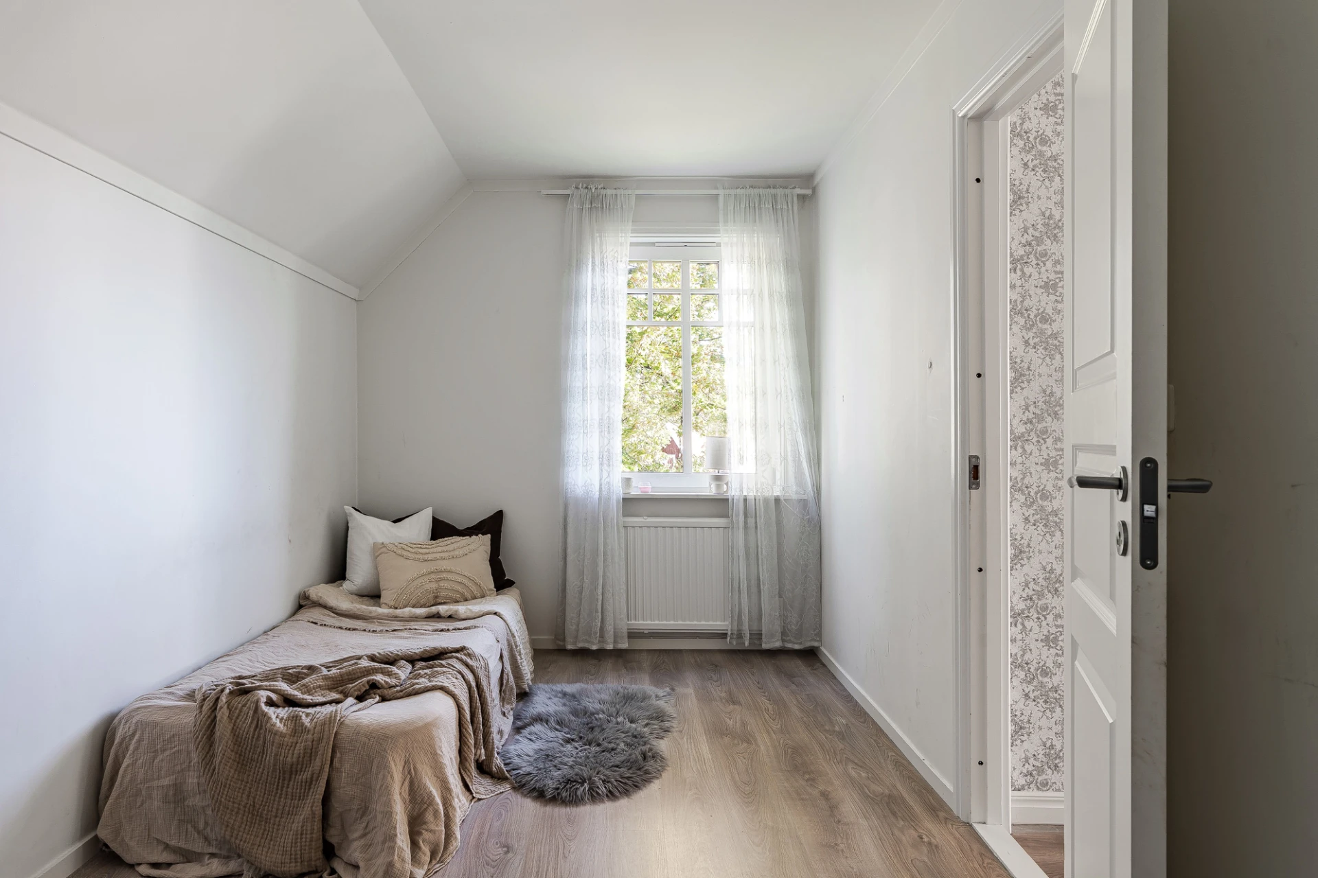 Laminatgolv och ljusa väggar. Här finns plats för säng med tillhörande möblemang samt skrivbordshörna.