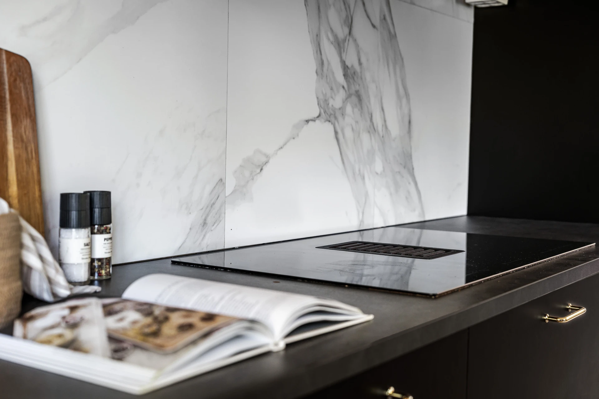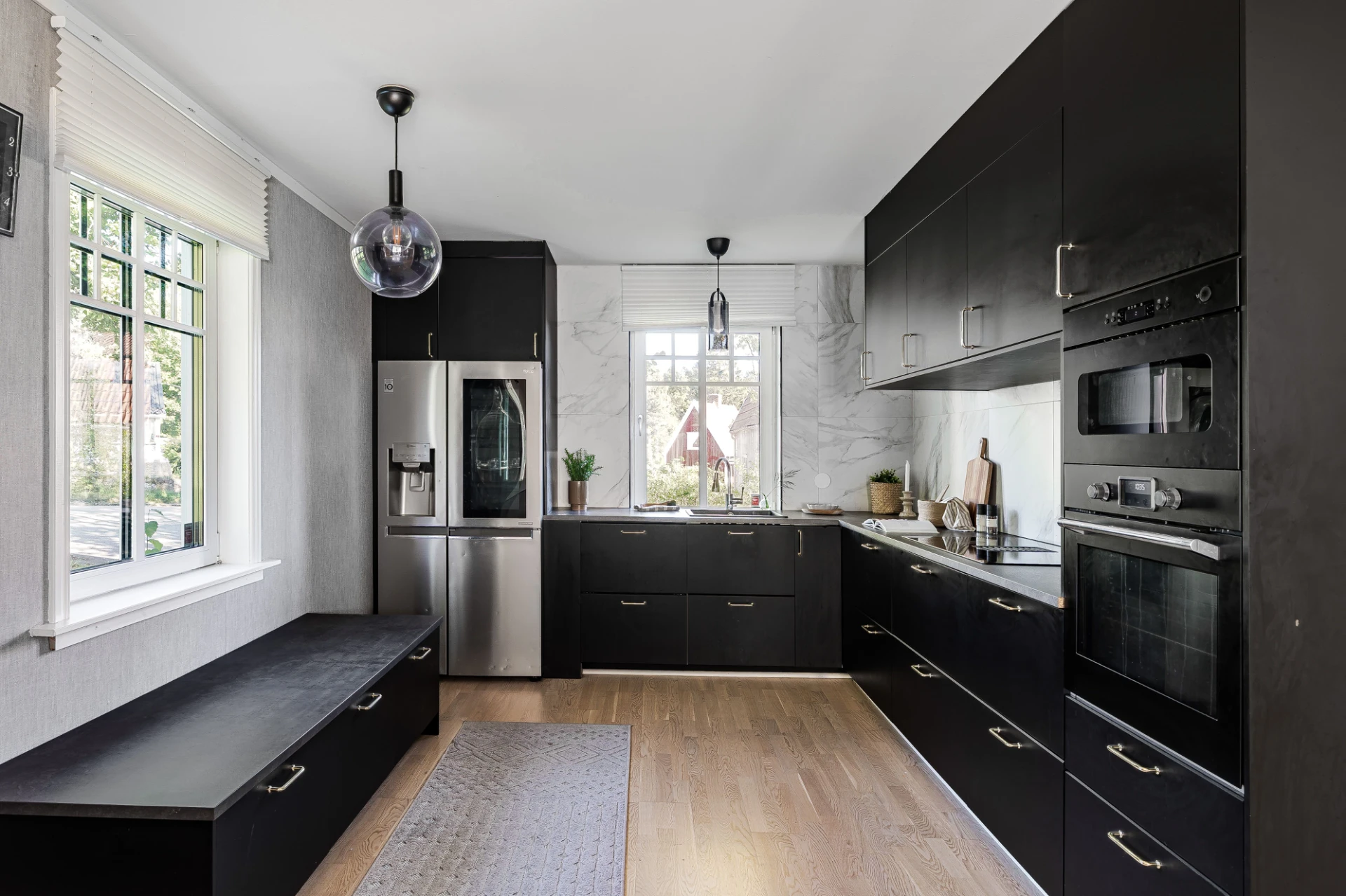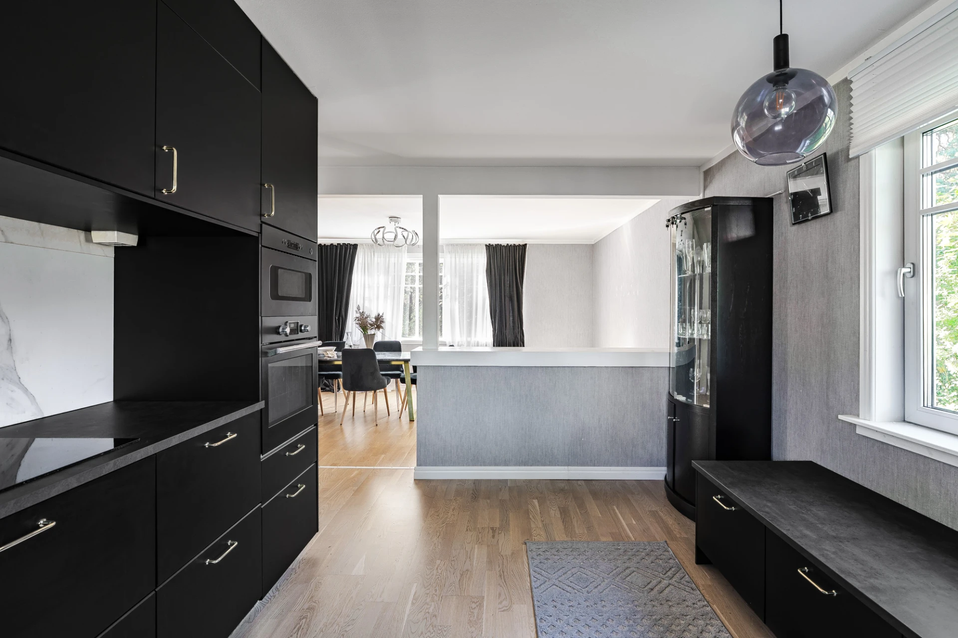 Parkettgolv och ljusgrå väggar. Den maskinella utrustningen består av induktionshäll, inbyggd ugn, inbyggd mikro, spisfläkt, integrerad diskmaskin samt integrerad kyl och frys. Renoverat 2021 av tidigare ägare.
