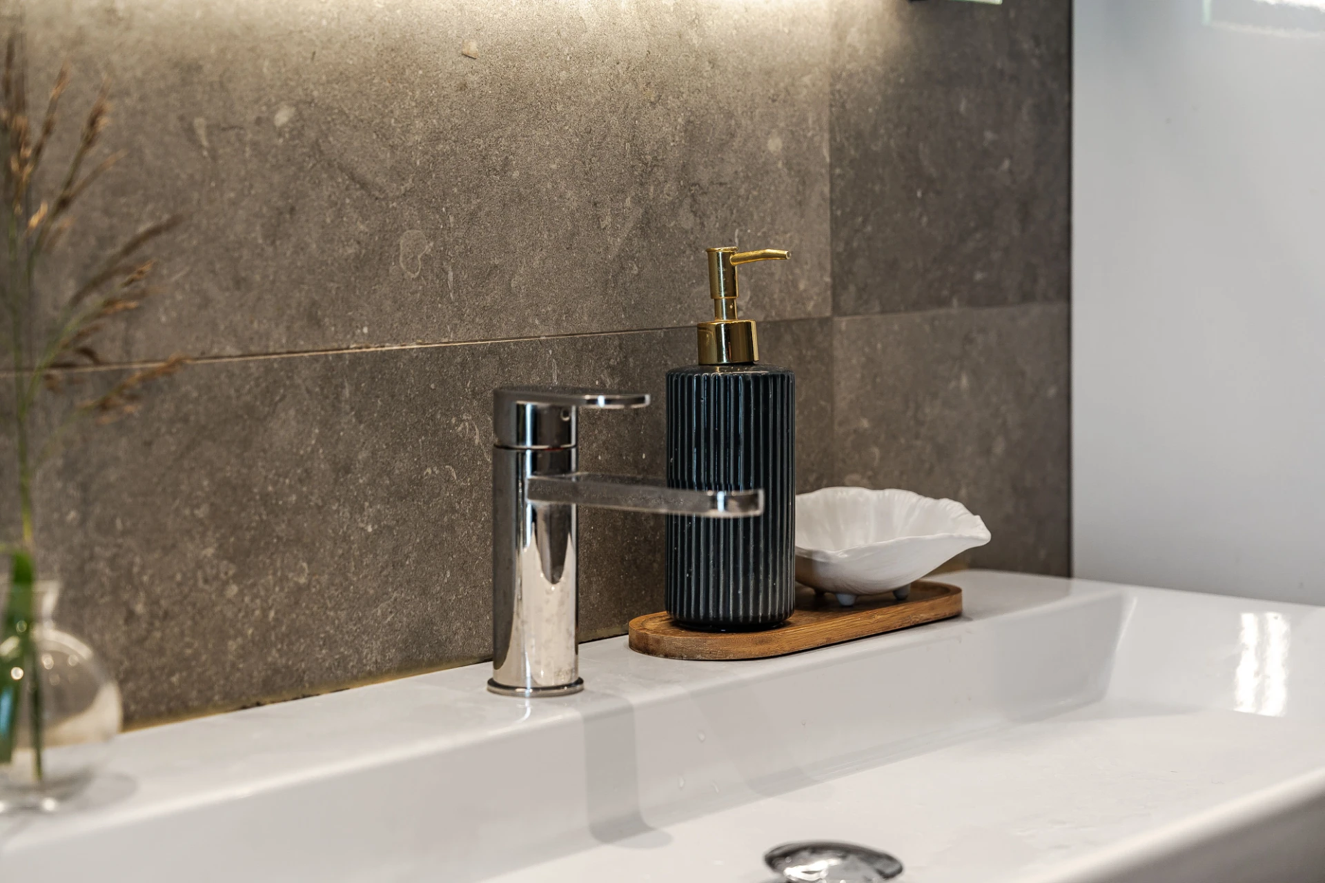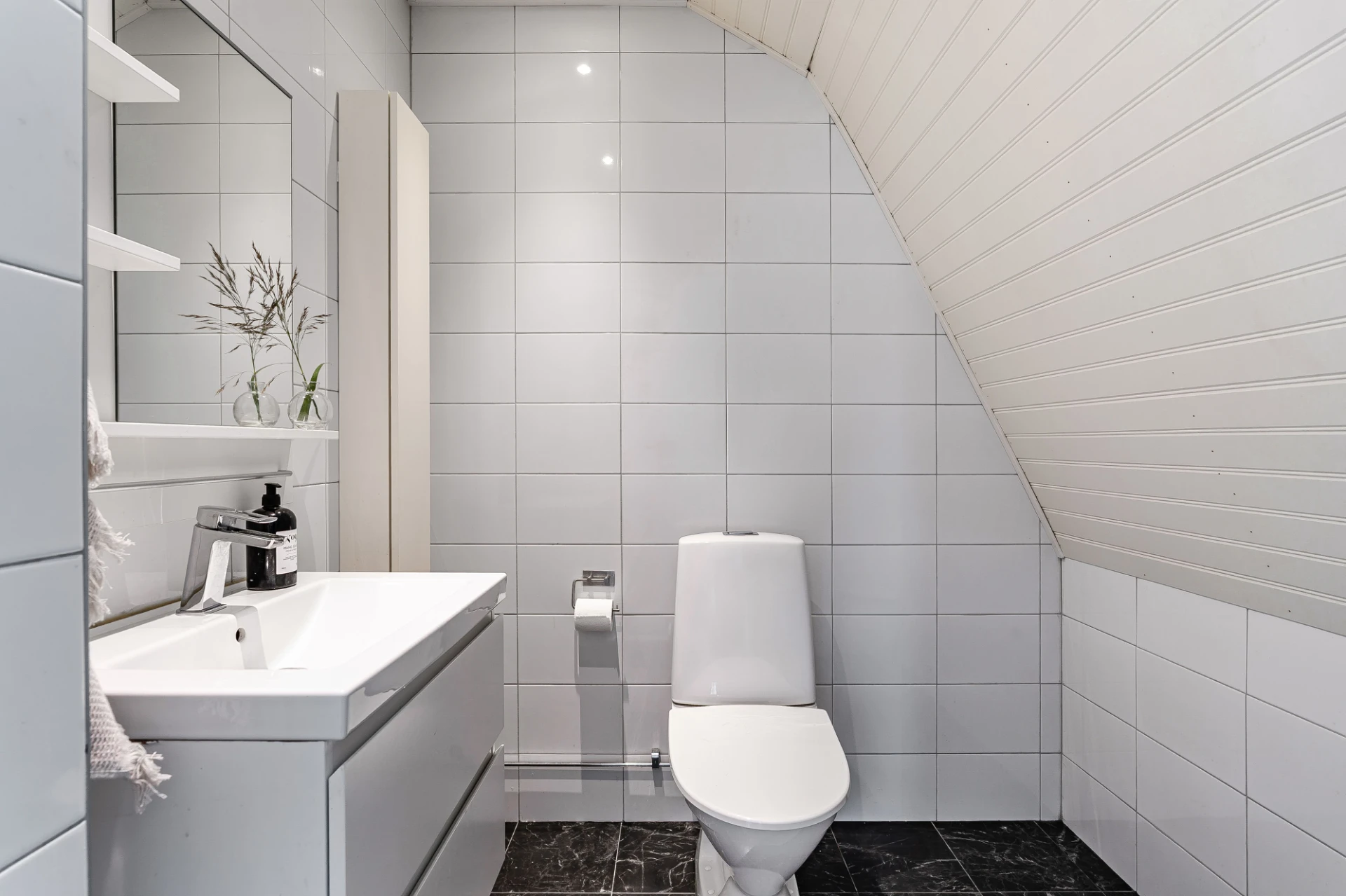 Klinkergolv och helkaklade väggar. Spotlights i tak. Toaletten är utrustad med wc, handfat med kommod, vägghängd spegel samt vägghängd förvaring.