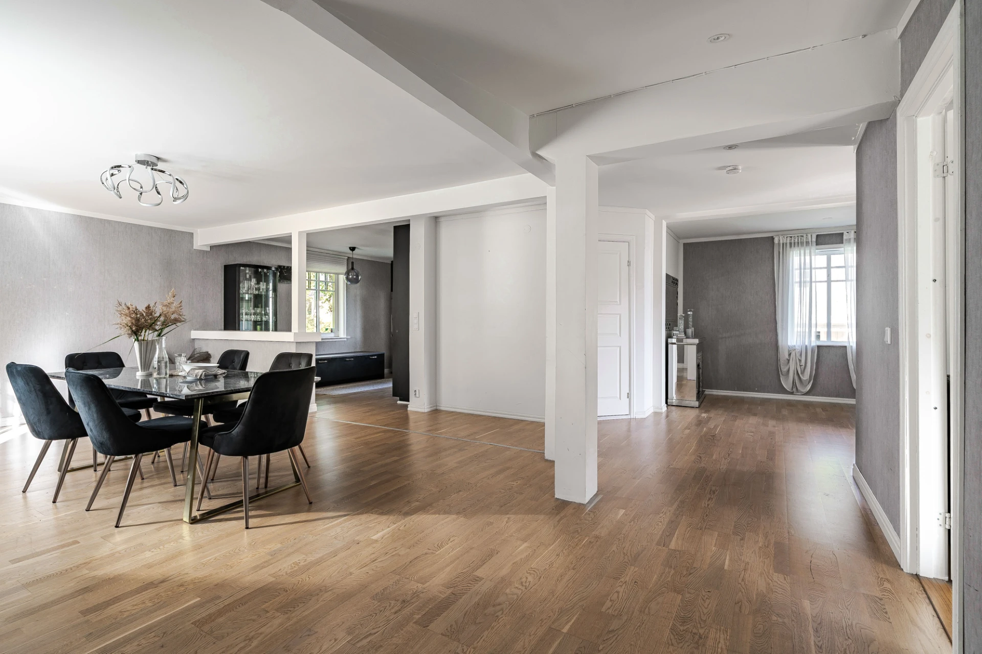 Parkettgolv och ljusgrå väggar. Här finns plats för soffa med tillhörande möblemang samt matbord.