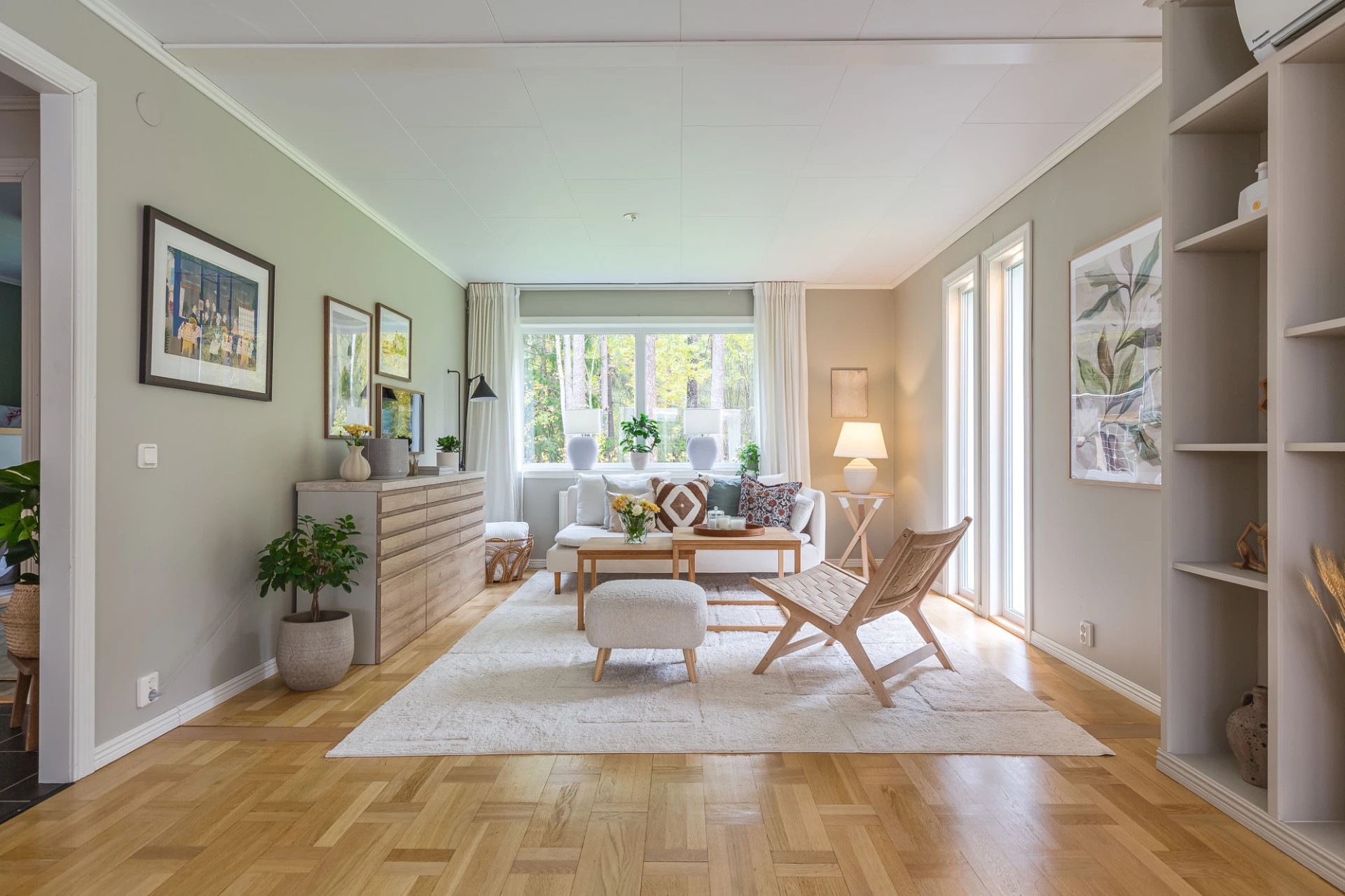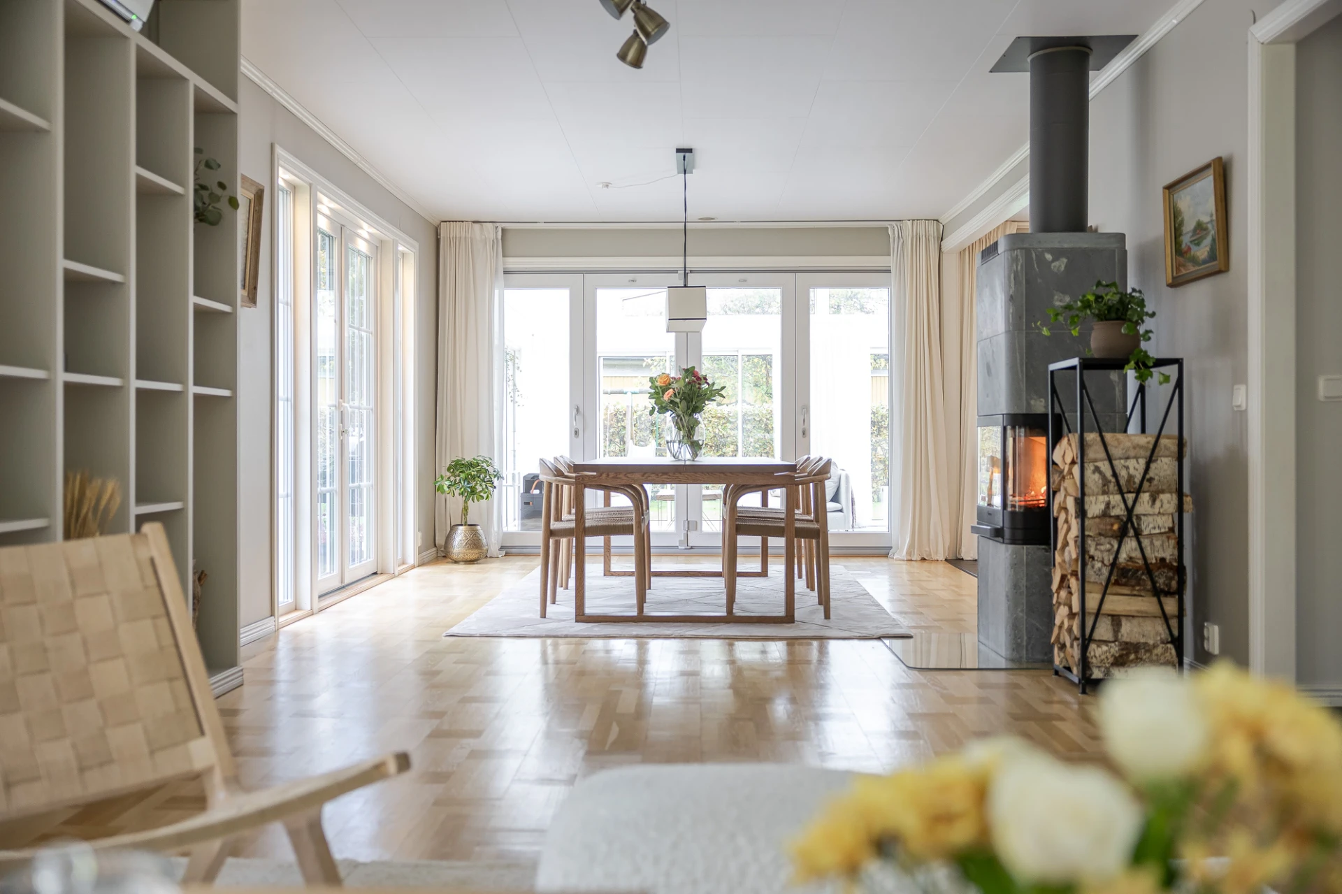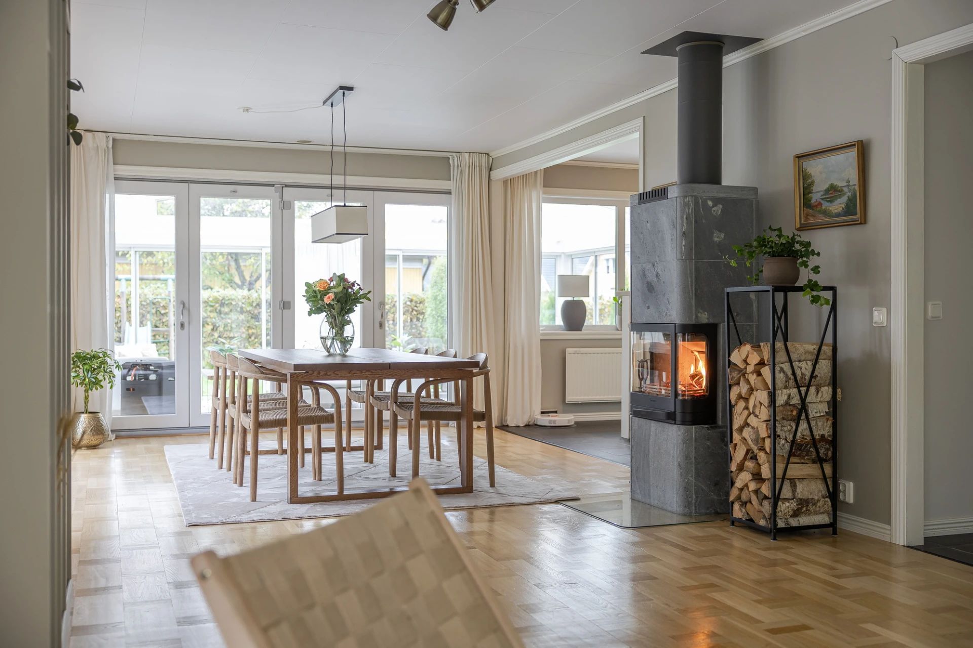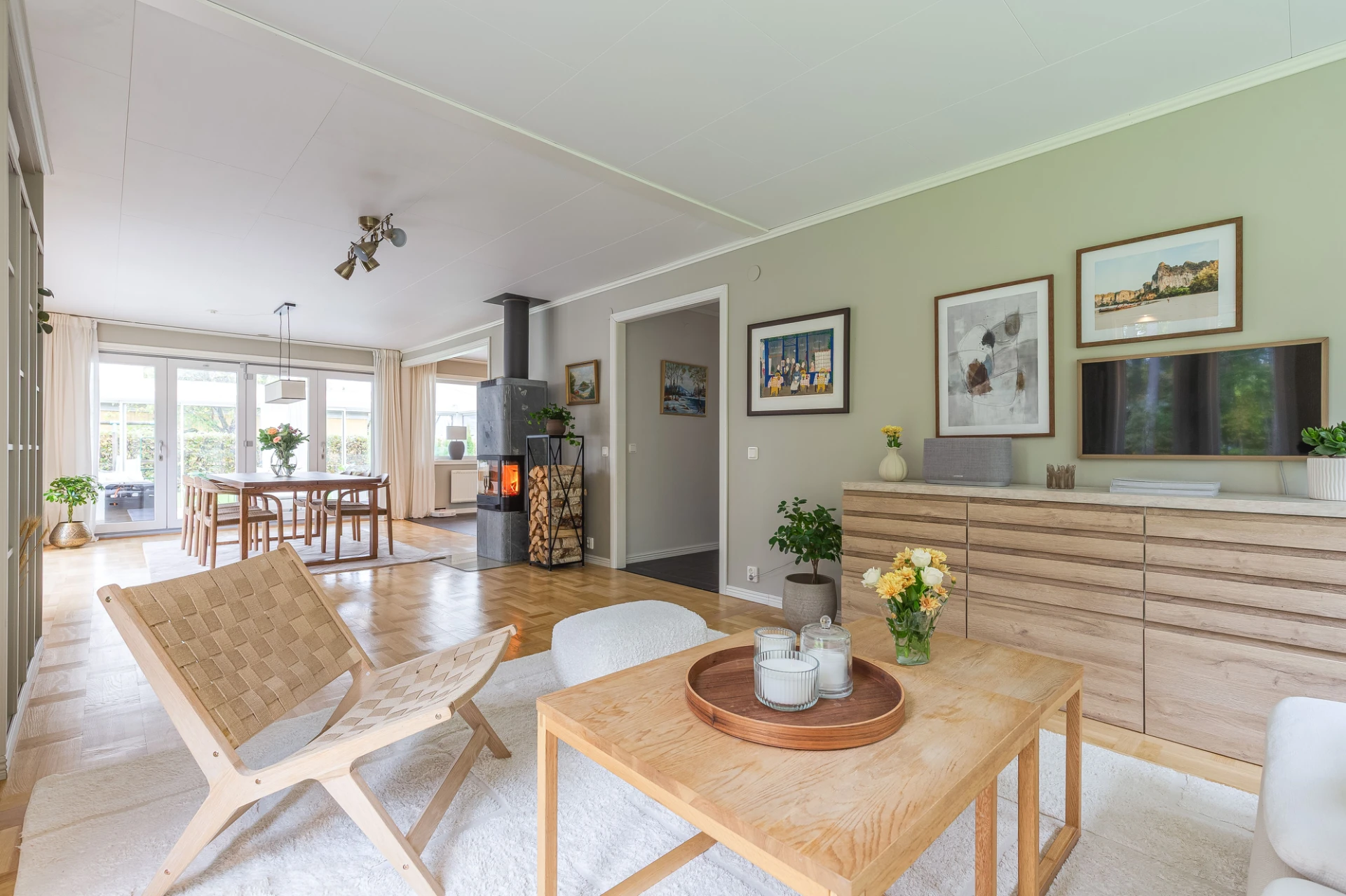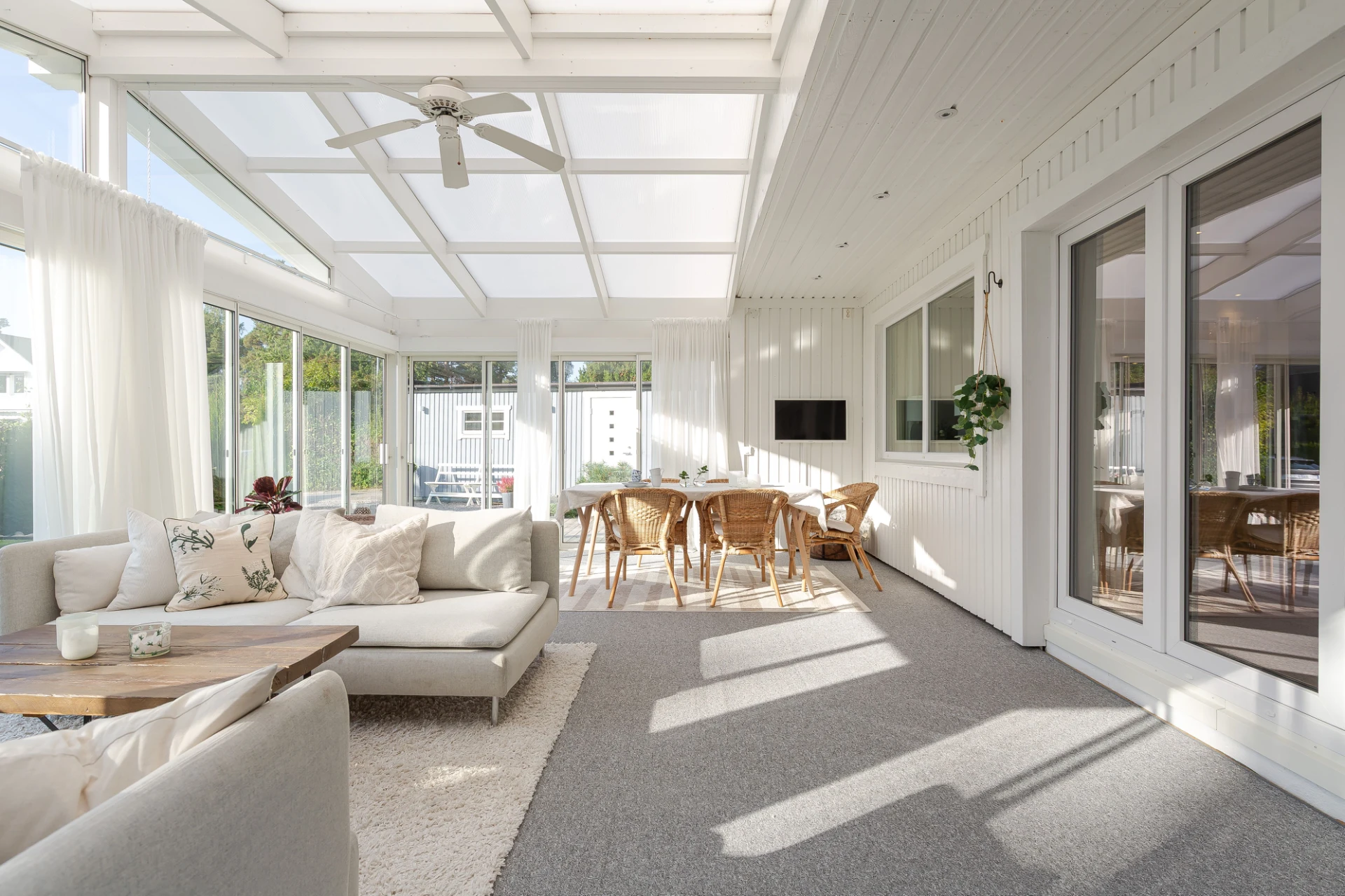 Parkettgolv och väggar i en beige nyans. Täljstenskamin. Här finns plats för soffgrupp med tillhörande möblemang och matplats för 6-8 personer. Rummet kan delas av för att skapa ytterligare ett sovrum. Från vardagsrummet nås det inglasade uterummet i västerläge med plats för loungegrupp och större matplats. Skjutbara glaspartier med utgång till altan i sydvästläge.