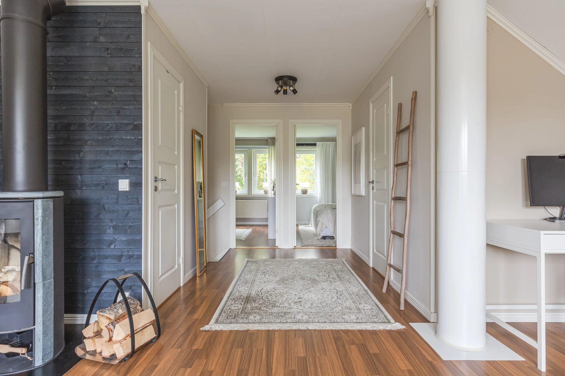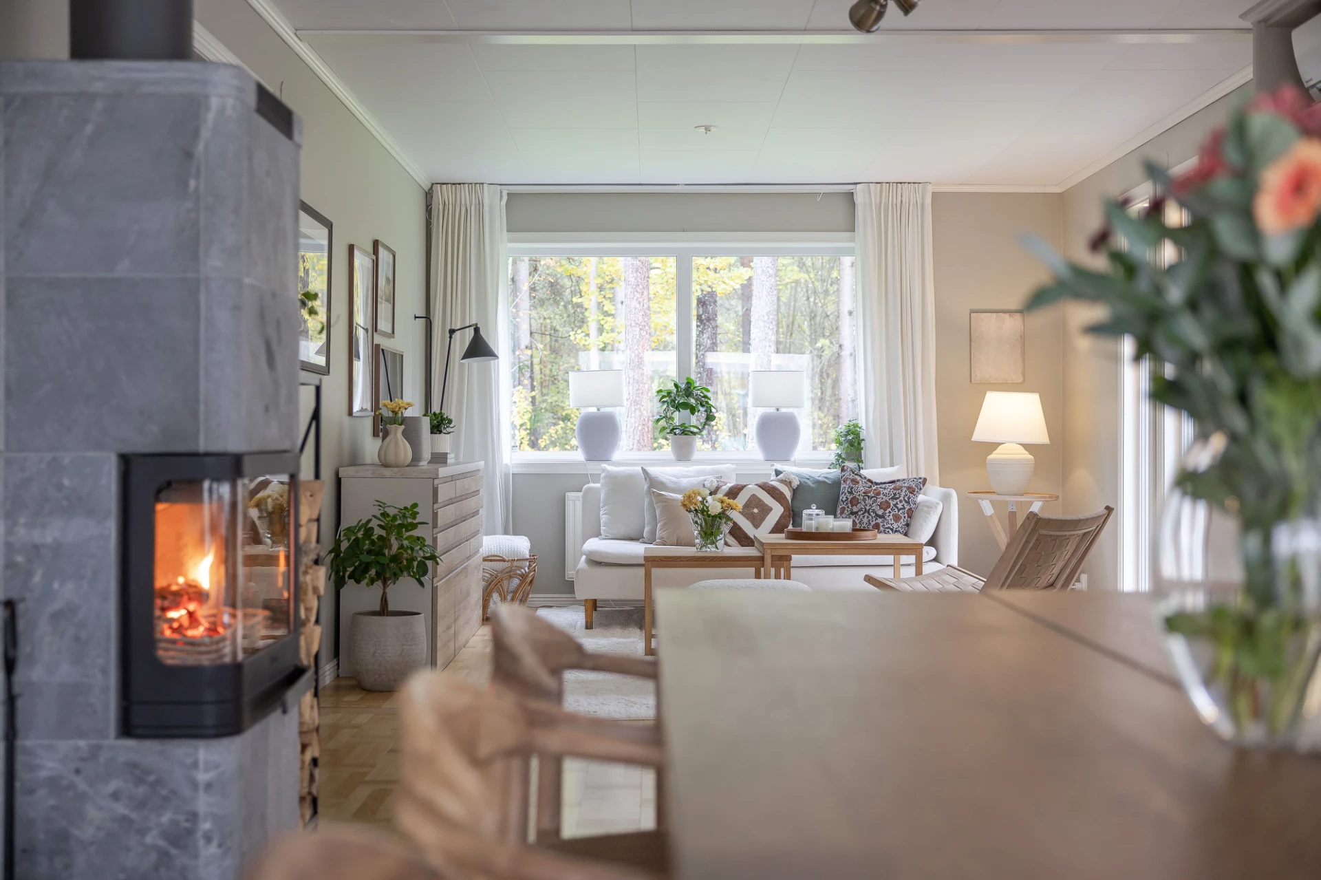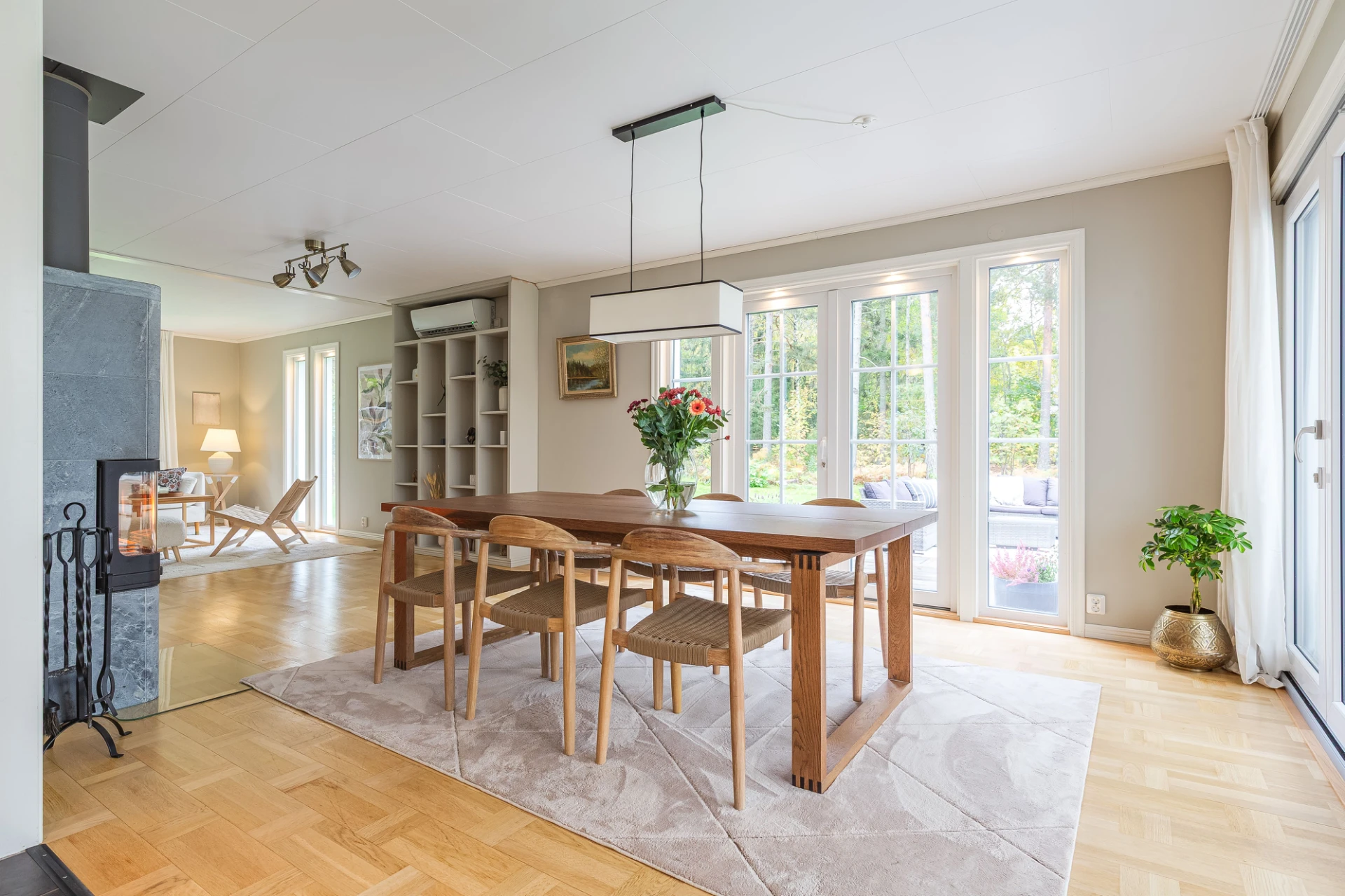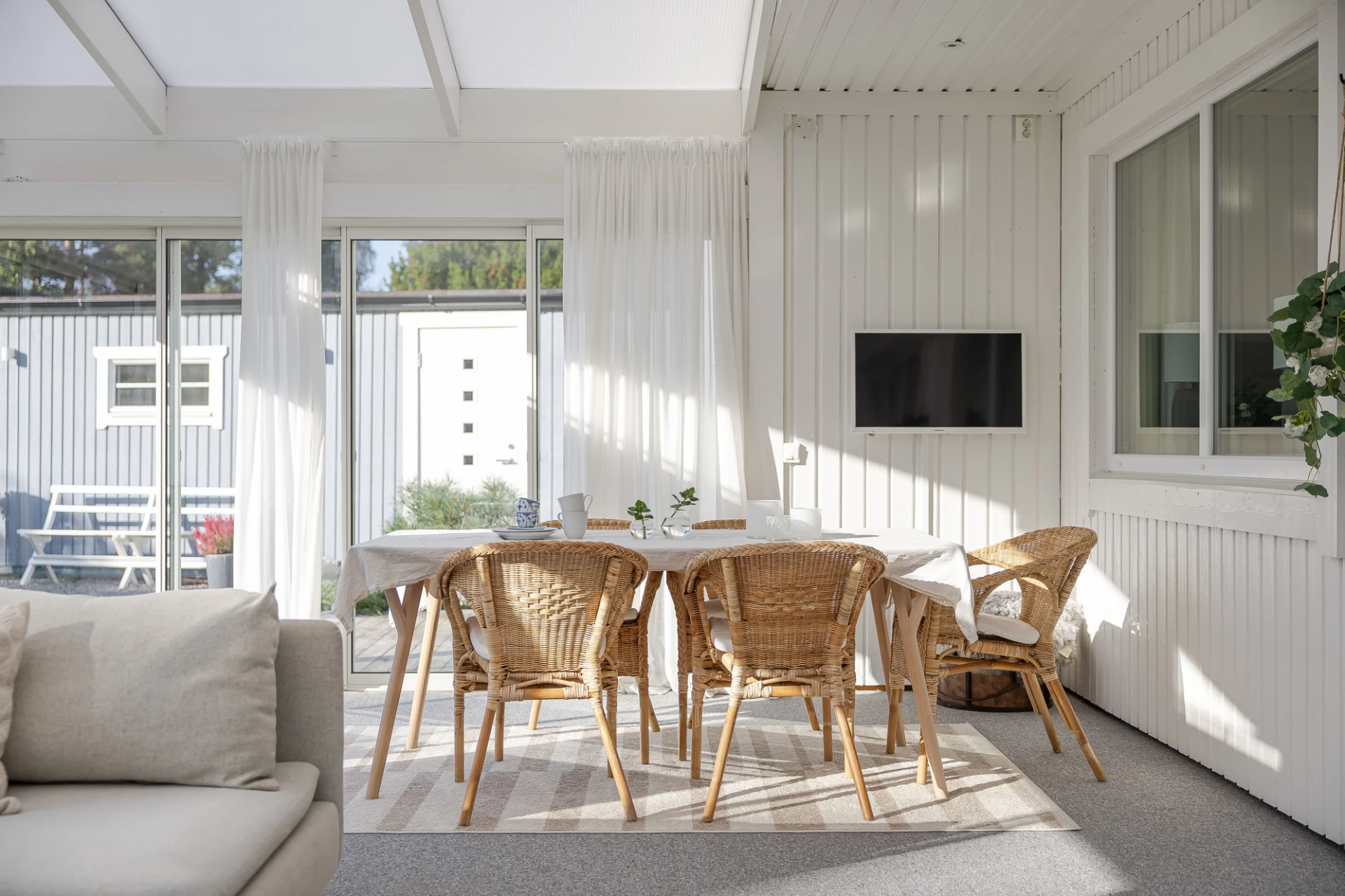 Parkettgolv och väggar i en beige nyans. Täljstenskamin. Här finns plats för soffgrupp med tillhörande möblemang och matplats för 6-8 personer. Rummet kan delas av för att skapa ytterligare ett sovrum. Från vardagsrummet nås det inglasade uterummet i västerläge med plats för loungegrupp och större matplats. Skjutbara glaspartier med utgång till altan i sydvästläge.