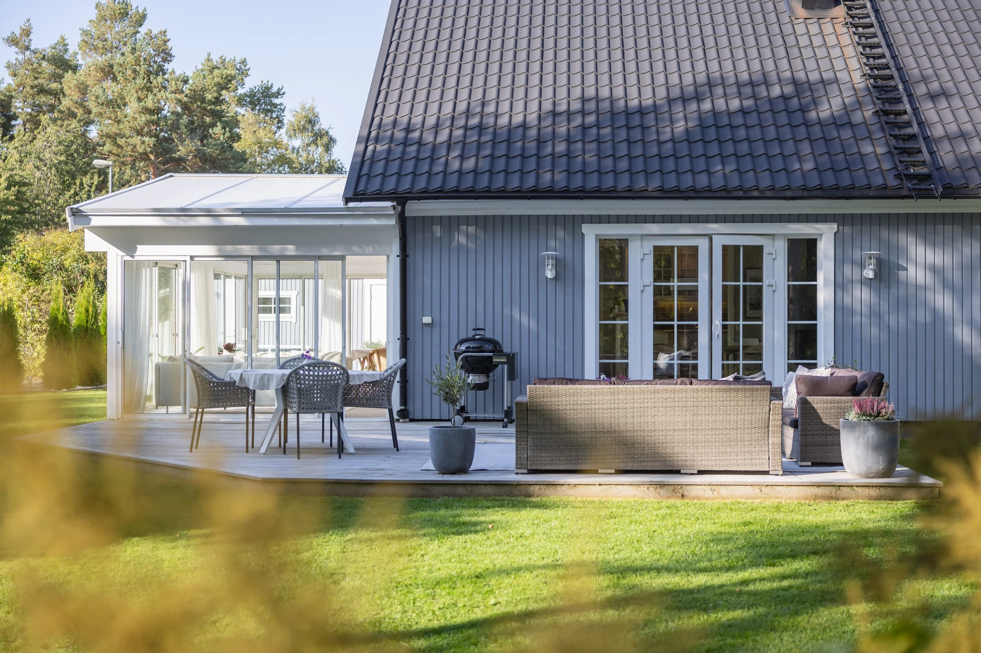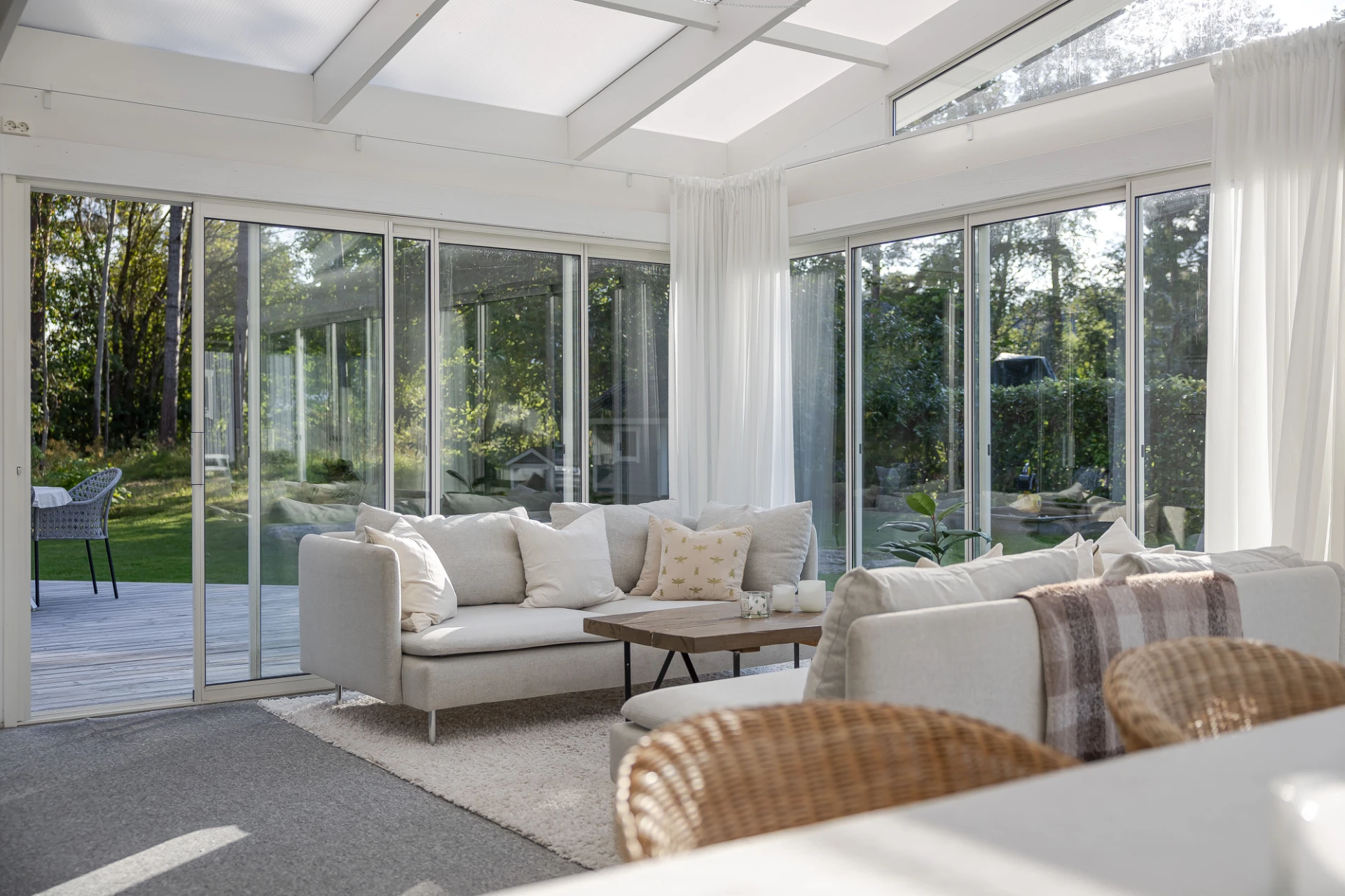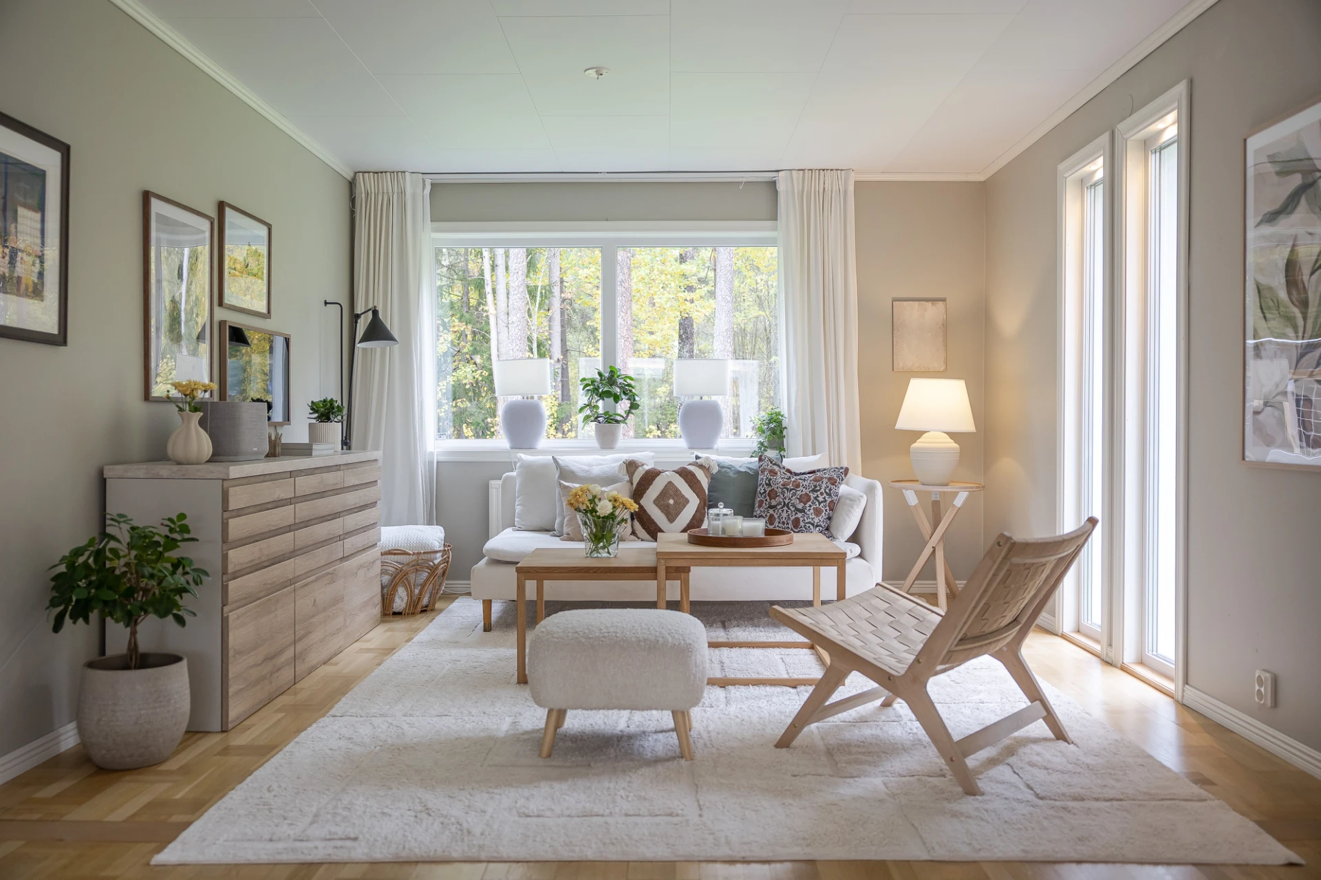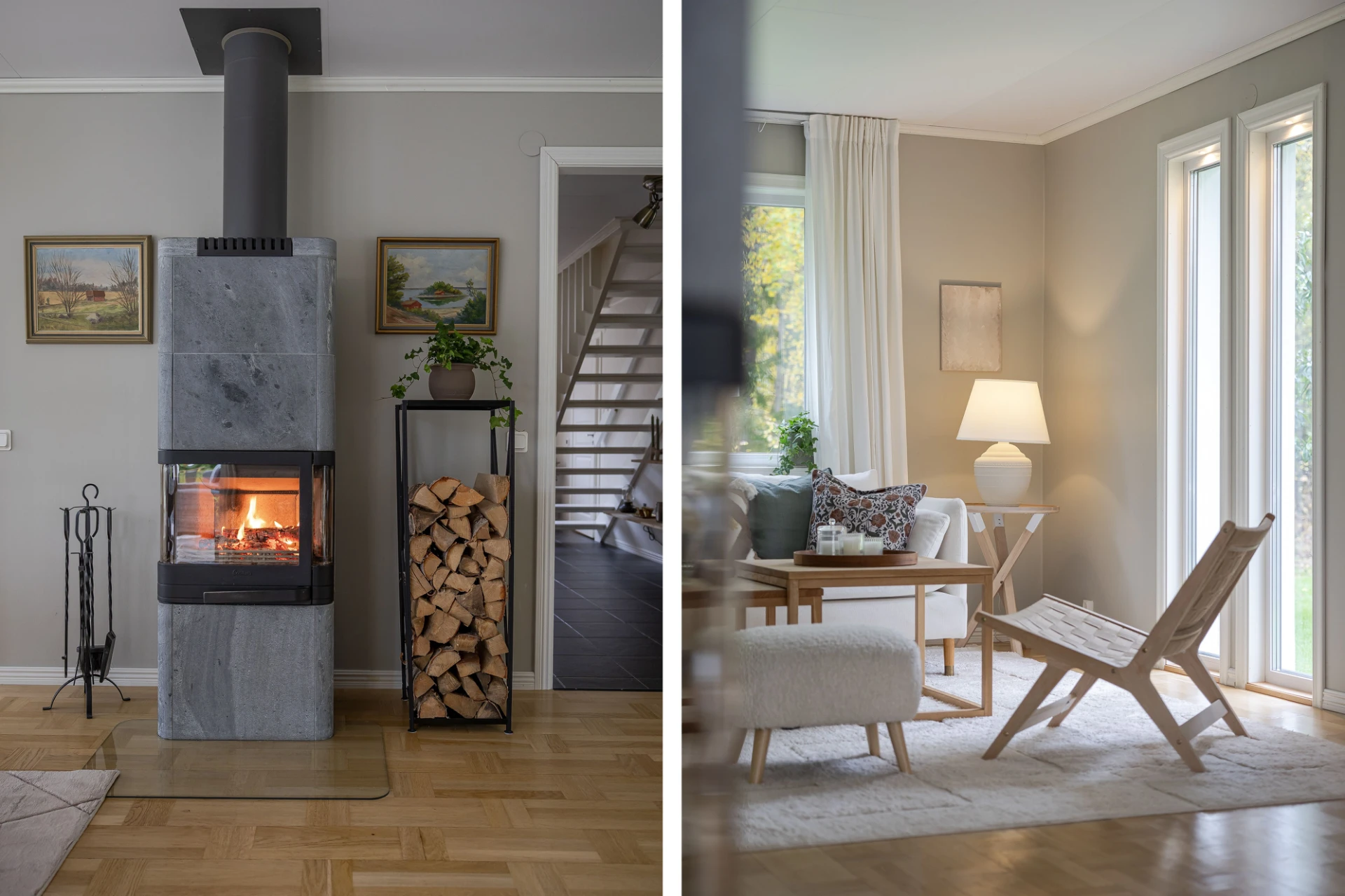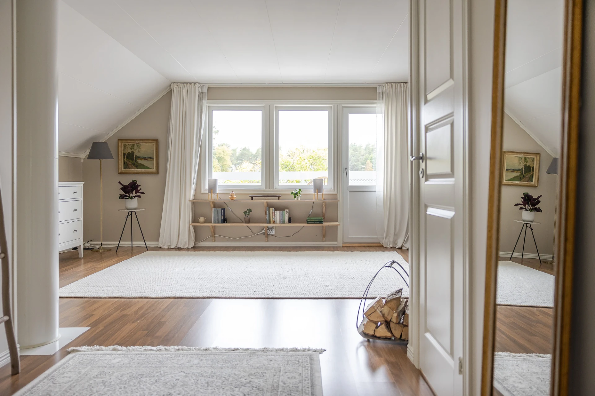 Parkettgolv och väggar i en beige nyans. Täljstenskamin. Här finns plats för soffgrupp med tillhörande möblemang och matplats för 6-8 personer. Rummet kan delas av för att skapa ytterligare ett sovrum. Från vardagsrummet nås det inglasade uterummet i västerläge med plats för loungegrupp och större matplats. Skjutbara glaspartier med utgång till altan i sydvästläge.