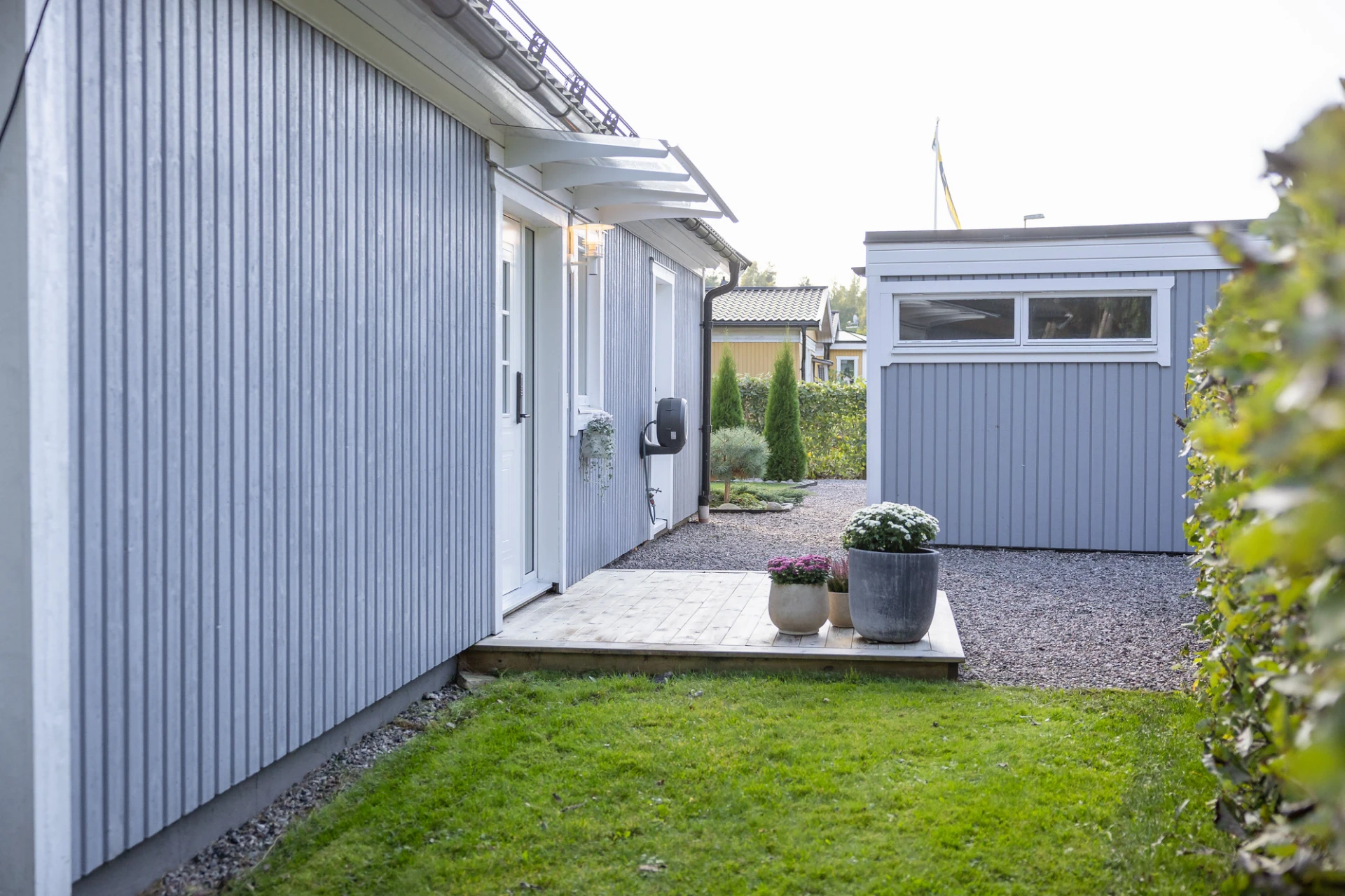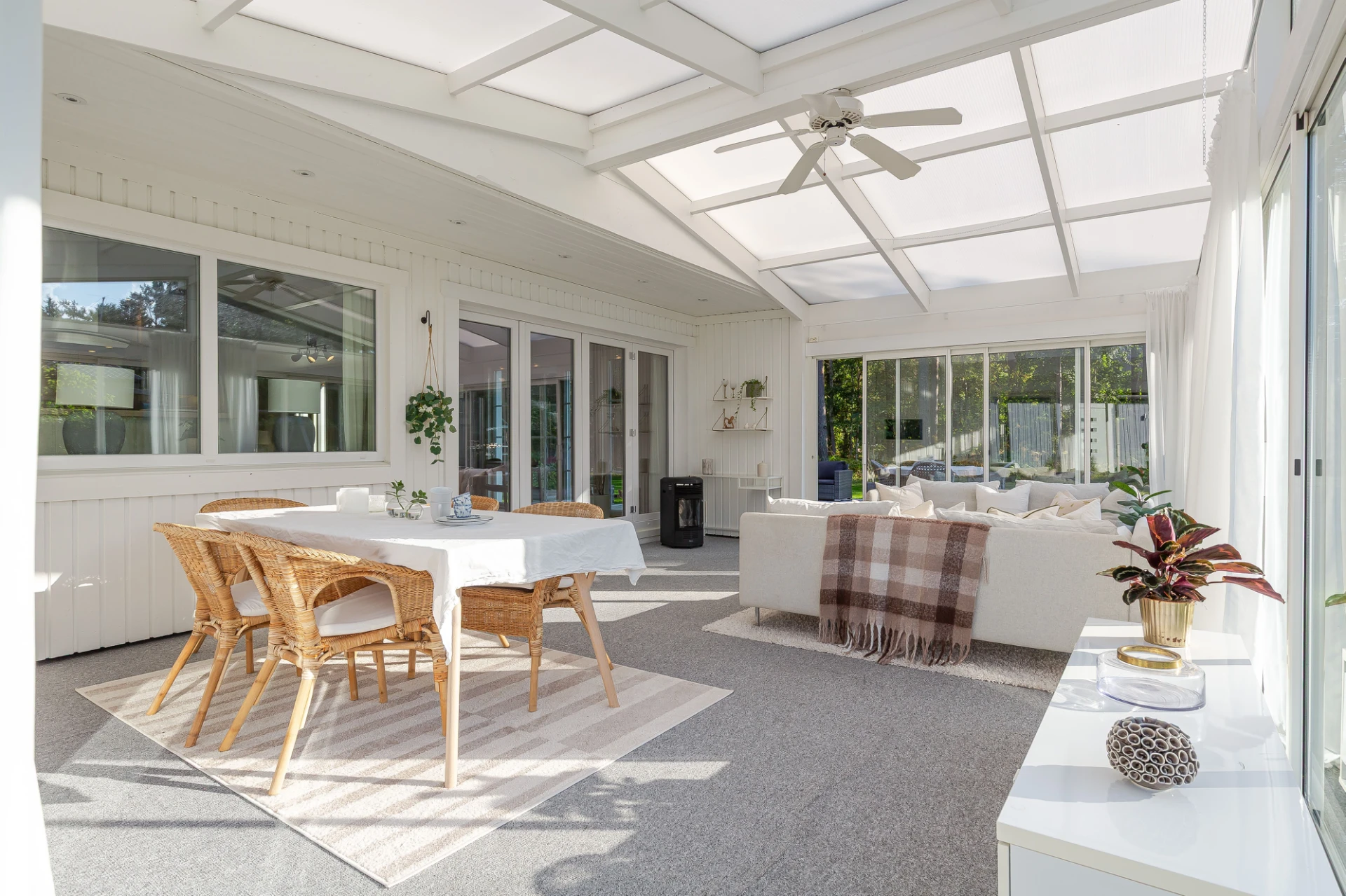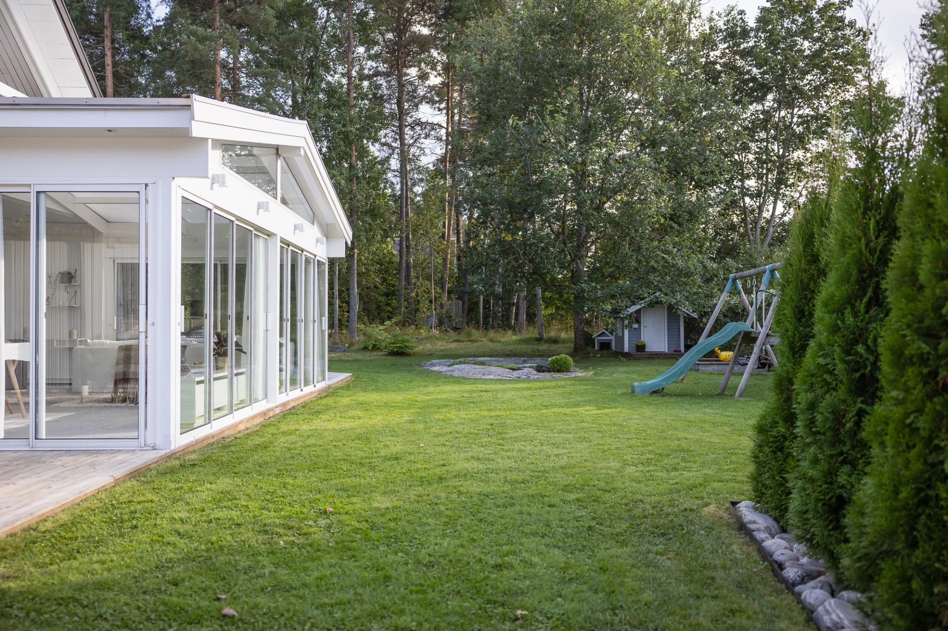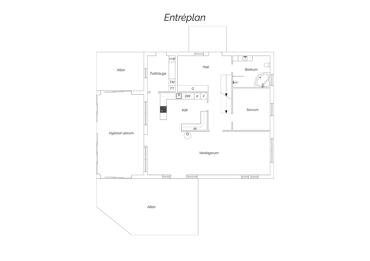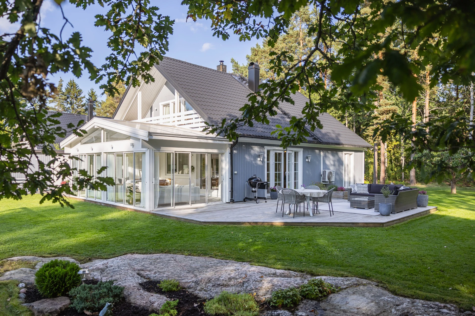 Parkettgolv och väggar i en beige nyans. Täljstenskamin. Här finns plats för soffgrupp med tillhörande möblemang och matplats för 6-8 personer. Rummet kan delas av för att skapa ytterligare ett sovrum. Från vardagsrummet nås det inglasade uterummet i västerläge med plats för loungegrupp och större matplats. Skjutbara glaspartier med utgång till altan i sydvästläge.