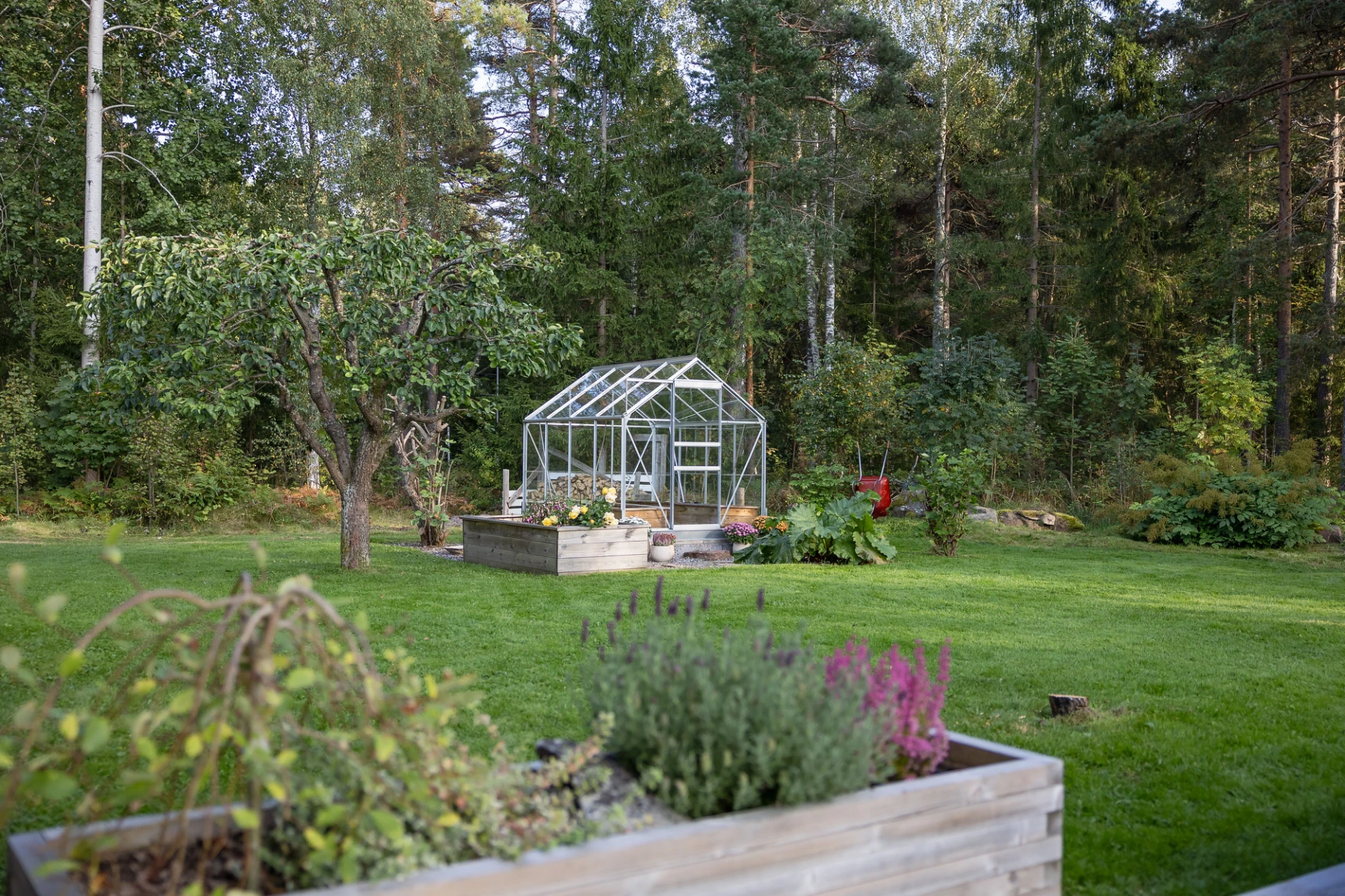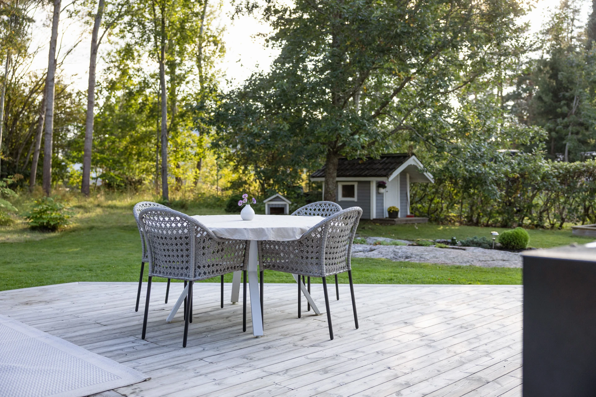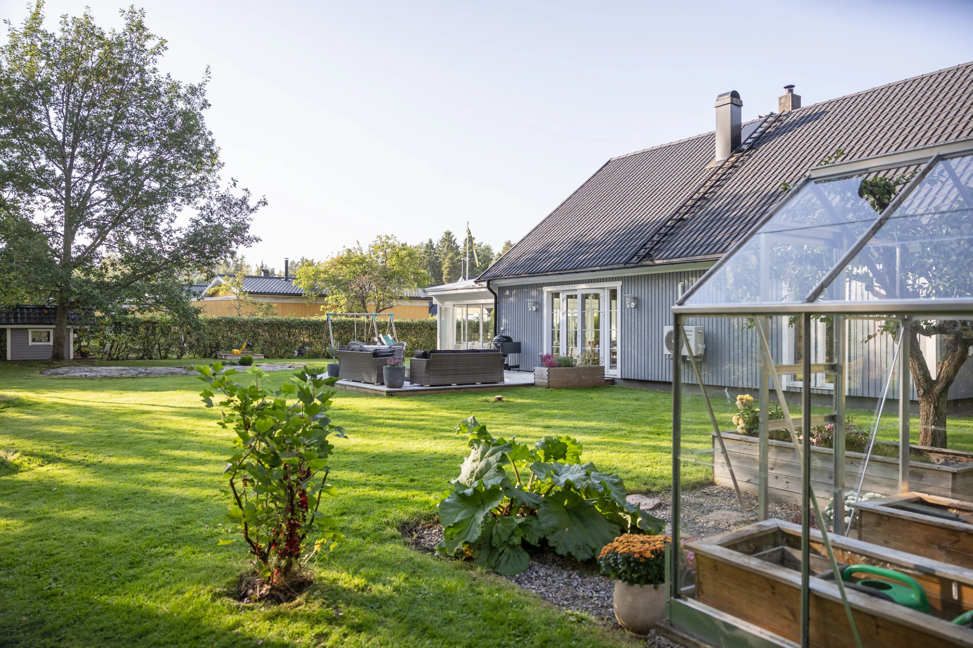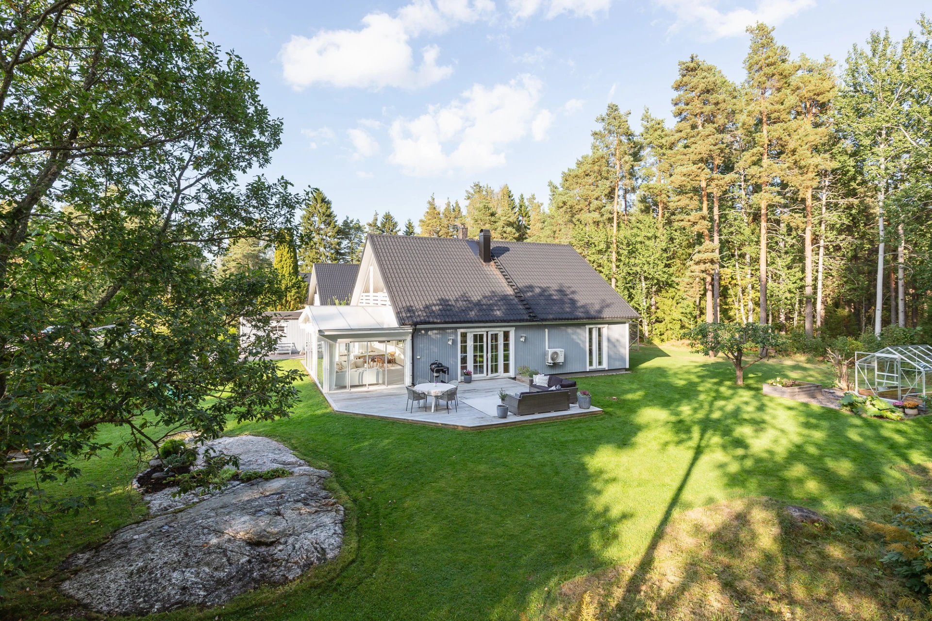 Parkettgolv och väggar i en beige nyans. Täljstenskamin. Här finns plats för soffgrupp med tillhörande möblemang och matplats för 6-8 personer. Rummet kan delas av för att skapa ytterligare ett sovrum. Från vardagsrummet nås det inglasade uterummet i västerläge med plats för loungegrupp och större matplats. Skjutbara glaspartier med utgång till altan i sydvästläge.