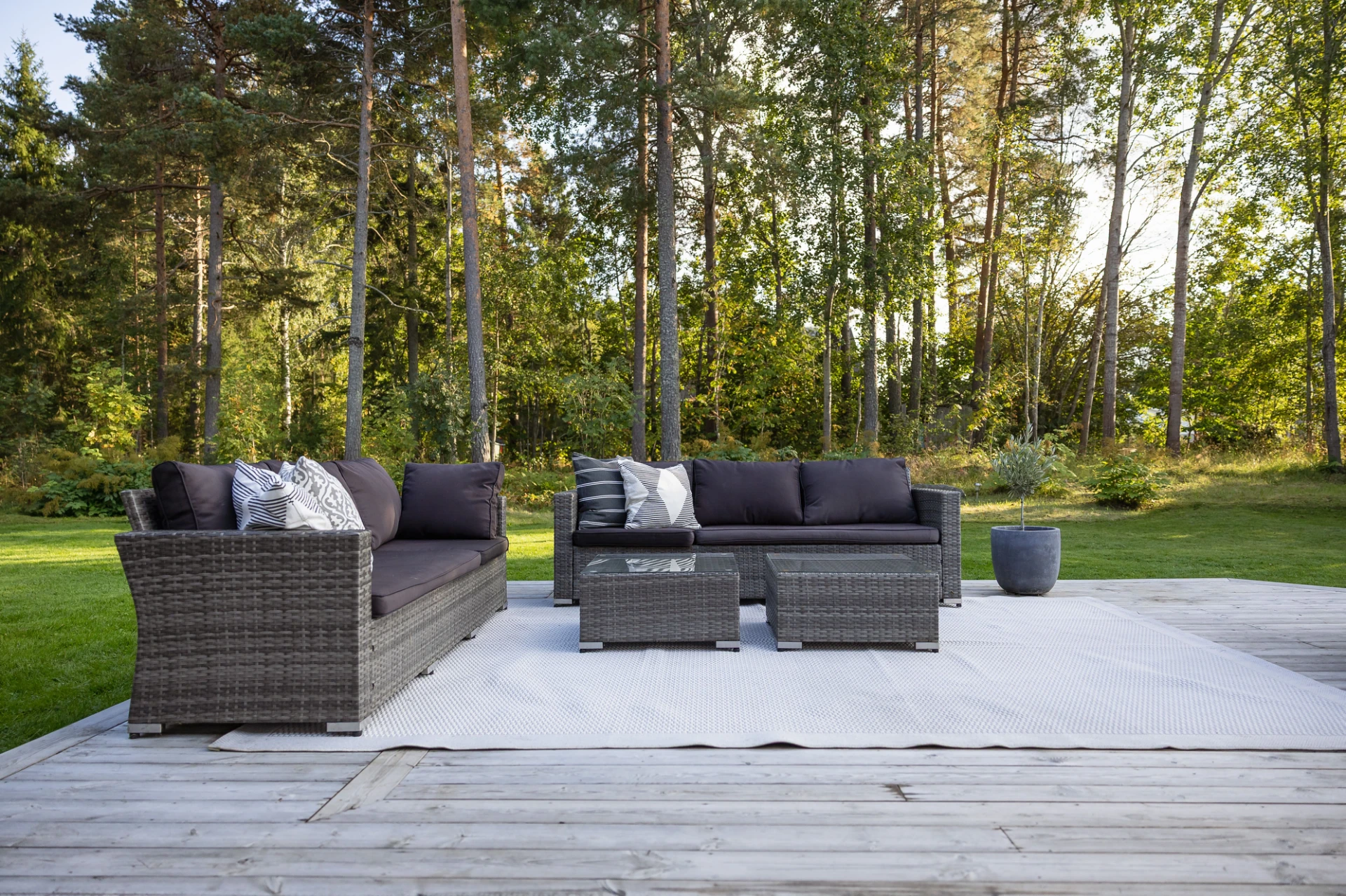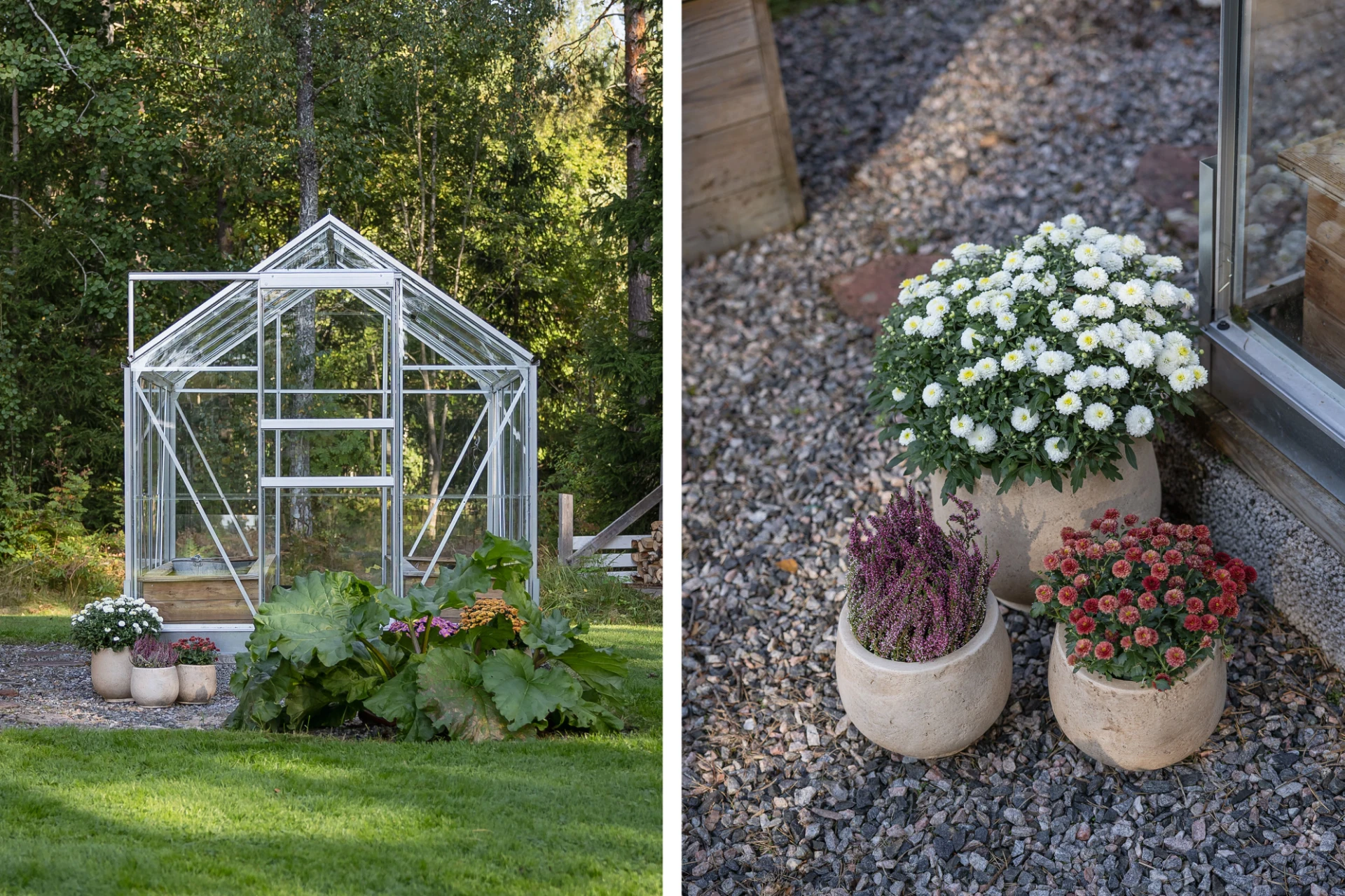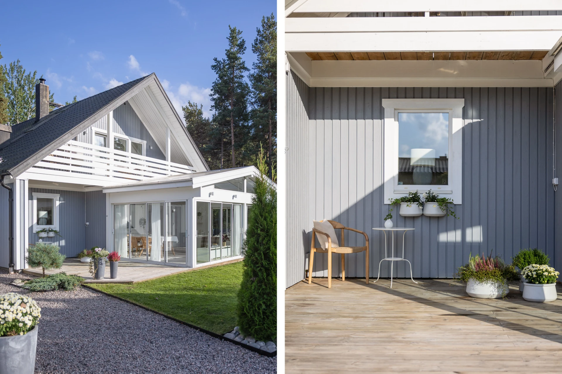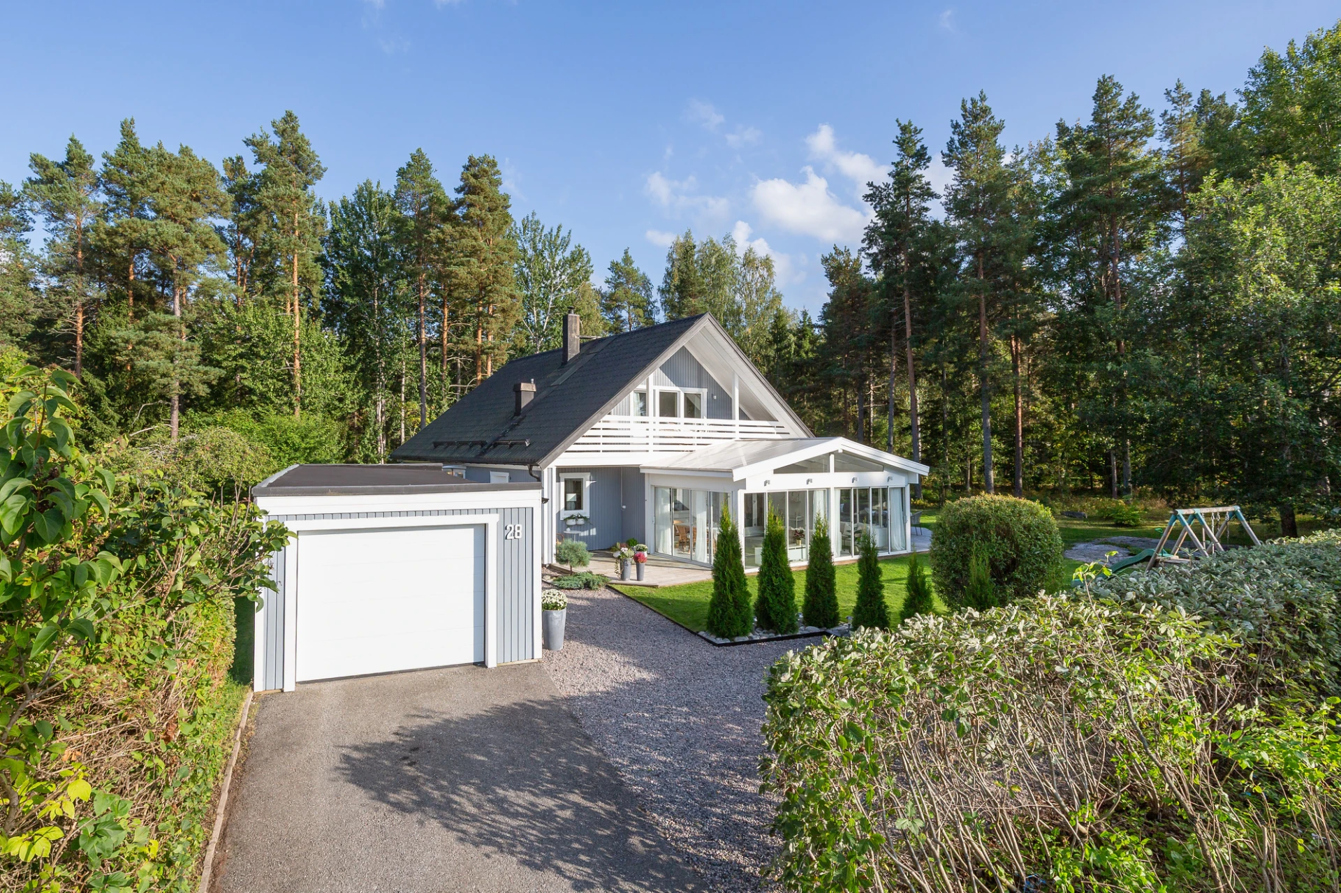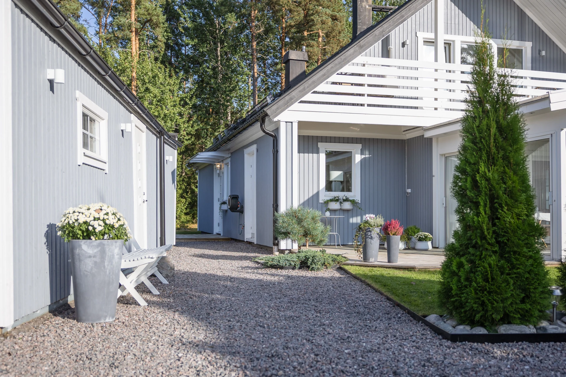 Parkettgolv och väggar i en beige nyans. Täljstenskamin. Här finns plats för soffgrupp med tillhörande möblemang och matplats för 6-8 personer. Rummet kan delas av för att skapa ytterligare ett sovrum. Från vardagsrummet nås det inglasade uterummet i västerläge med plats för loungegrupp och större matplats. Skjutbara glaspartier med utgång till altan i sydvästläge.