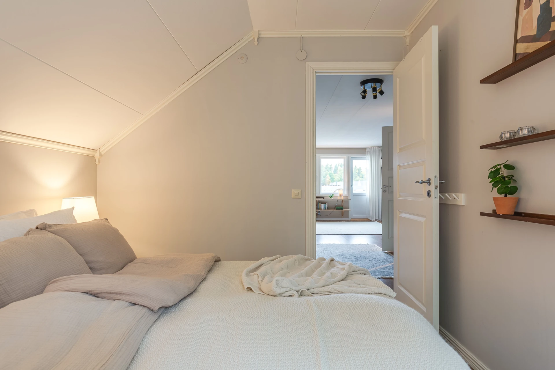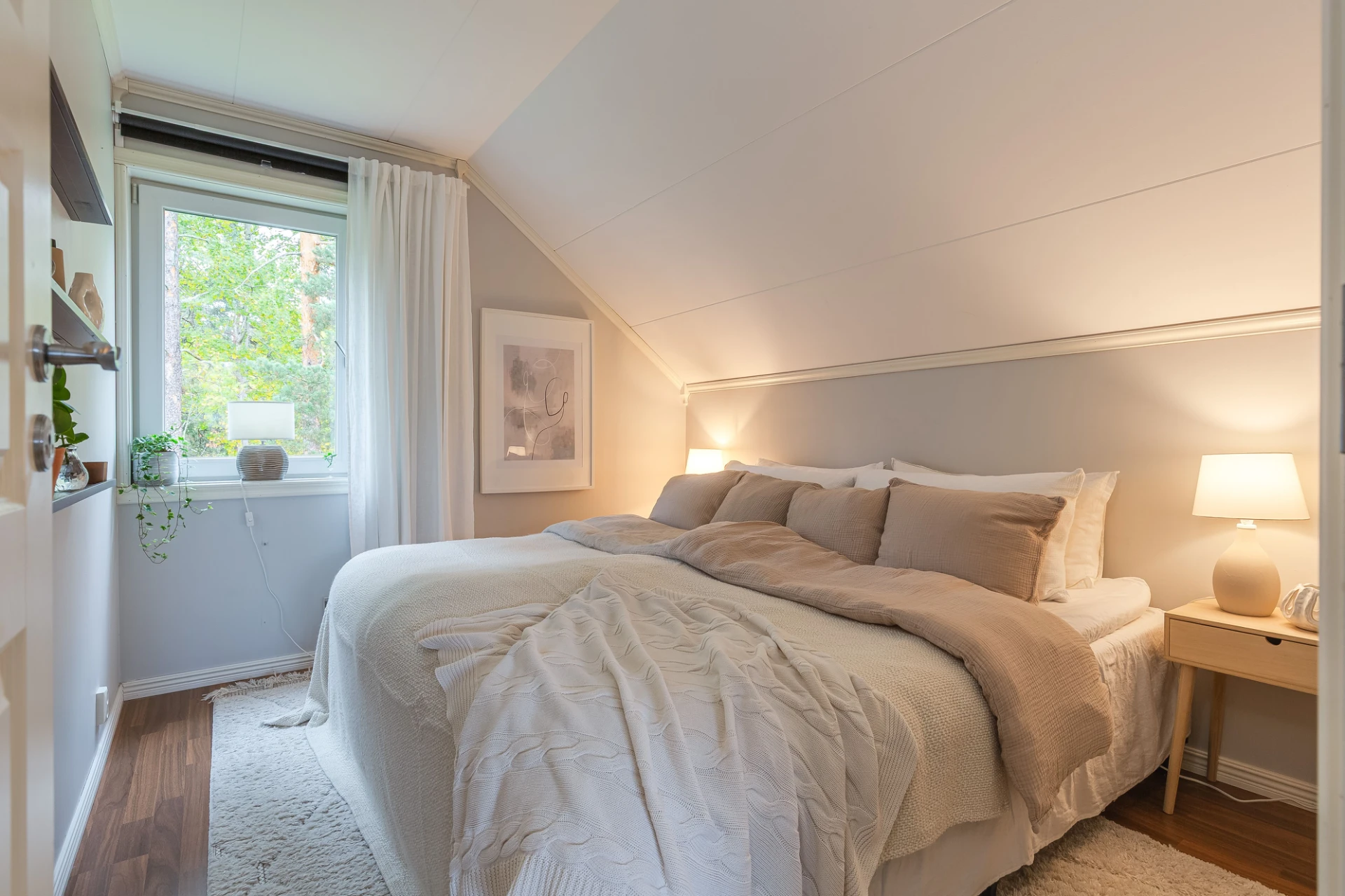 Parkettgolv och väggar i en beige nyans. Här finns plats för dubbelsäng med tillhörande möblemang.