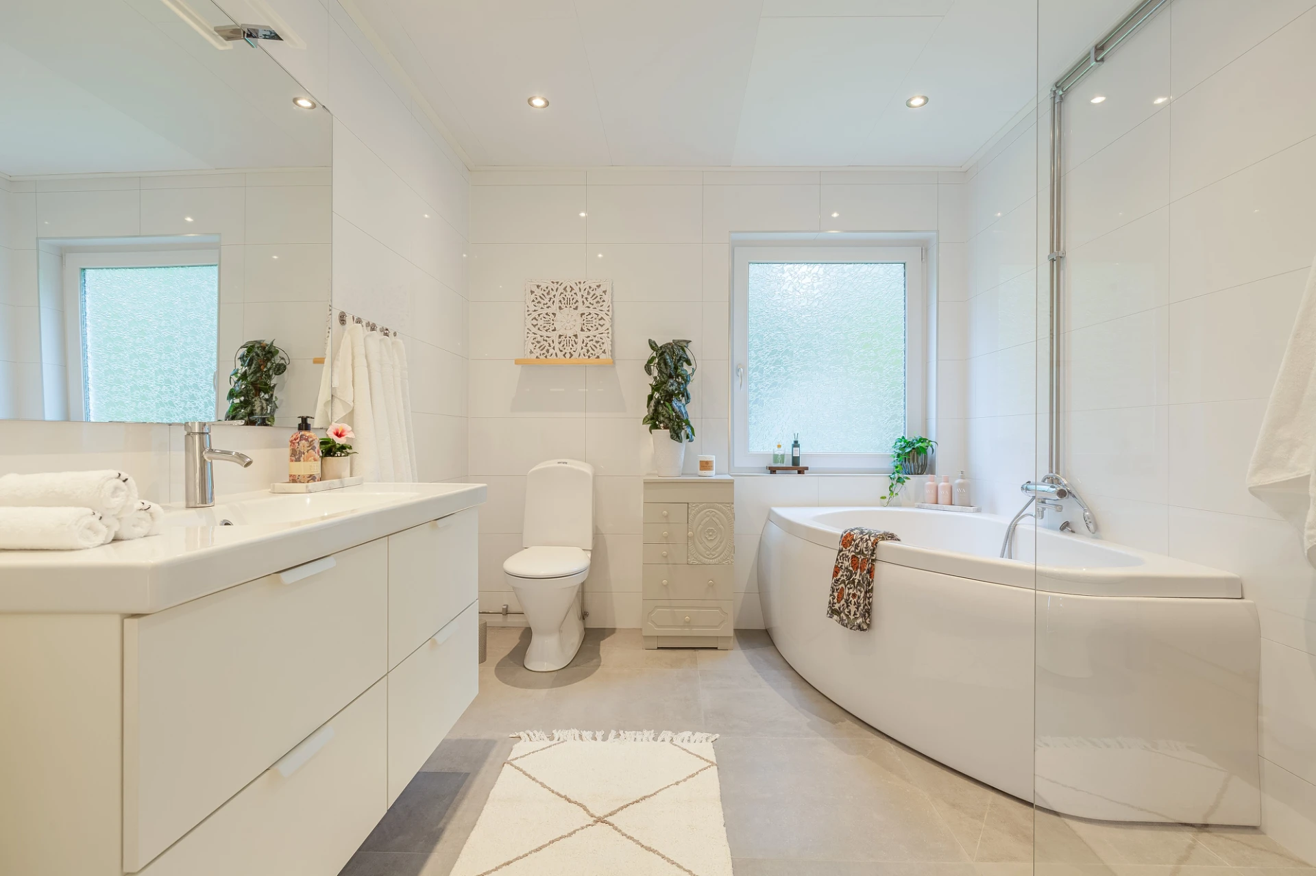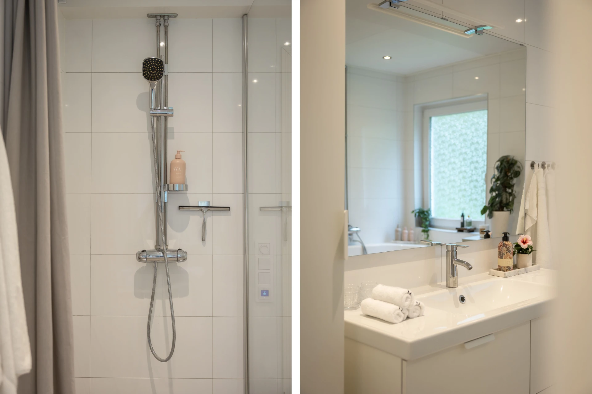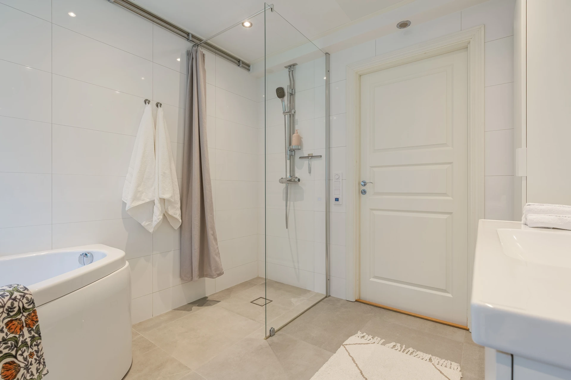 Grått klinkergolv med elburen golvvärme och helkaklade väggar i vitt. Spotlights i taket. Badrummet är utrustat med WC, handfat med kommod, dusch med glasvägg och hörnbadkar.