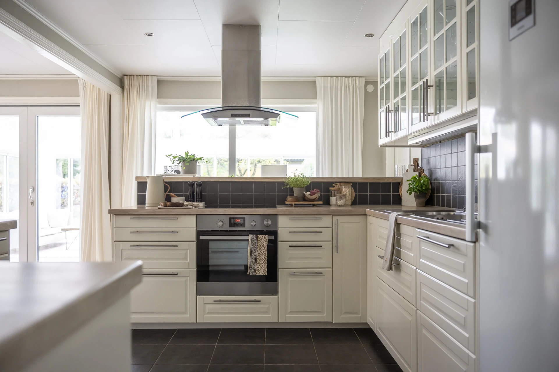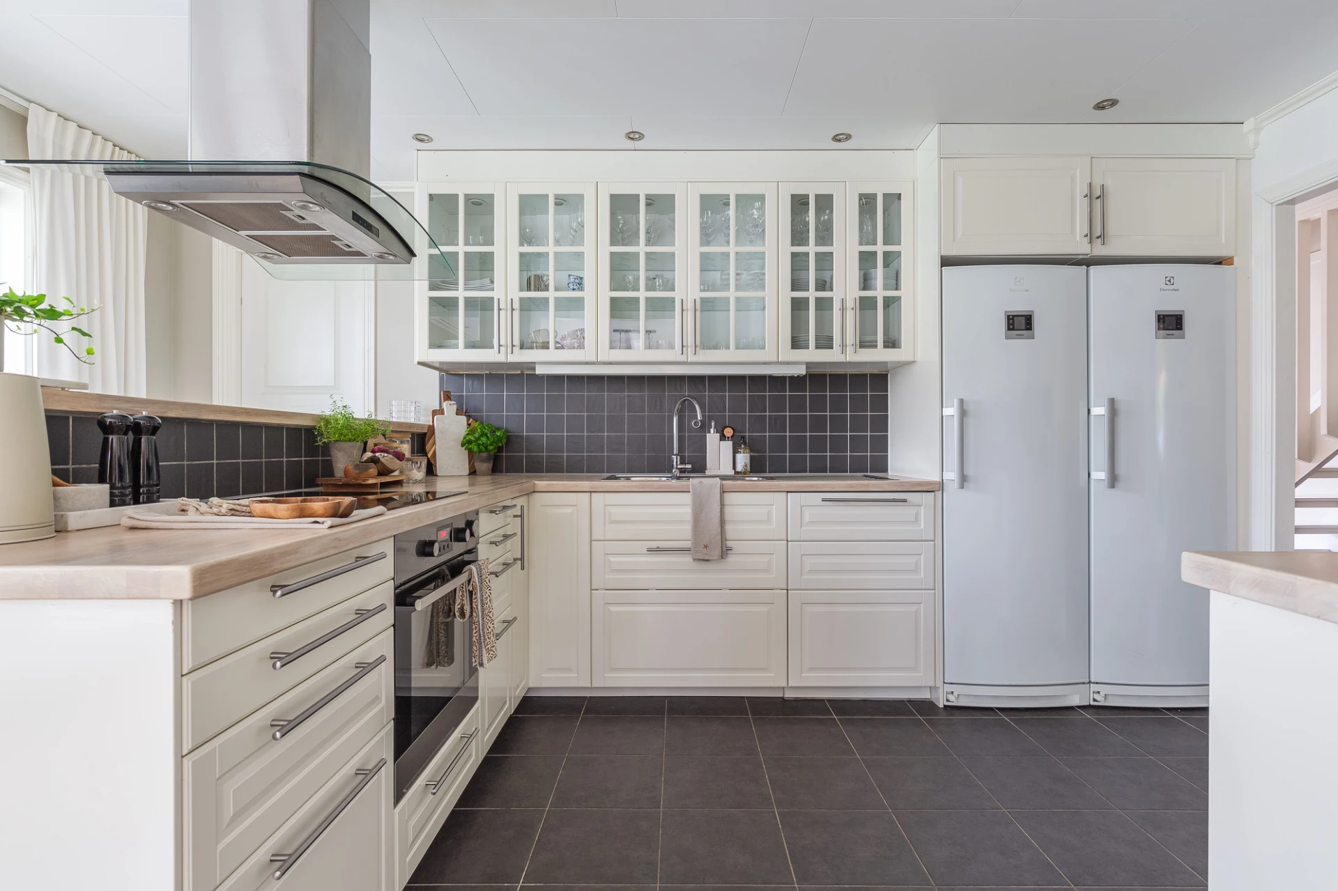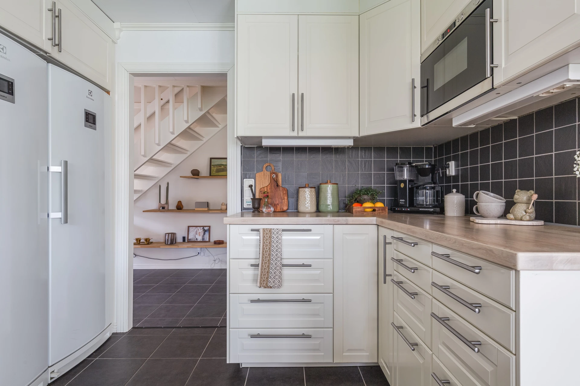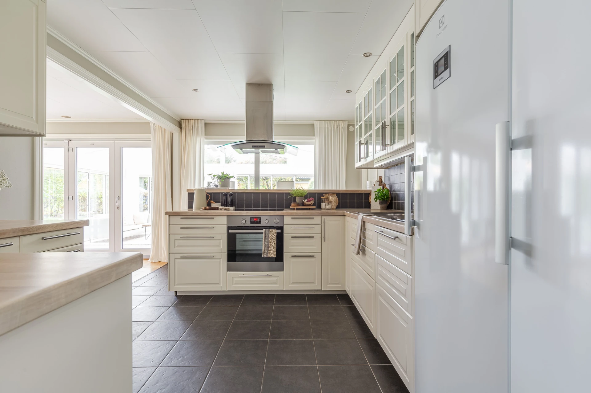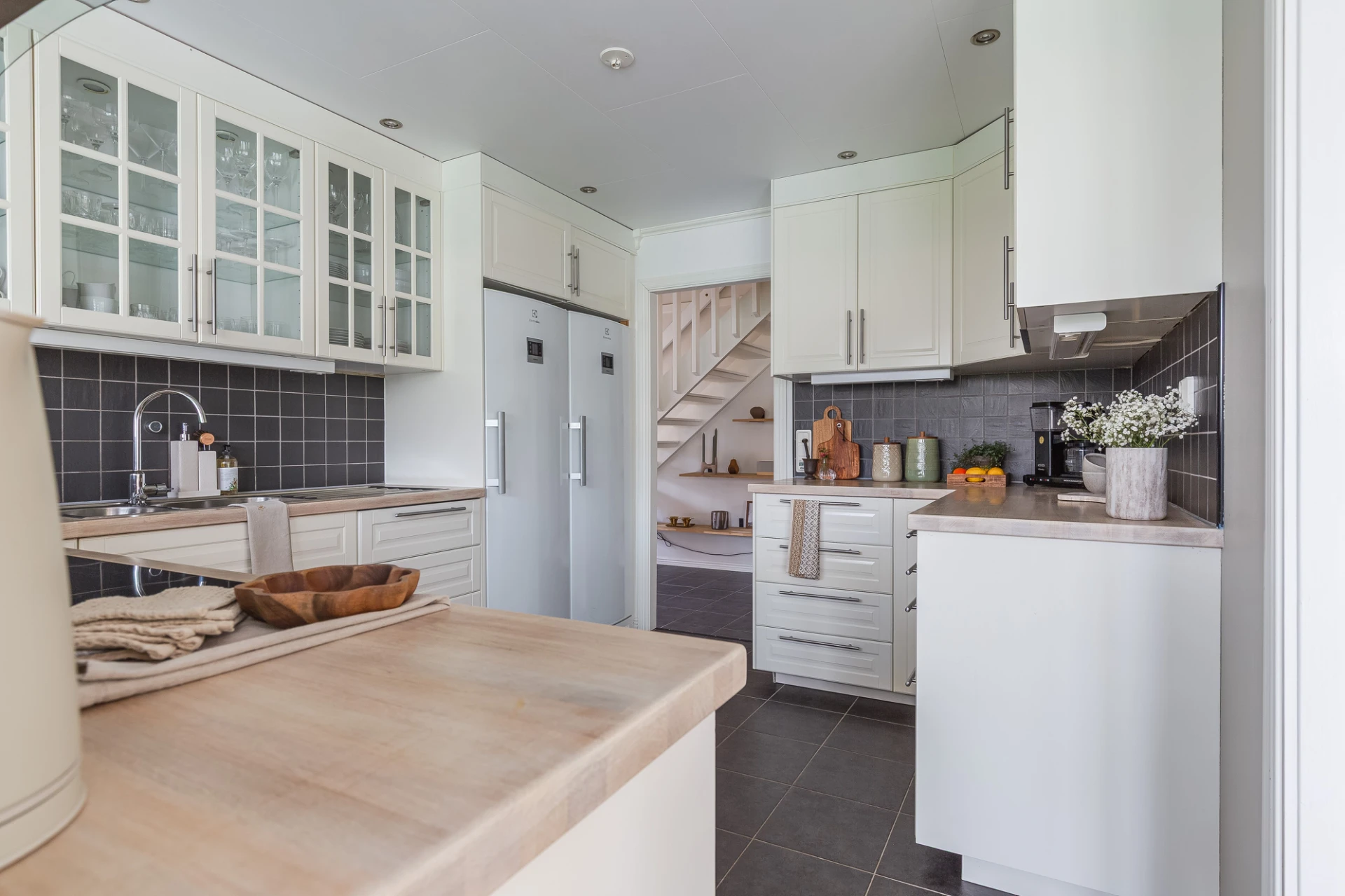 Mörkgrått klinkergolv med elburen golvvärme och väggar i en beige nyans. Spotlights i taket. Vita skåpsluckor och mörkgrått klinker ovan bänkskivan i träimitation. Den maskinella utrustningen består av spishäll, spisfläkt, inbyggd ugn, inbyggd mikrovågsugn, integrerad diskmaskin samt kyl och frys i fullhöjd. Öppen planlösning mot vardagsrum.