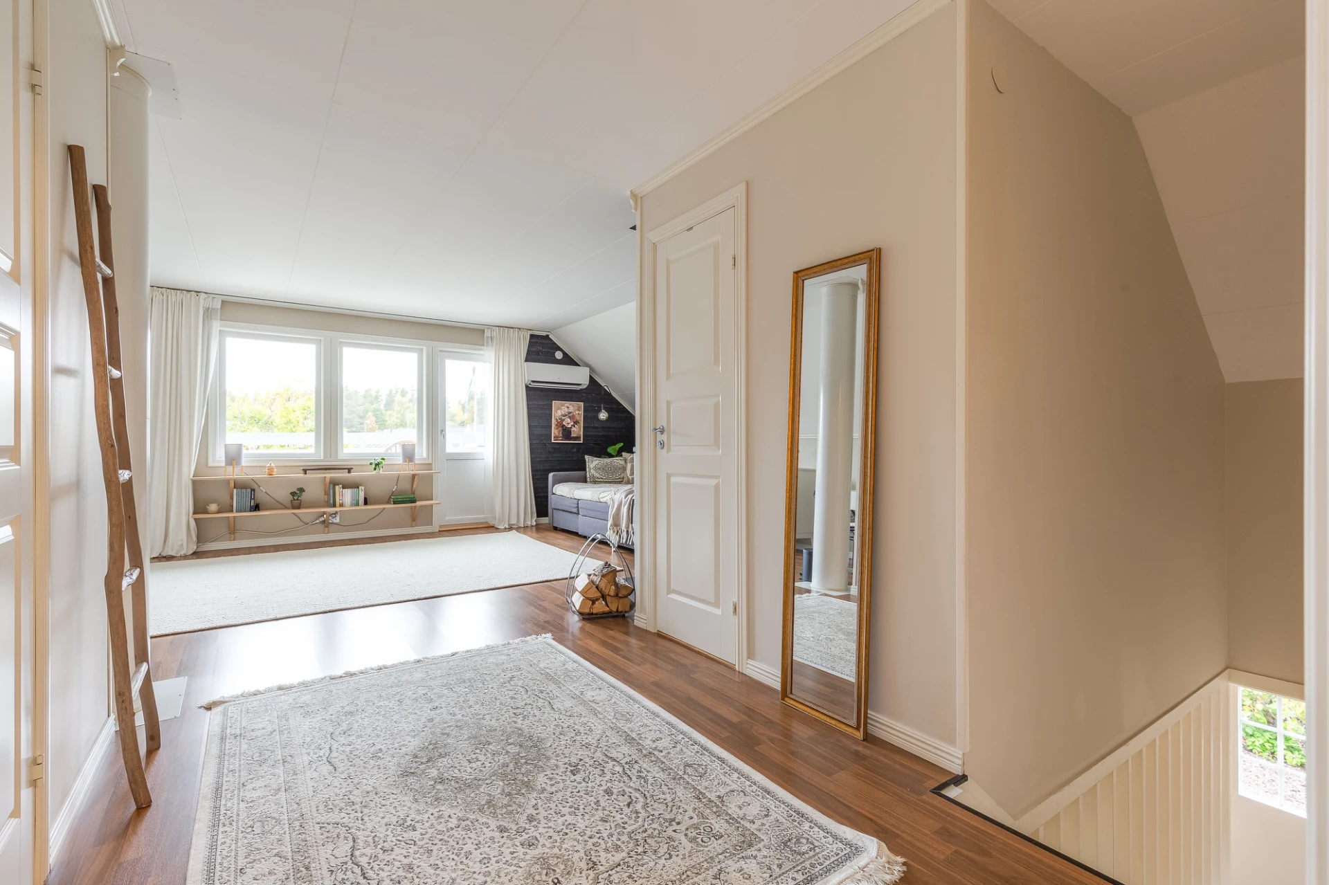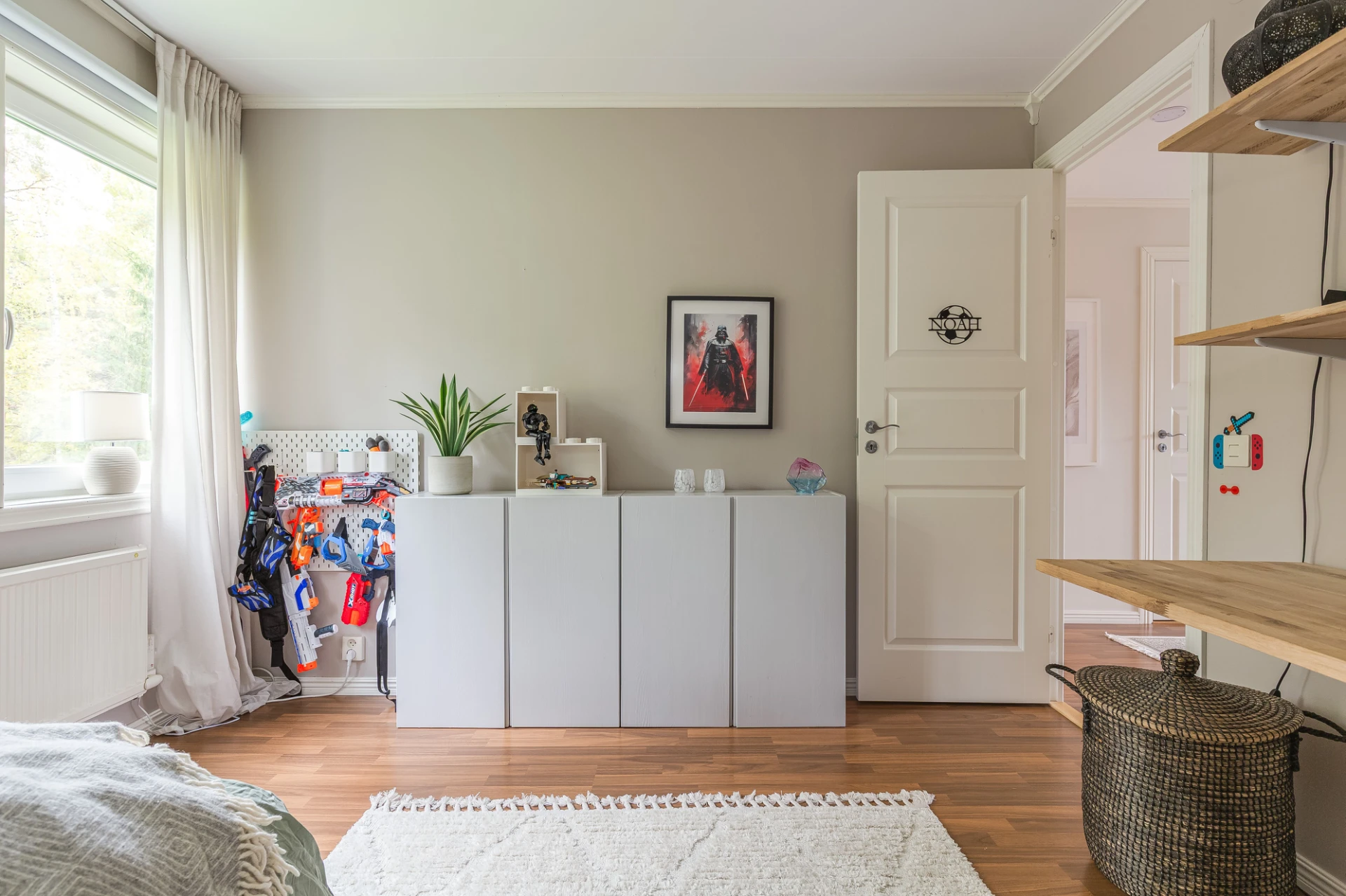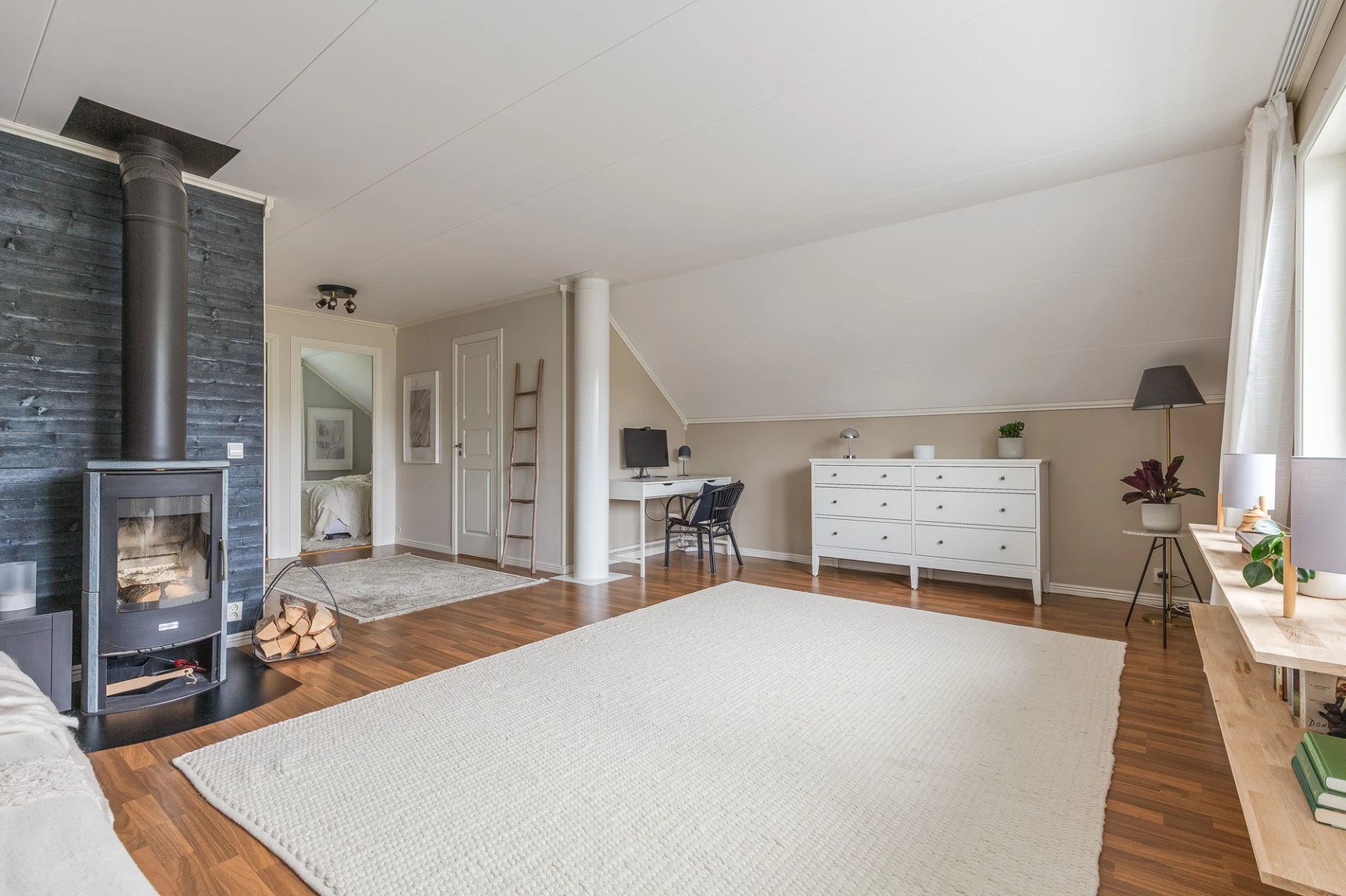 Parkettgolv och väggar i en beige nyans samt svart träpanel. Här finns plats för soffgrupp med tillhörande möblemang samt skrivbords- eller läshörna. Rummet kan delas av för att skapa ytterligare ett sovrum. Förvaring i klädkammare. Från allrummet nås balkongen i västerläge.
