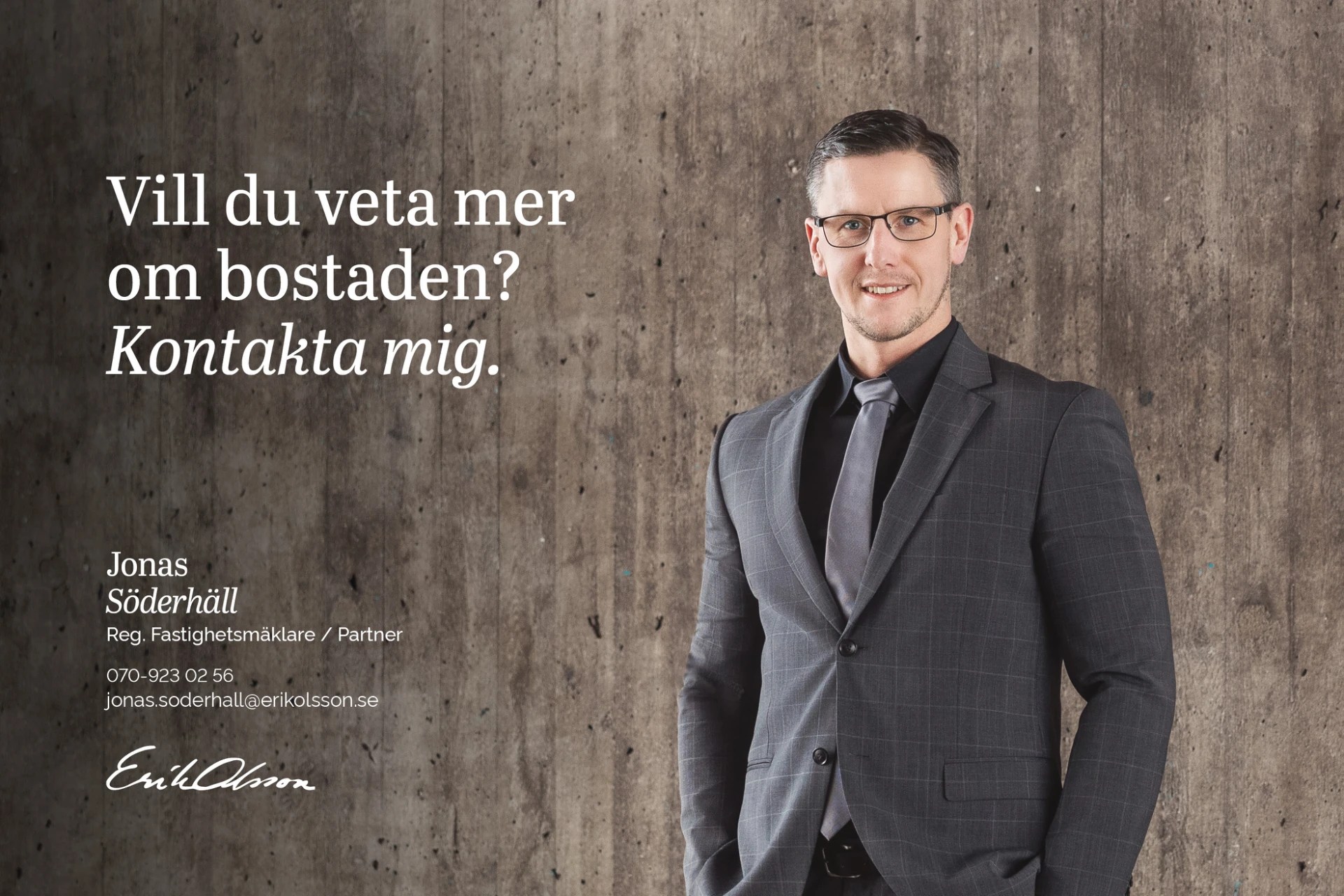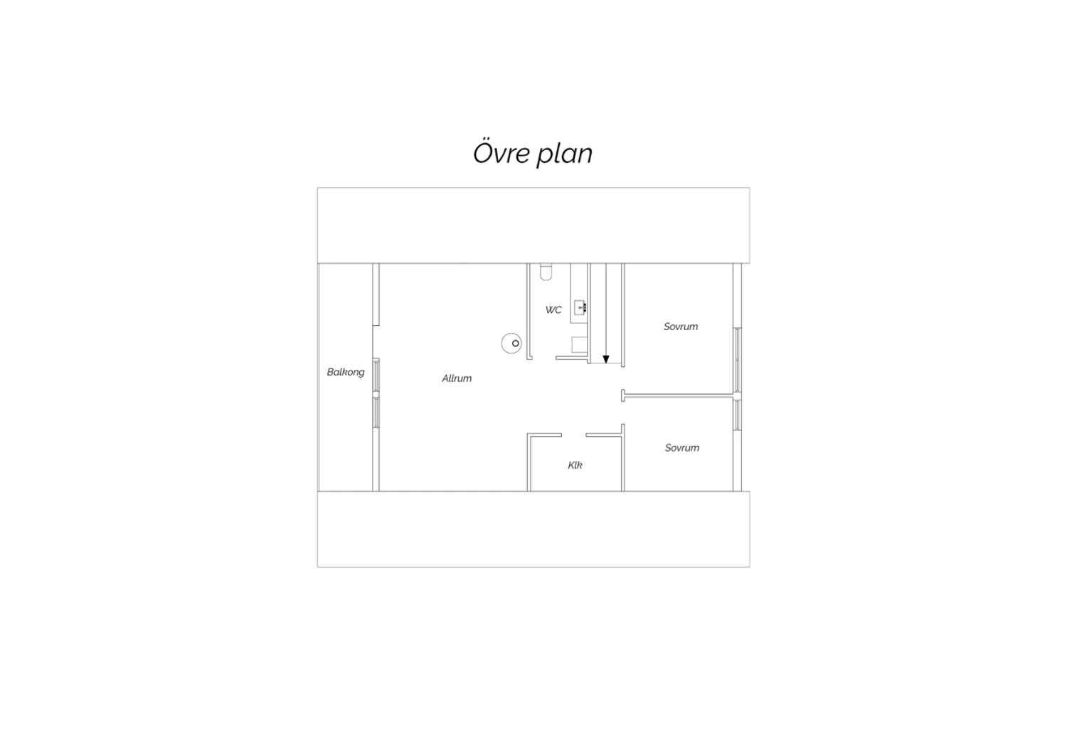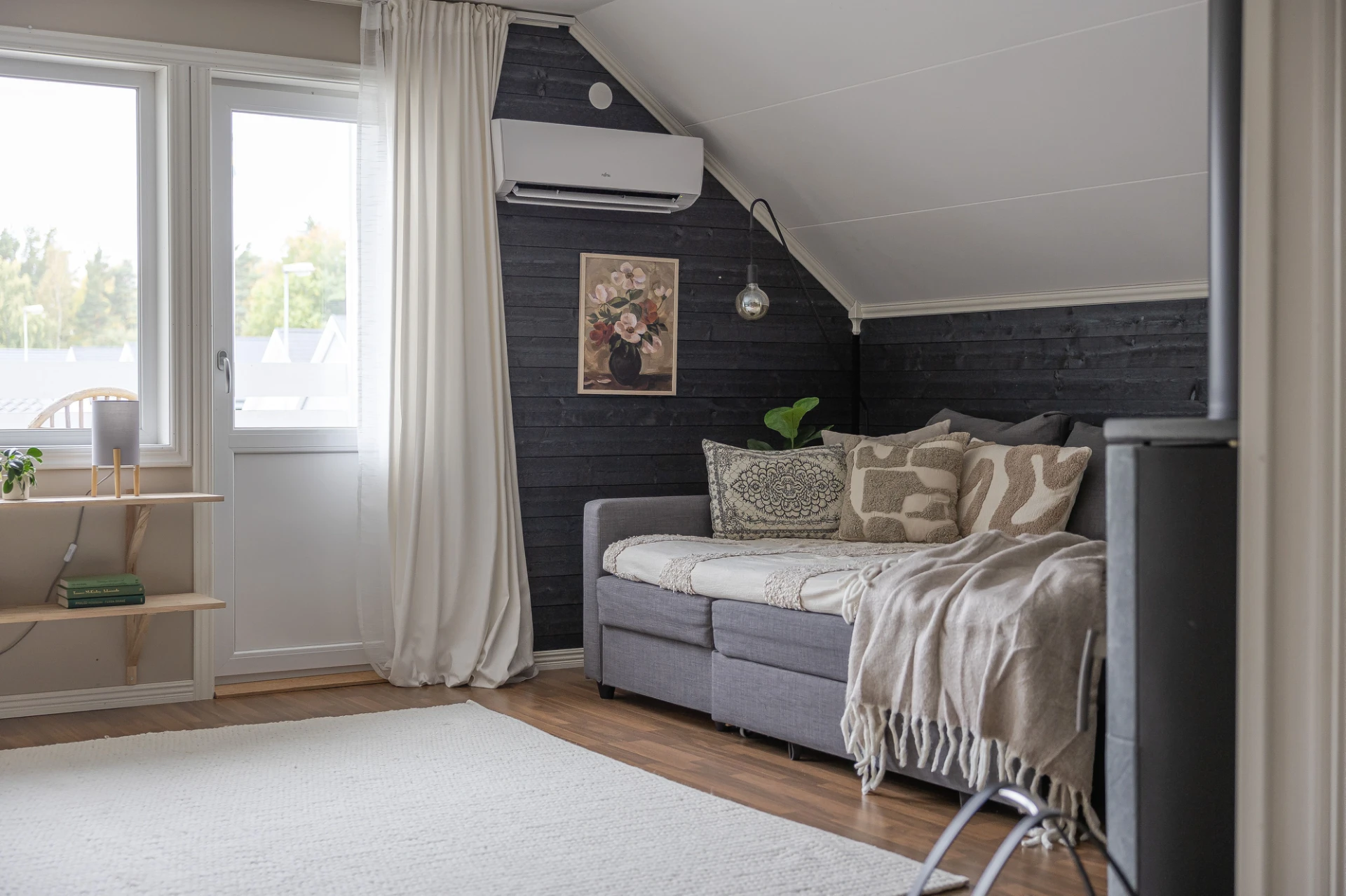 Parkettgolv och väggar i en beige nyans samt svart träpanel. Här finns plats för soffgrupp med tillhörande möblemang samt skrivbords- eller läshörna. Rummet kan delas av för att skapa ytterligare ett sovrum. Förvaring i klädkammare. Från allrummet nås balkongen i västerläge.