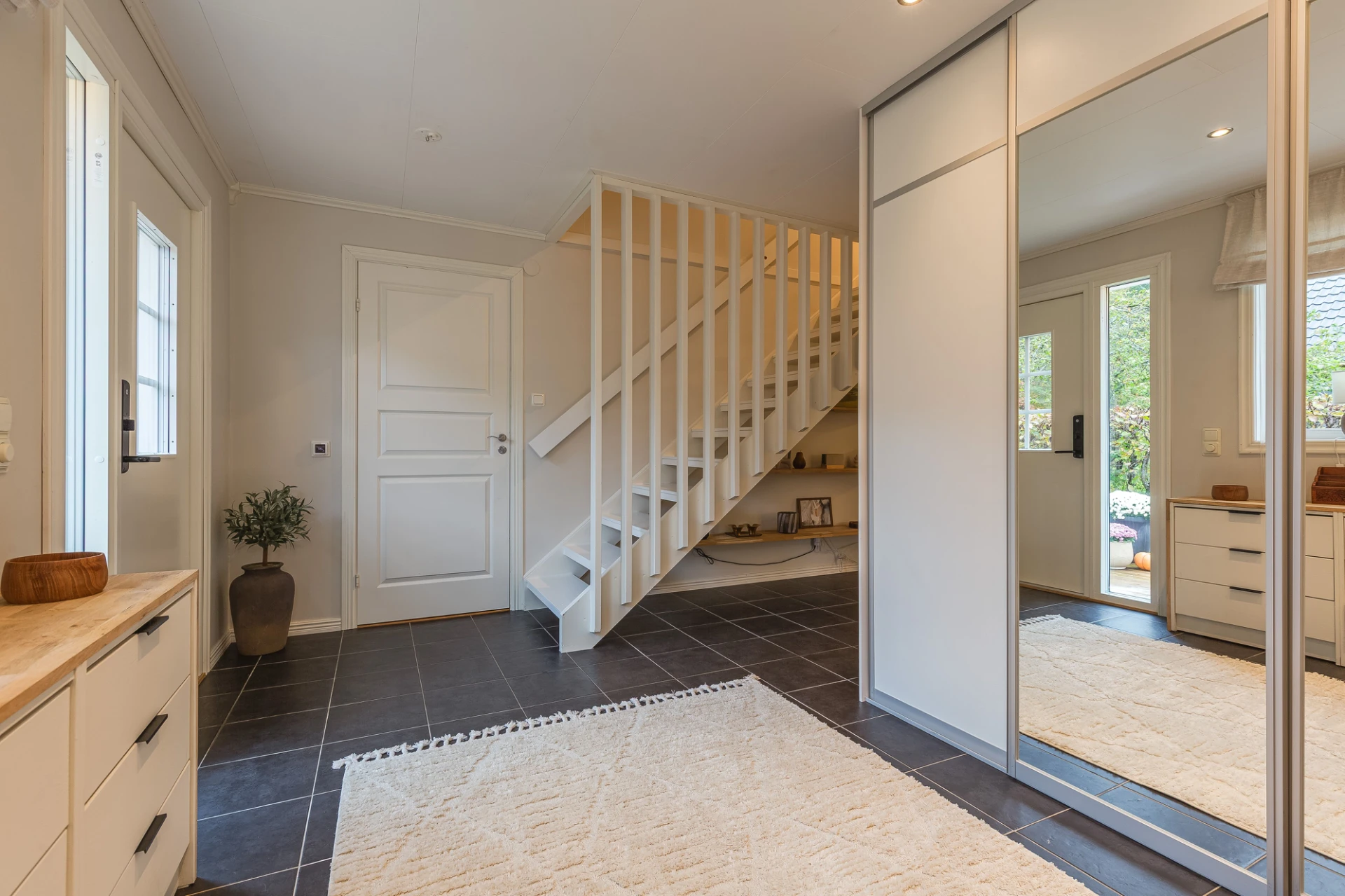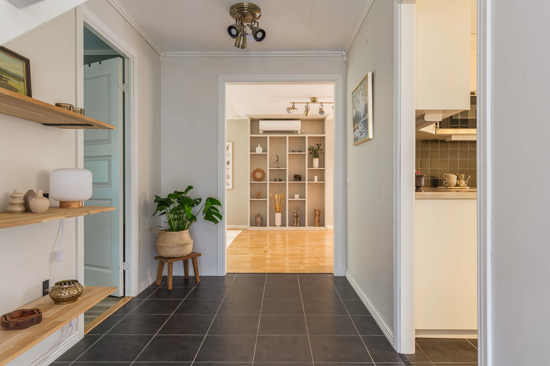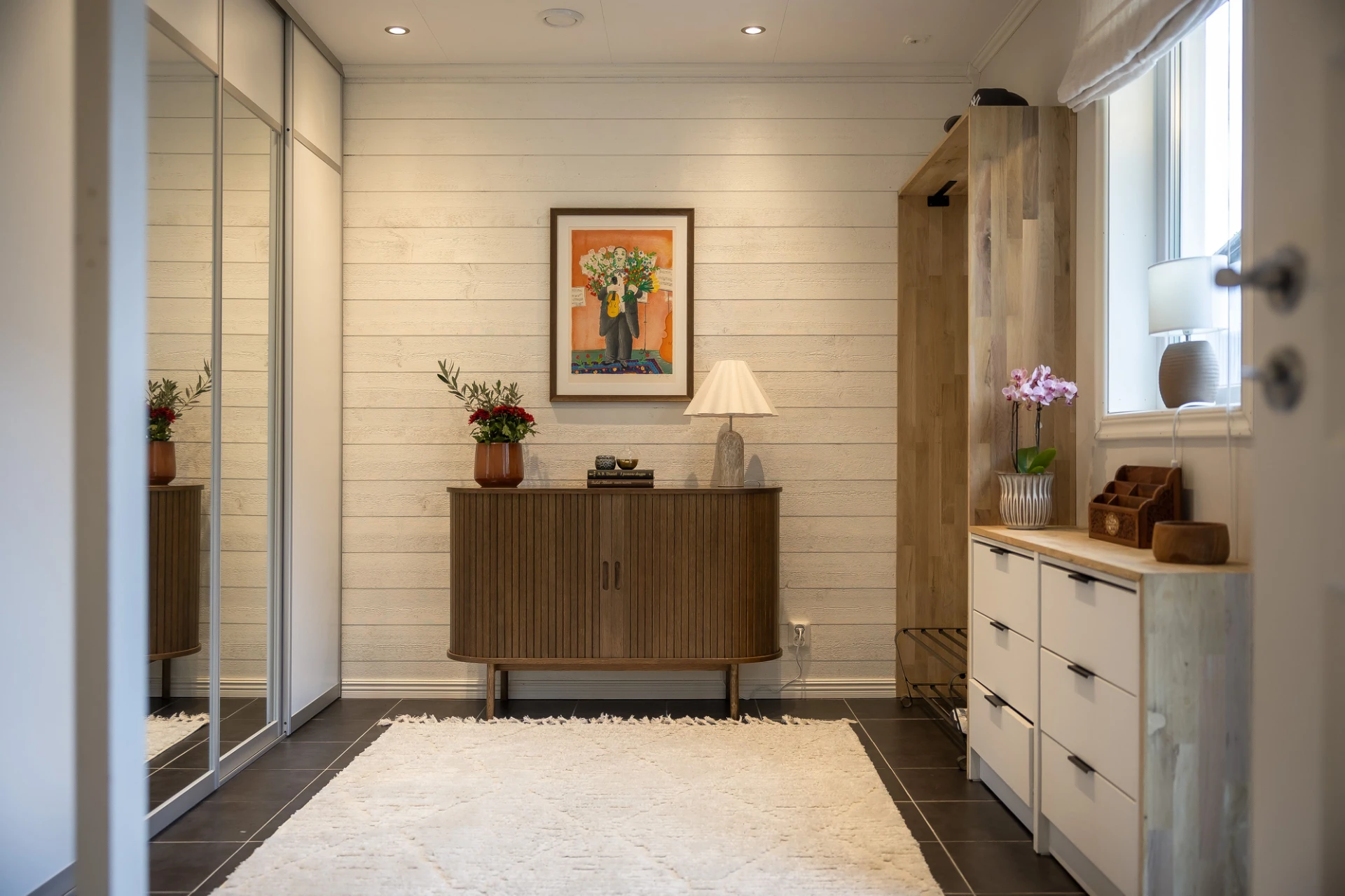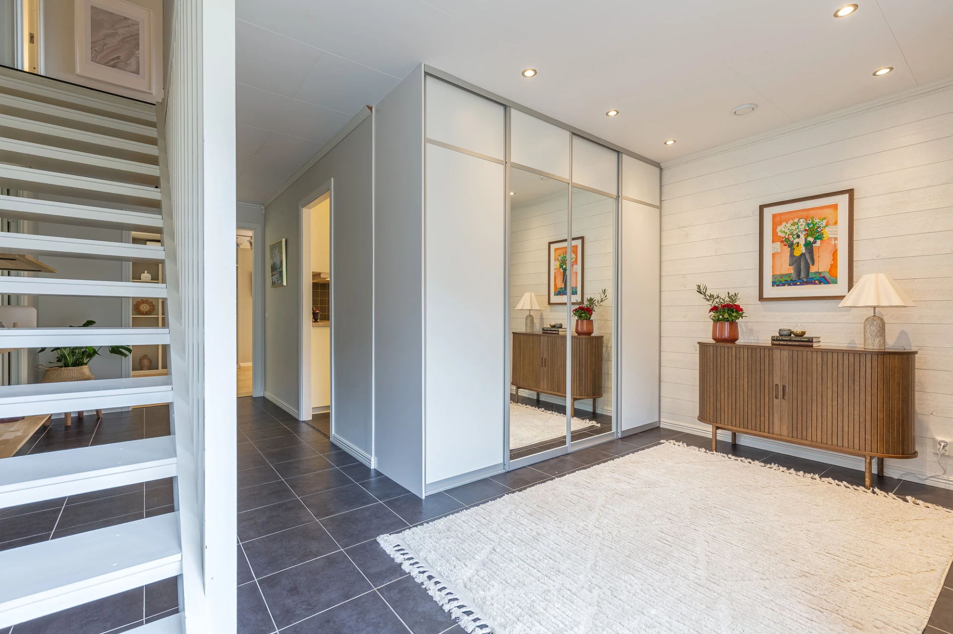 Mörkgrått klinkergolv med elburen golvvärme och väggar i en beige nyans samt fondvägg i vit träpanel. Spotlights i taket. Avhängning i hatthylla och ytterligare förvaring i skjutdörrsgarderob.