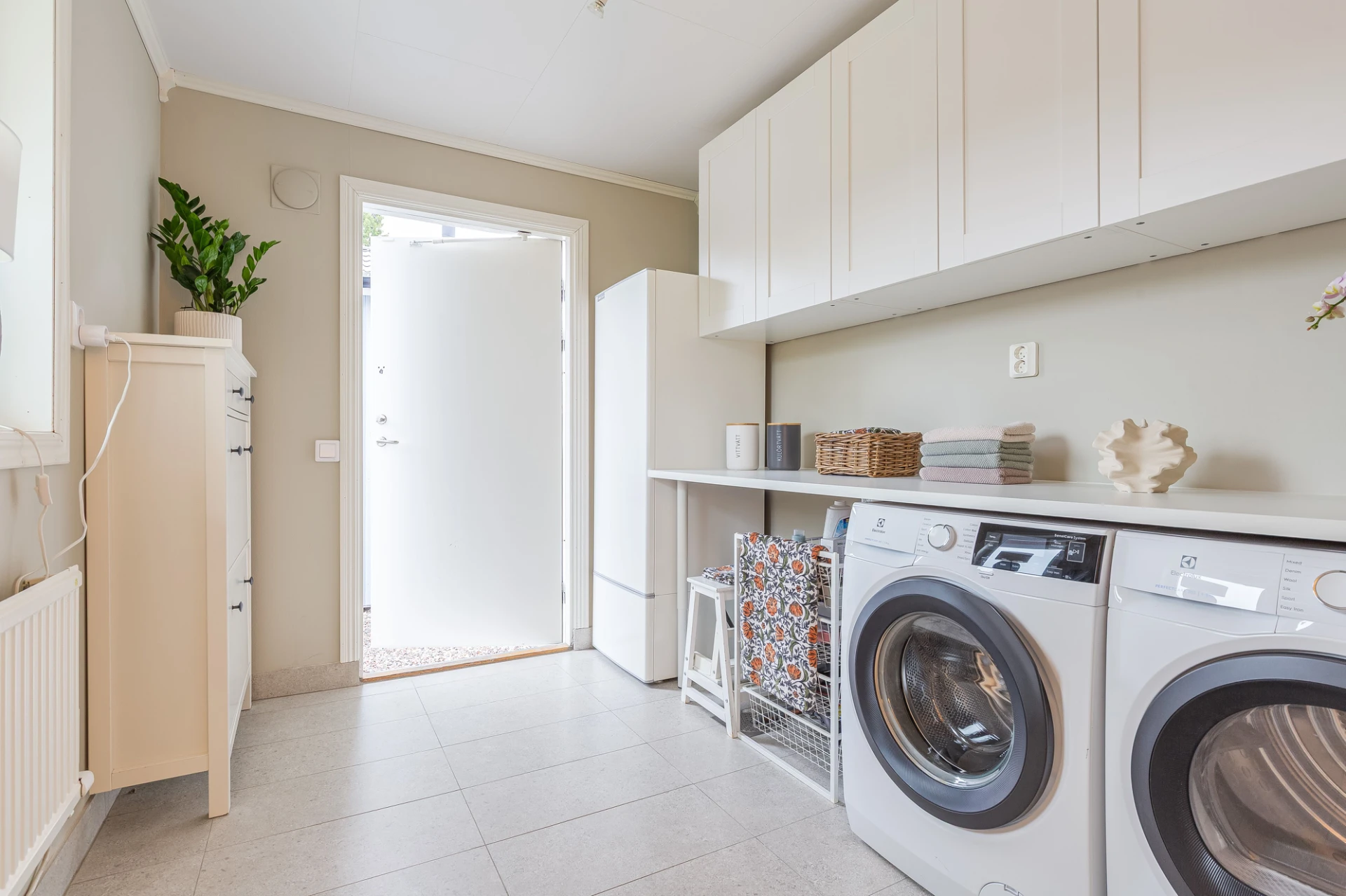 Grått klinkergolv med elburen golvvärme och väggar i en beige nyans. Tvättstugan är utrustad med tvättmaskin, torktumlare, arbetsbänk och förvaringsskåp.