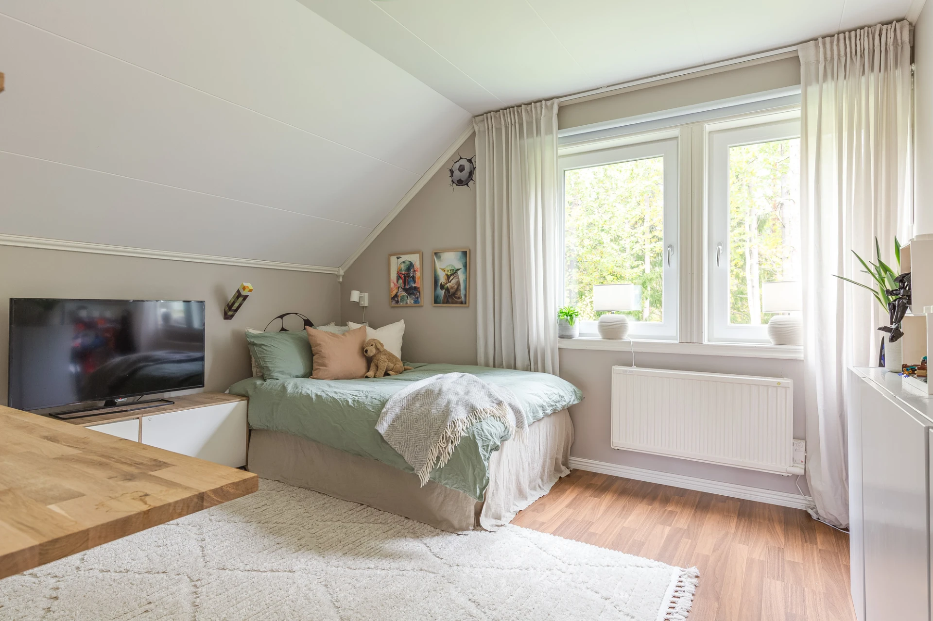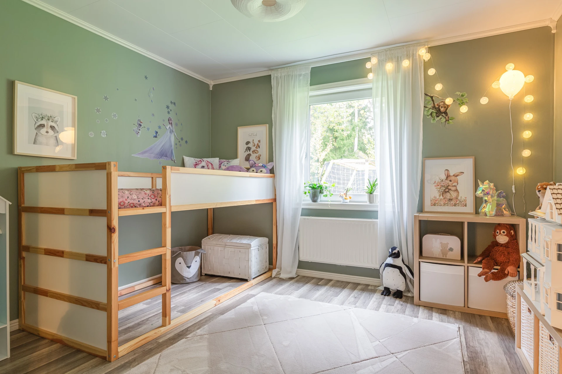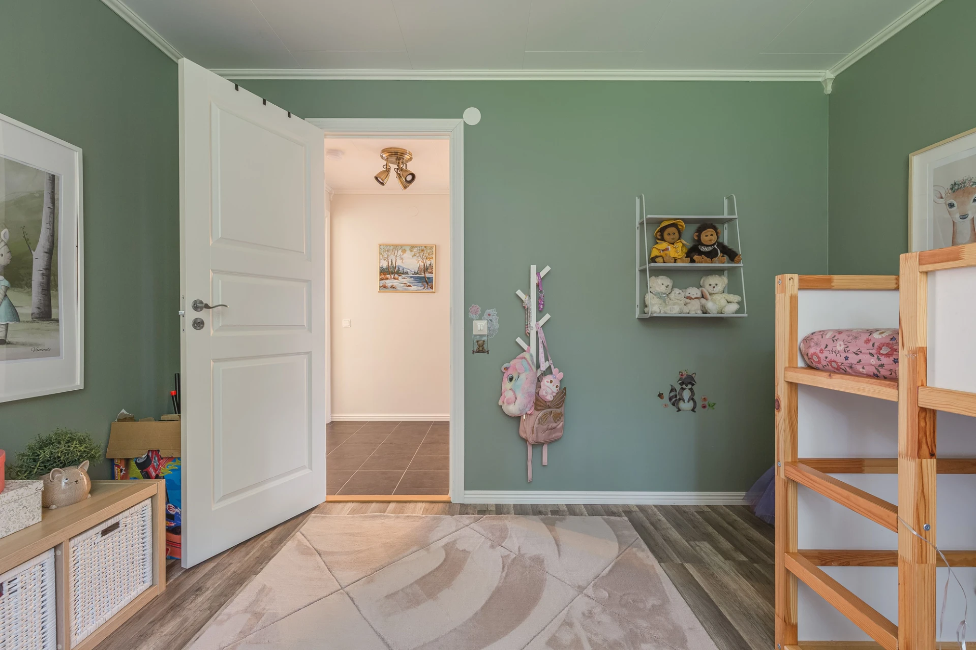 Laminatgolv och väggar i grönt. Här finns plats för dubbelsäng med tillhörande möblemang.