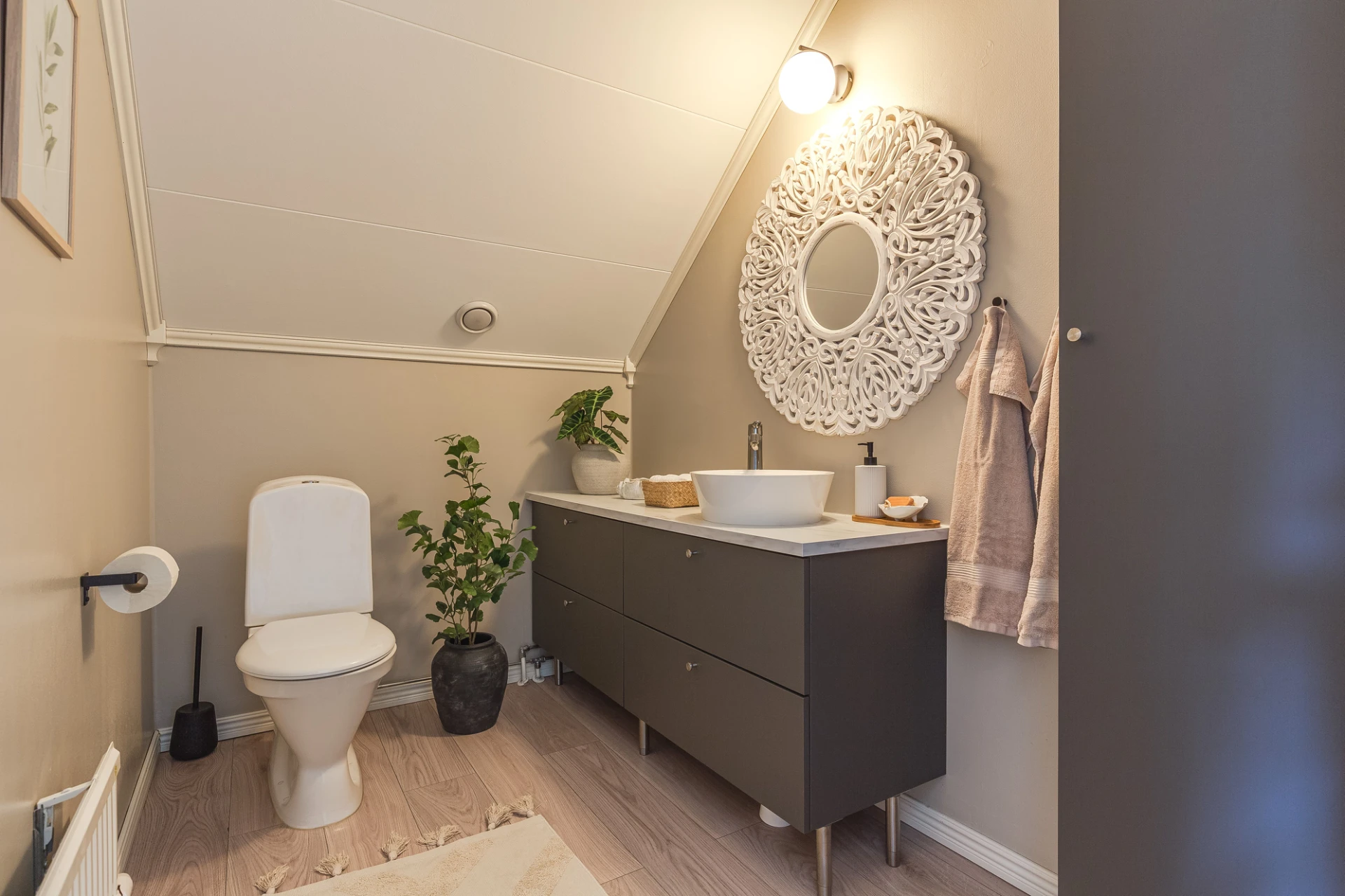 Laminatgolv och väggar i en beige nyans. Utrustat med WC, handfat med kommod och förvaringsskåp.
