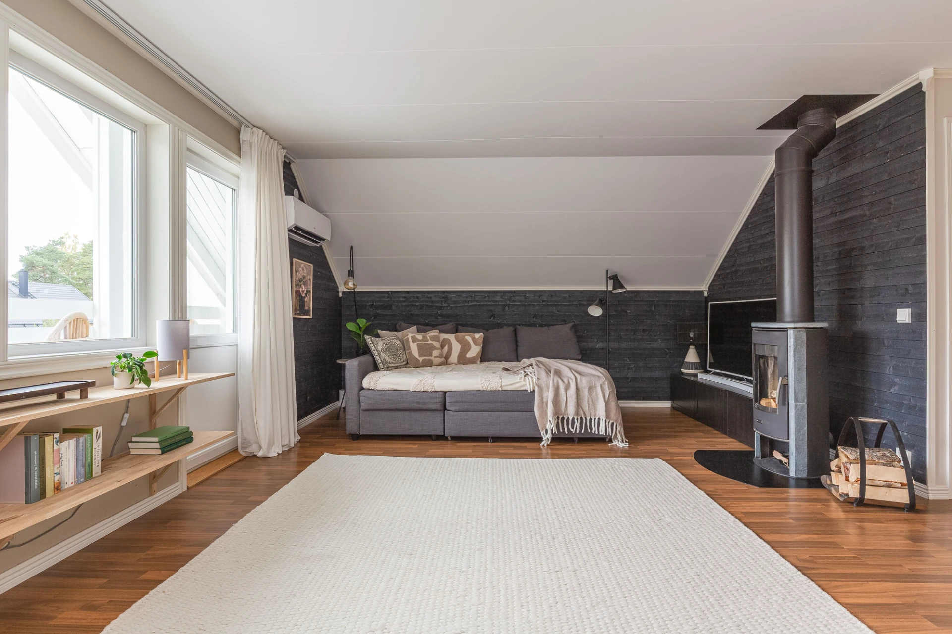 Parkettgolv och väggar i en grå nyans. Här finns plats för dubbelsäng med tillhörande möblemang.