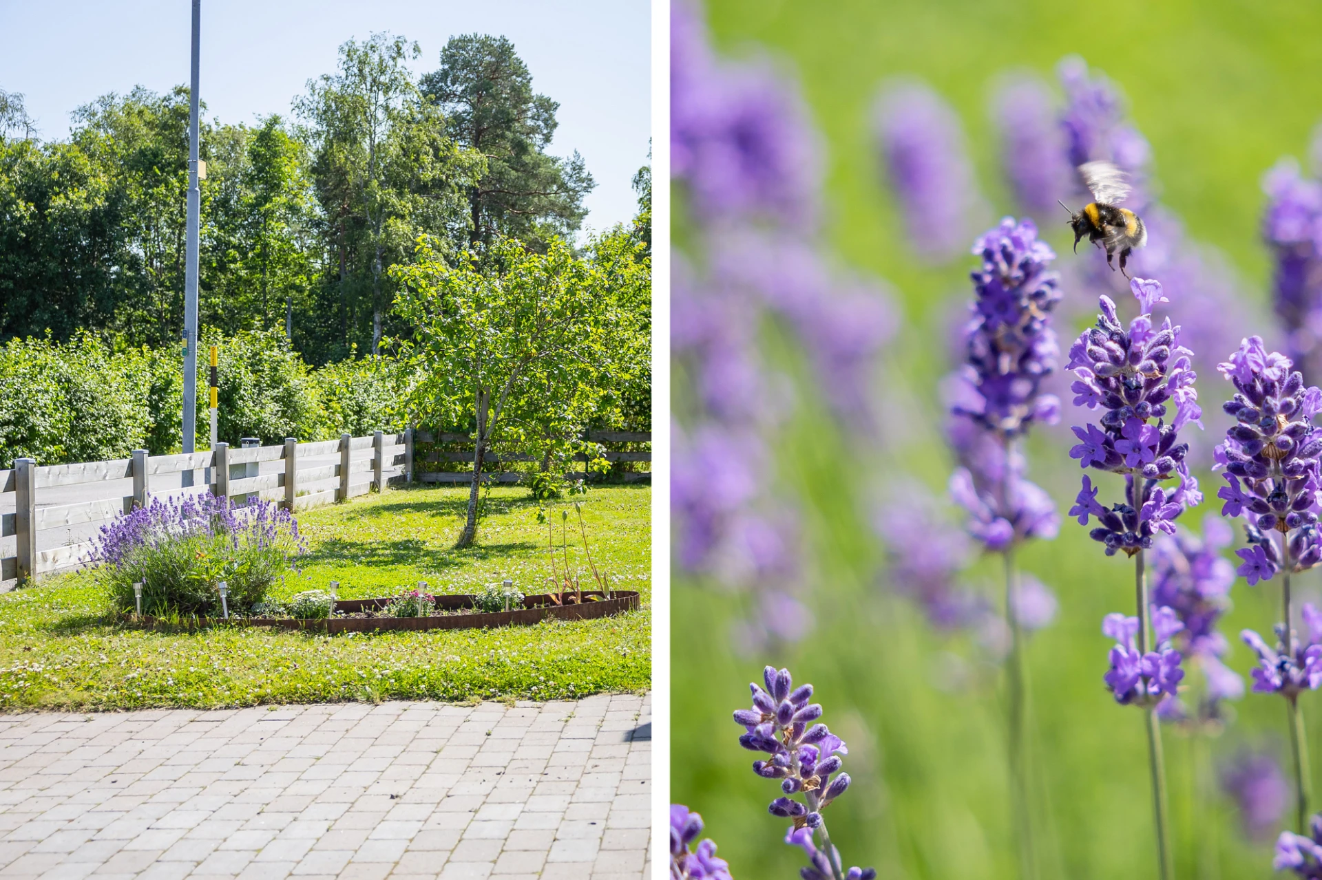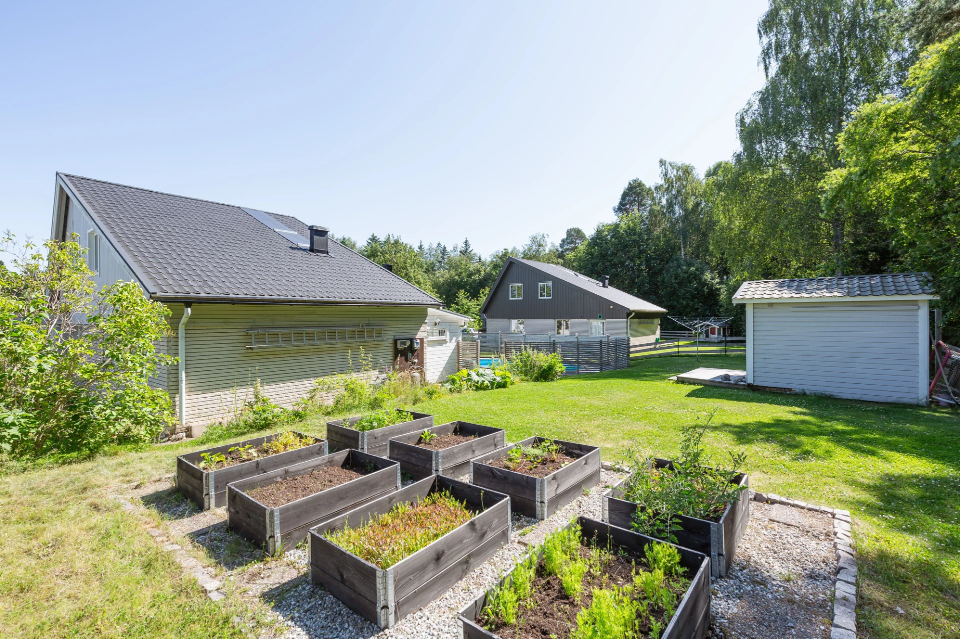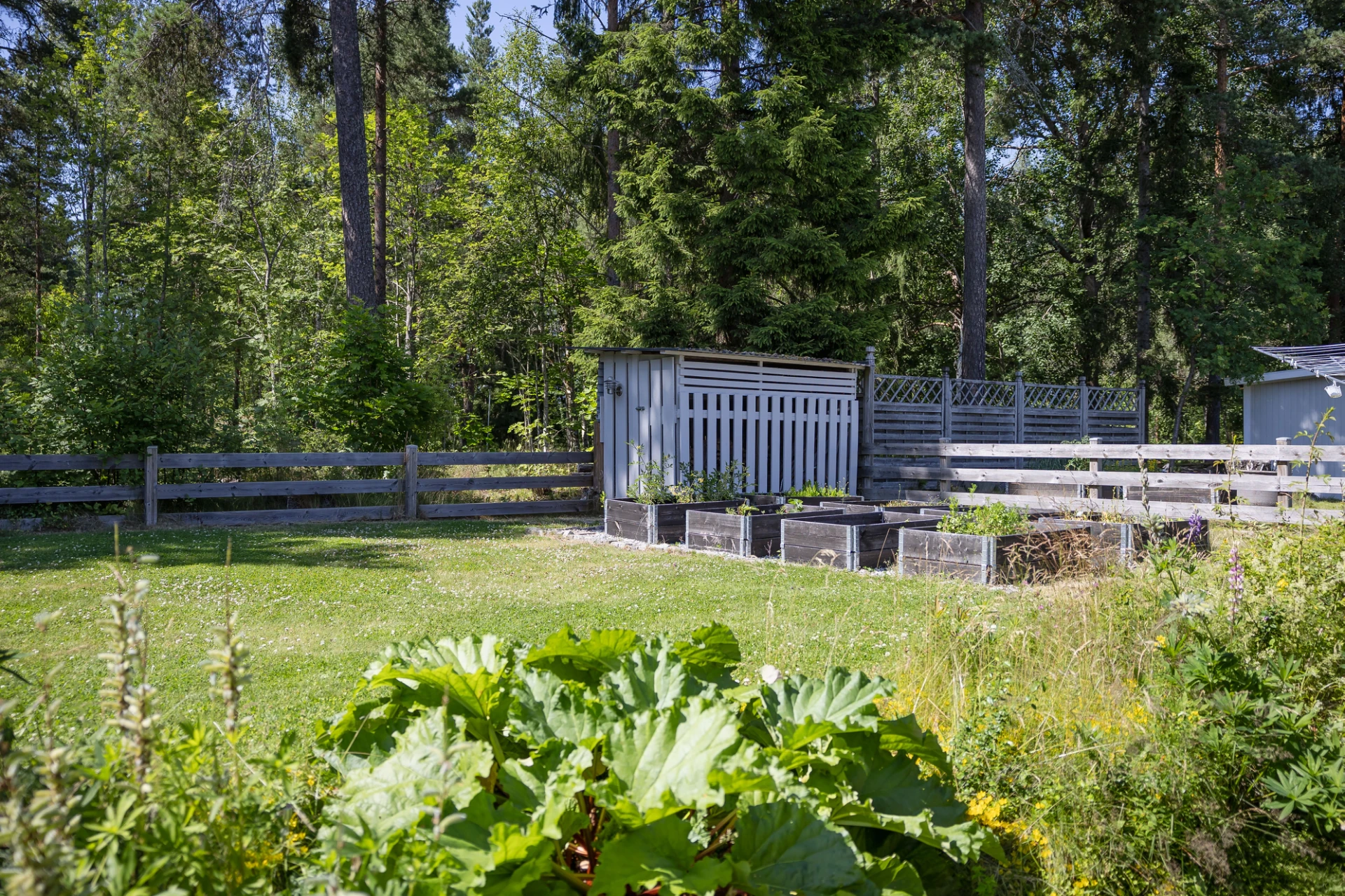 För odlingsintresserade finns åtta stora pallkragar, redo för grönsakslandet du alltid drömt om. Trädgården pryds dessutom av päronträd med osedvanligt god frukt, samt äpple-, plommon-, krusbärs- och röda vinbärsbuskar. Här växer också rabarber och till midsommar sprider en blommande doftschersmin sin ljuvliga doft över hela tomten.