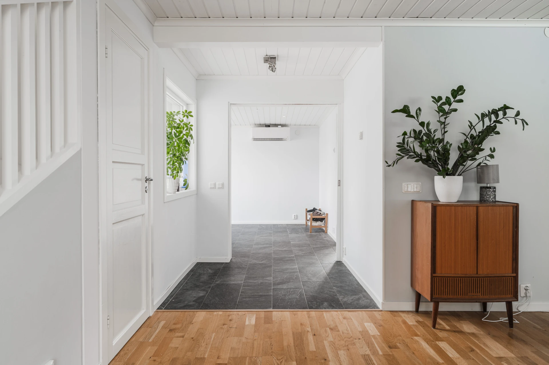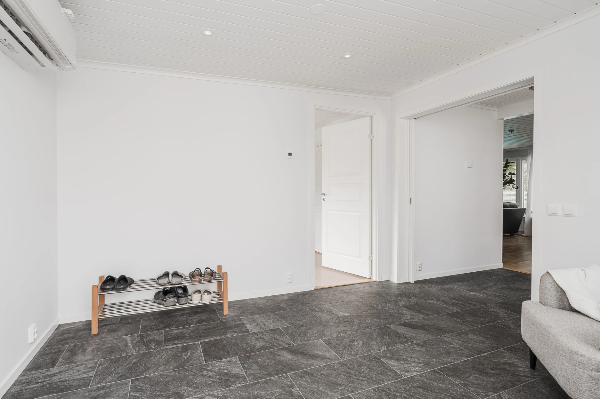 Övrigt om byggnaden: - Hallen 2025 av yrkesman. Golv med golvvärme, innerväggar, innertak med spotlights. Flytt av ytterdörr. Yrkesman.