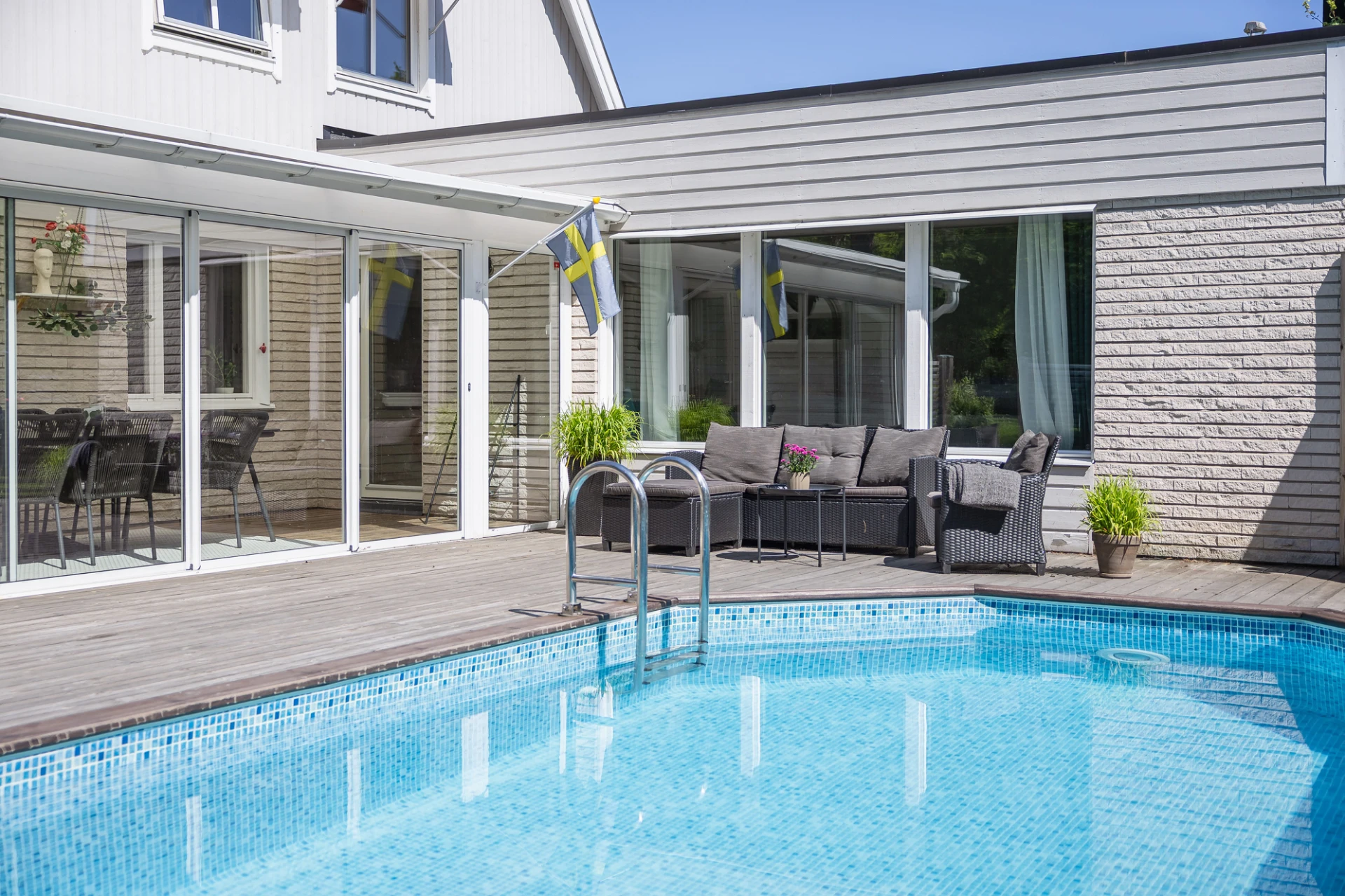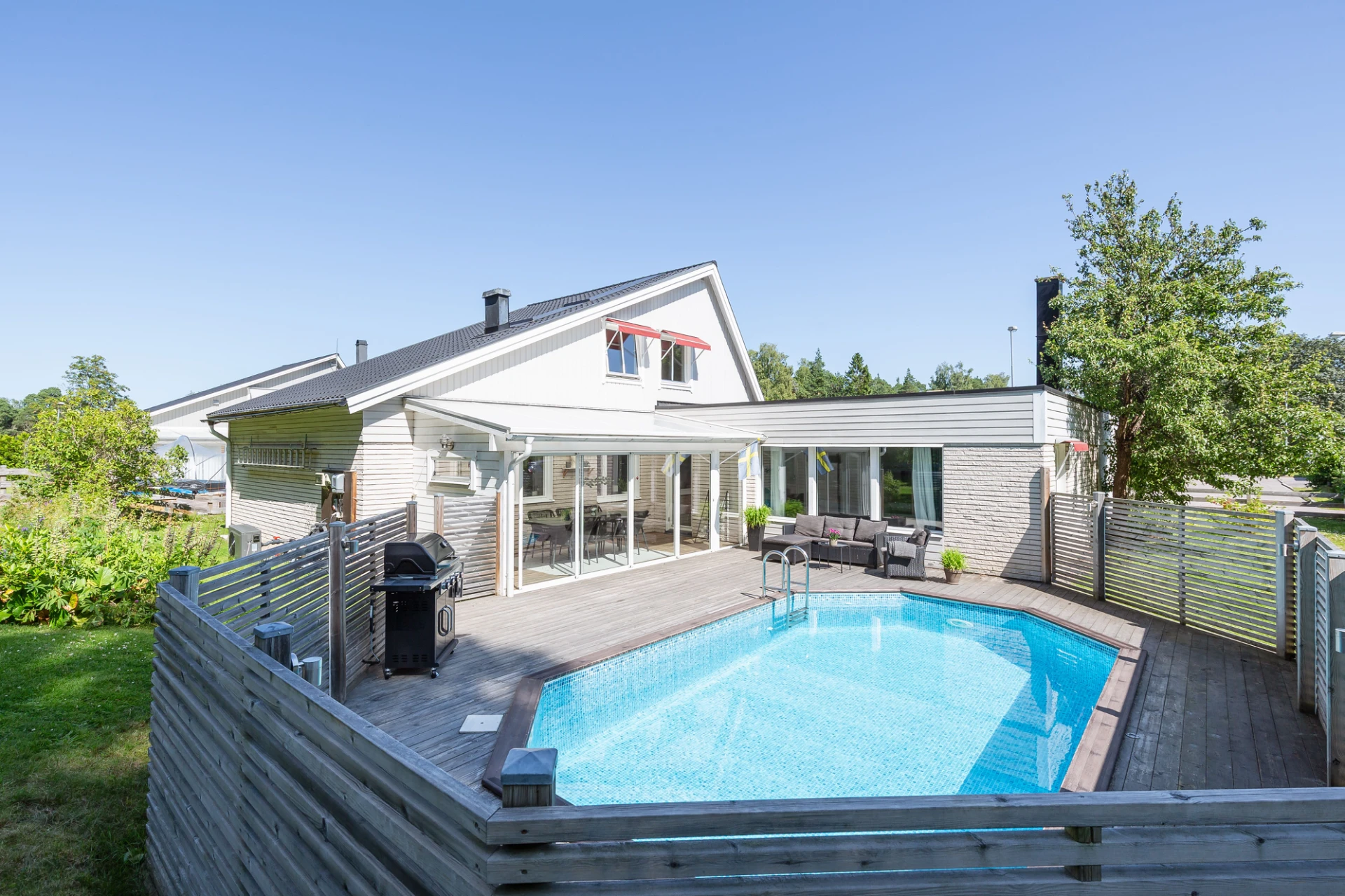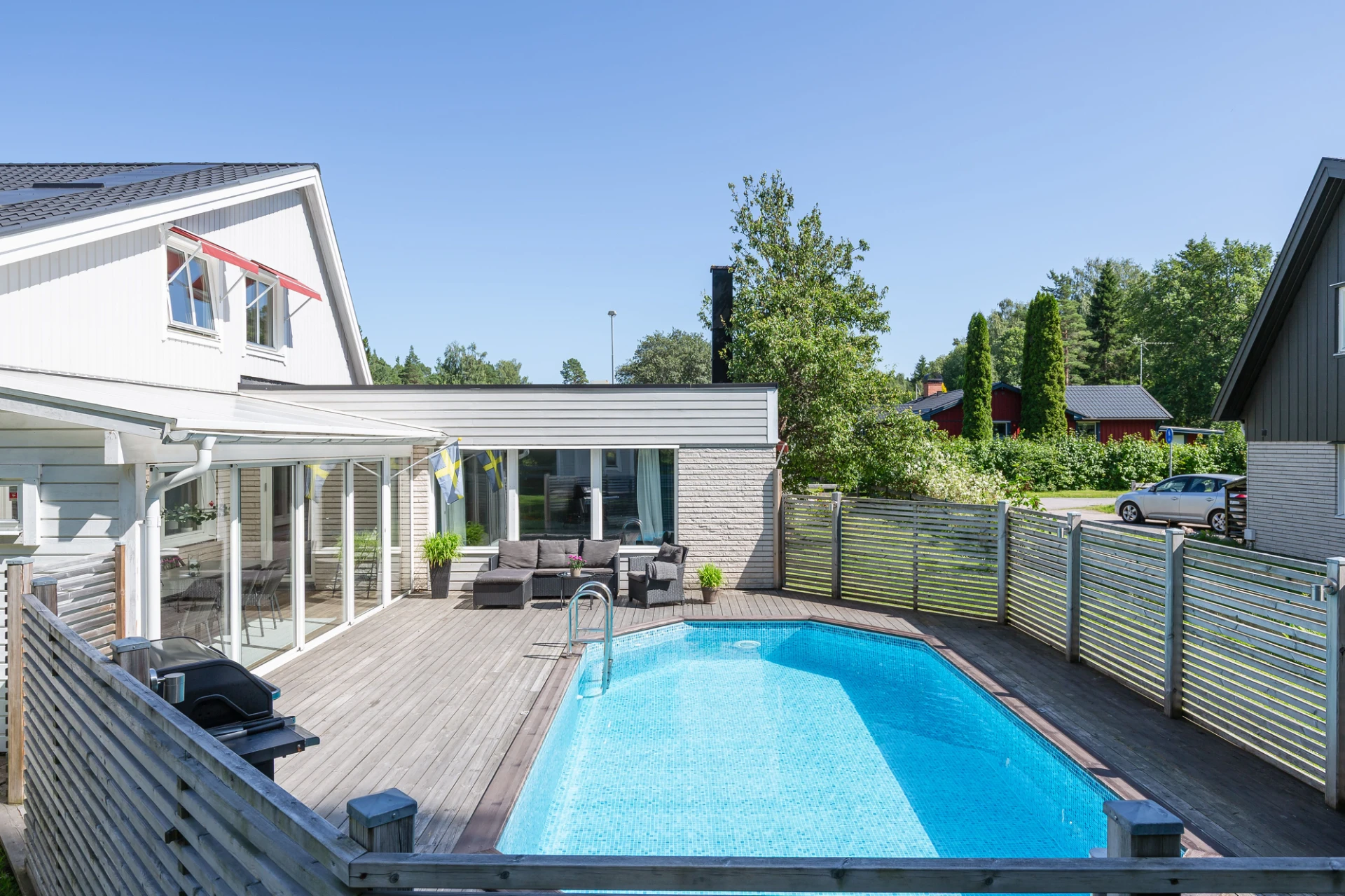 För dig som gillar att njuta av livet utomhus väntar en fantastisk uteplats med en stor, uppvärmd pool, perfekt för lata sommardagar och härliga grillkvällar. Intill finns även ett inglasat uterum som blir ett extra vardagsrum under stora delar av året.