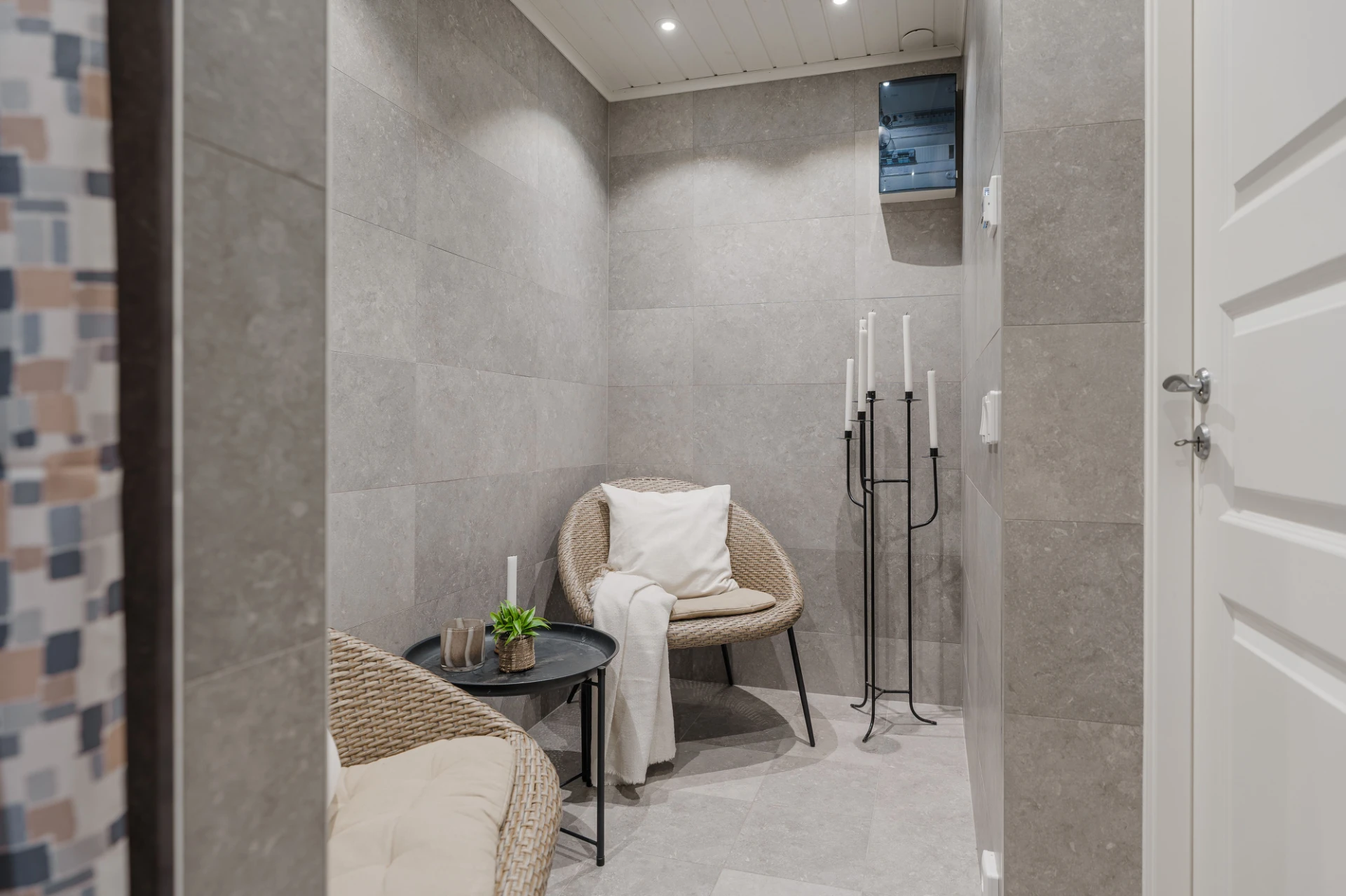 Under vintern blir huset en mysig tillflyktsort med en värmande braskamin och ett avkopplande dusch- och relaxrum med bastu – en perfekt plats att varva ner efter en lång dag. Intill finns skogsområden där barnen kan plocka blåbär på sommaren och åka pulka på vintern.