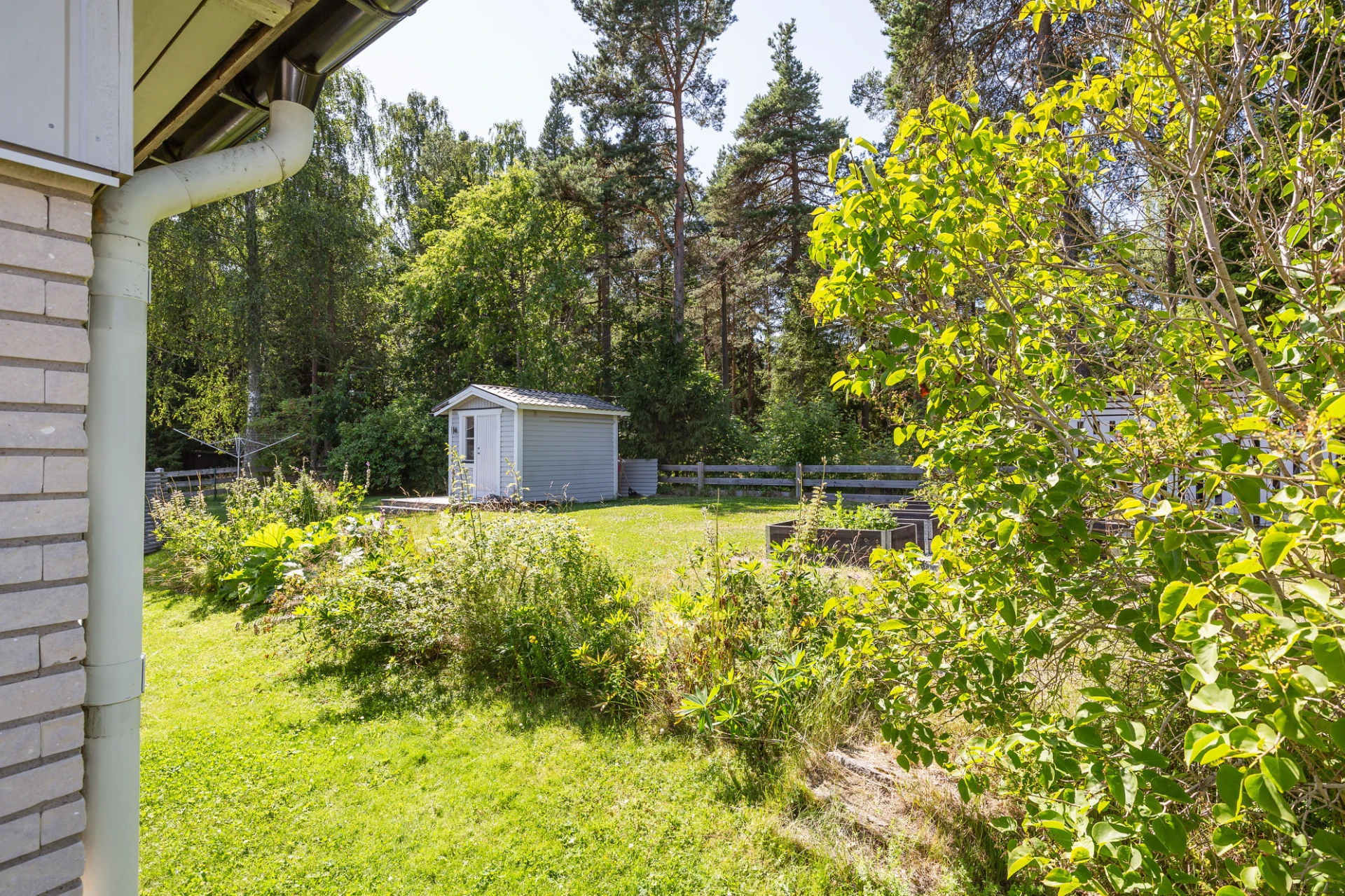 Till huset hör även ett praktiskt uthus med gott om plats för trädgårdsredskap och vedförvaring.