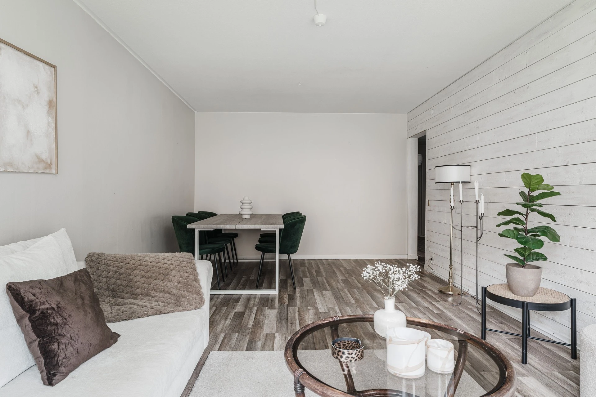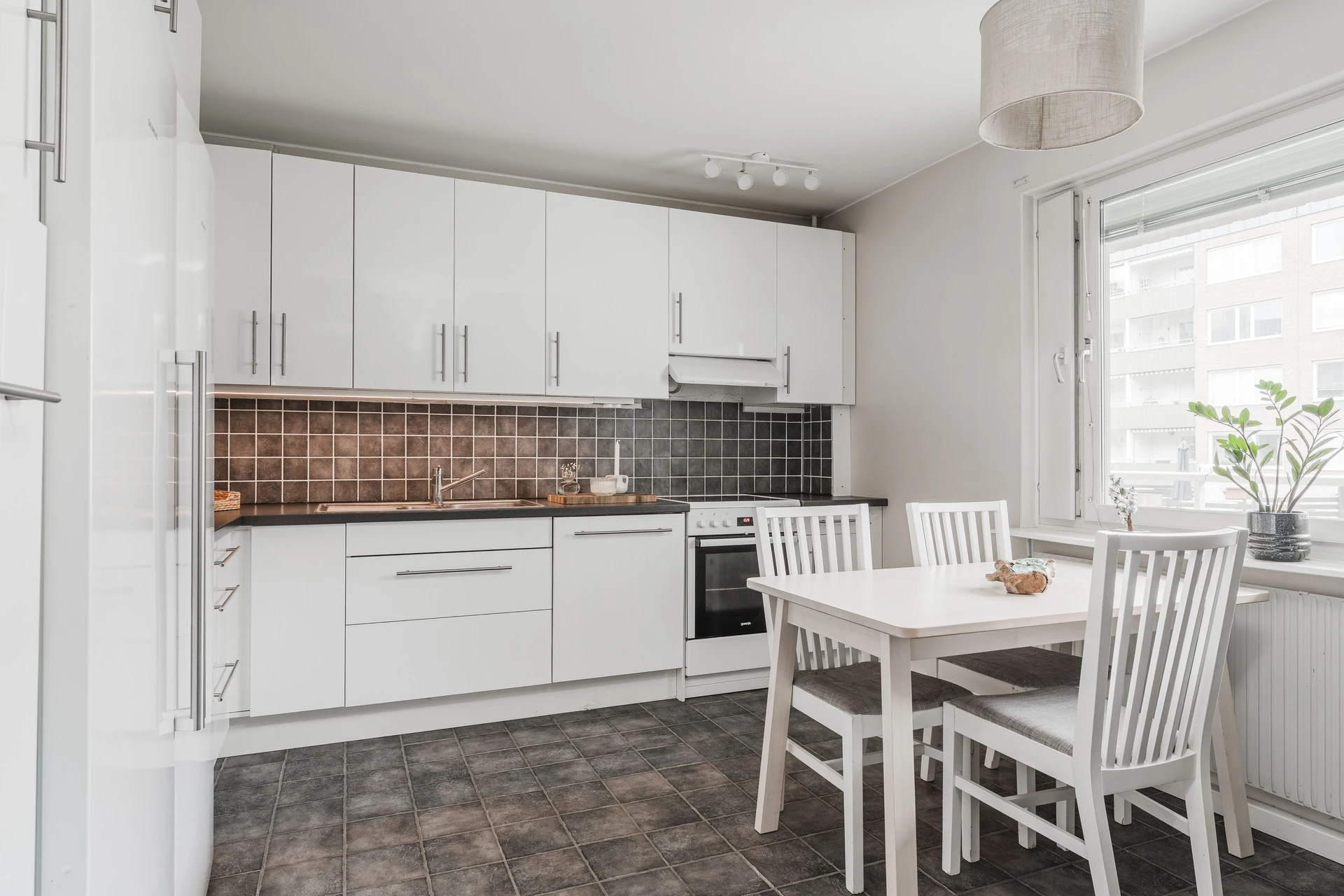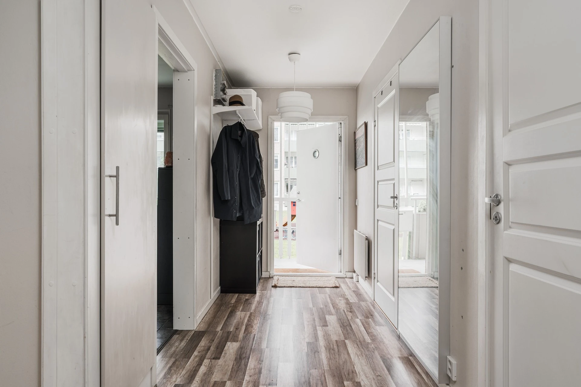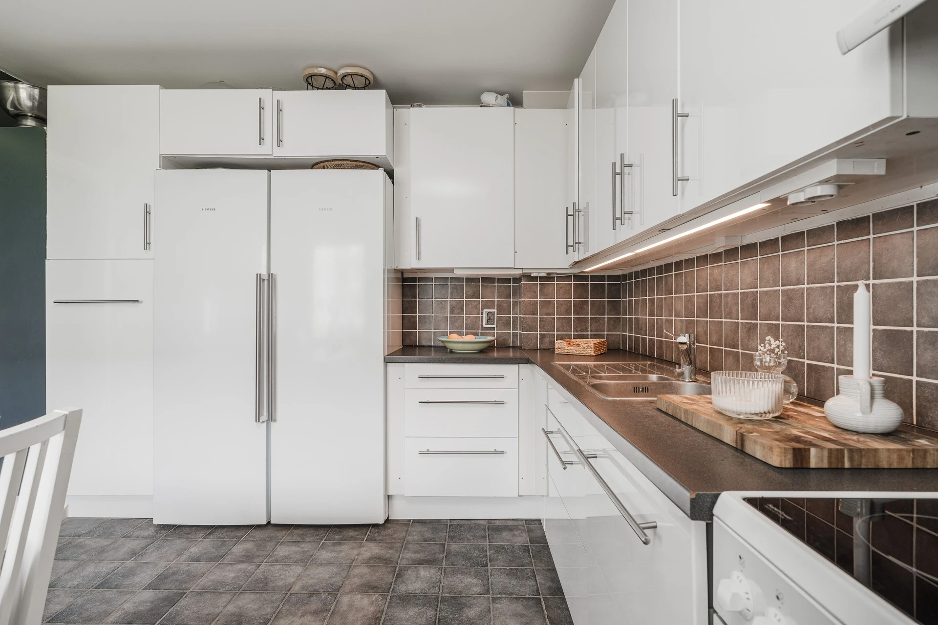 I det rymliga köket lagar du en god middag och har plats för matgrupp till hela familjen. Vardagsrummet med sina stora fönsterpartier som släpper in ett fint dagsljus är stort nog för både soffgrupp och matplats. De ljusa färgvalen går sammanhängande genom hela lägenheten från kök till sovrum där du har utgången till balkongen som ligger skyddat i västerläge ut mot gräsområde.