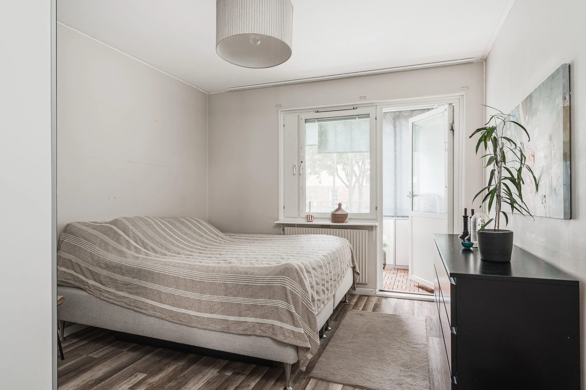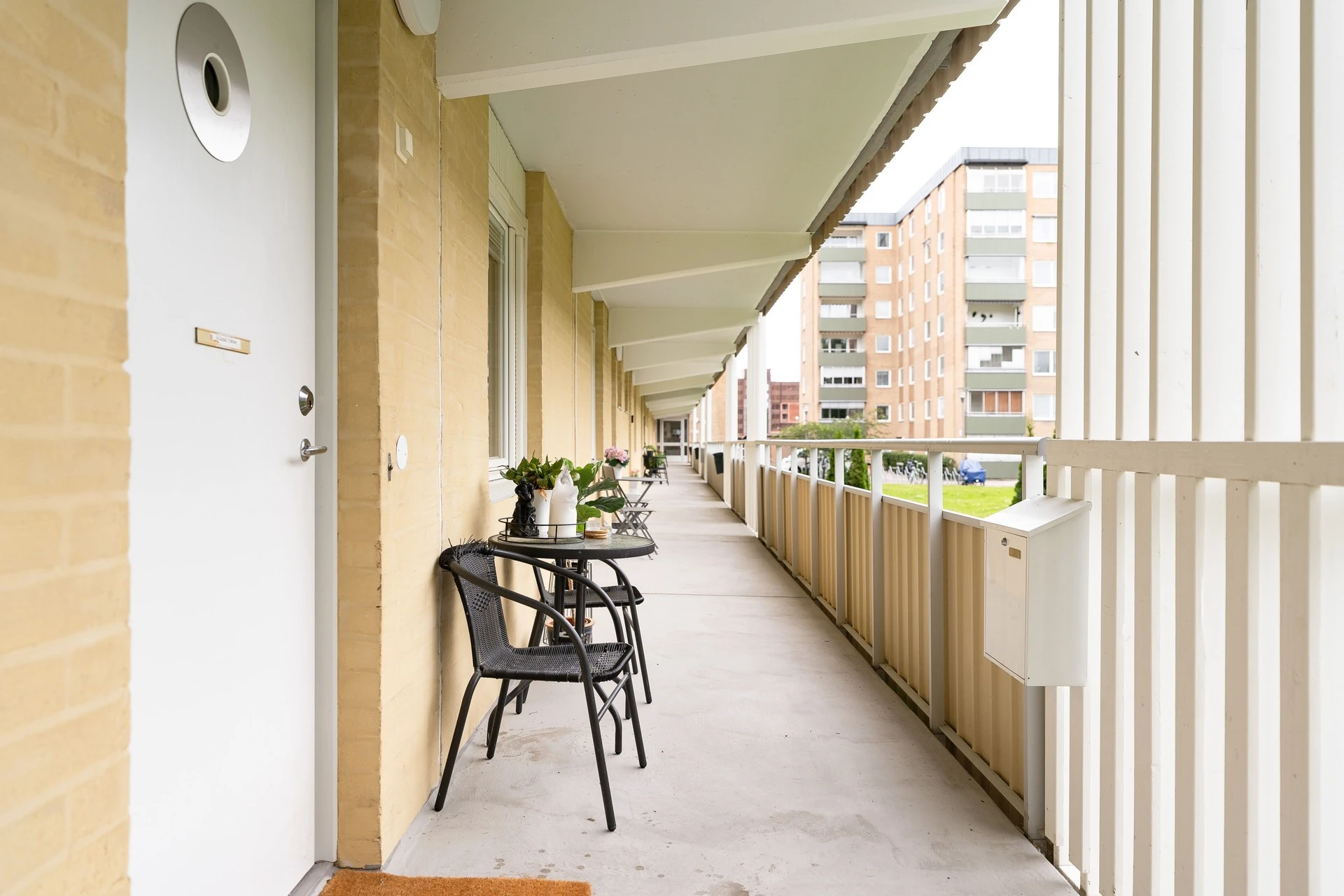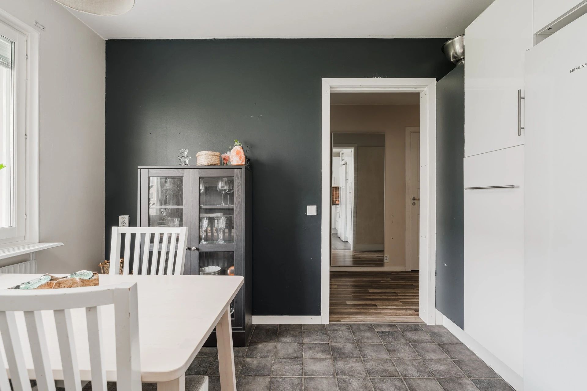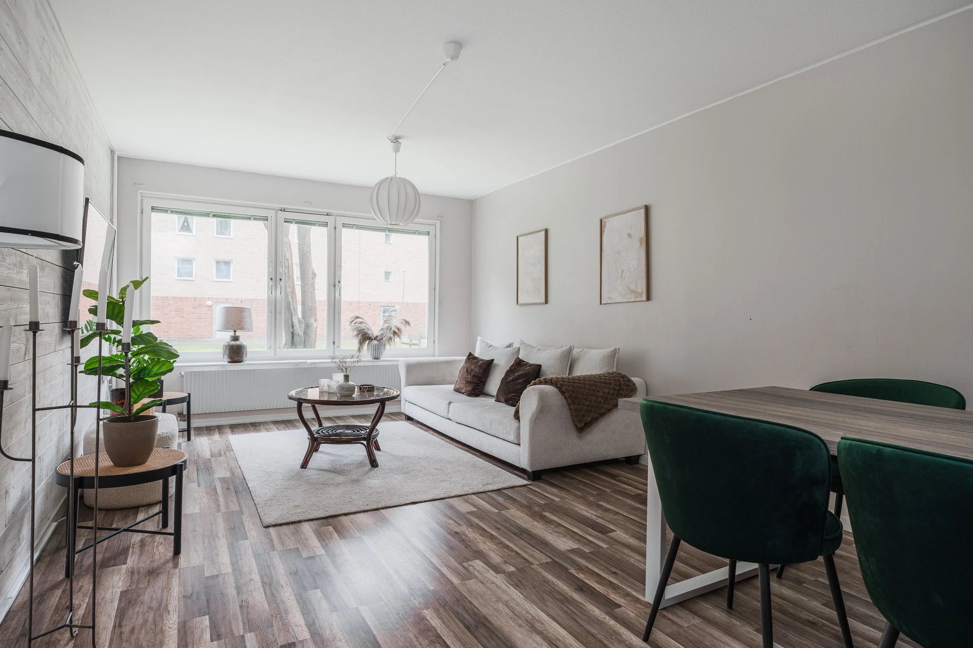 I det rymliga köket lagar du en god middag och har plats för matgrupp till hela familjen. Vardagsrummet med sina stora fönsterpartier som släpper in ett fint dagsljus är stort nog för både soffgrupp och matplats. De ljusa färgvalen går sammanhängande genom hela lägenheten från kök till sovrum där du har utgången till balkongen som ligger skyddat i västerläge ut mot gräsområde.