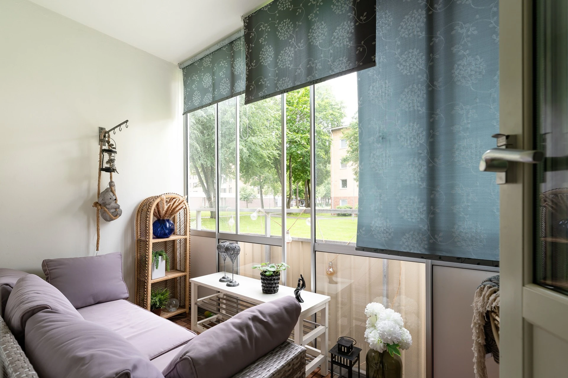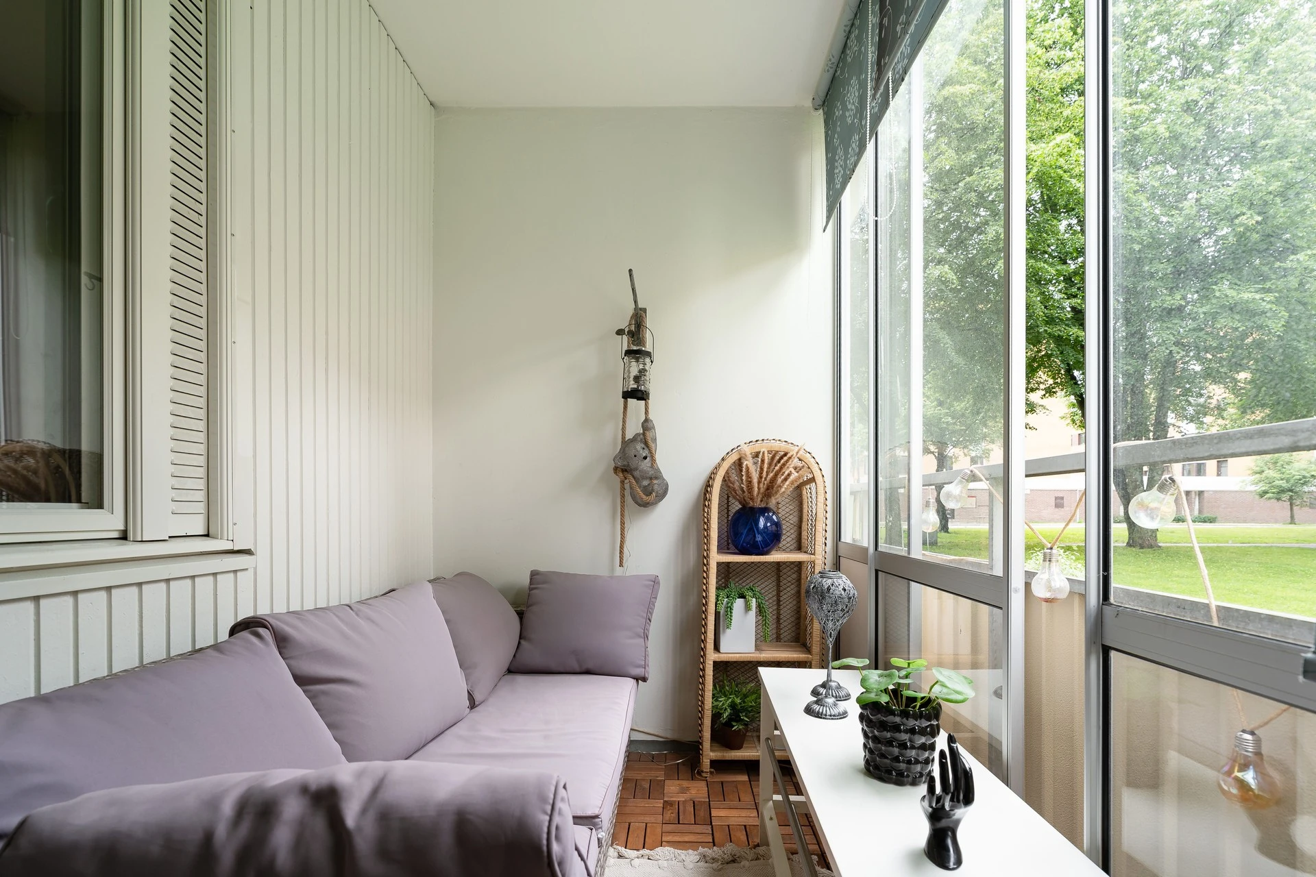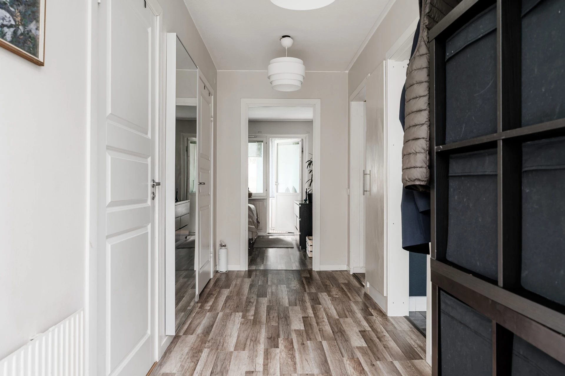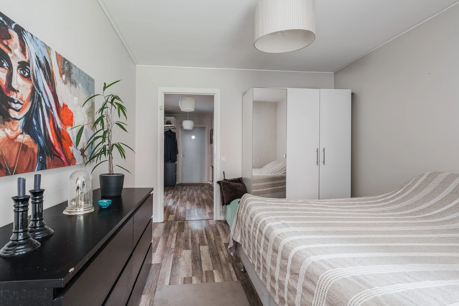 I det rymliga köket lagar du en god middag och har plats för matgrupp till hela familjen. Vardagsrummet med sina stora fönsterpartier som släpper in ett fint dagsljus är stort nog för både soffgrupp och matplats. De ljusa färgvalen går sammanhängande genom hela lägenheten från kök till sovrum där du har utgången till balkongen som ligger skyddat i västerläge ut mot gräsområde.