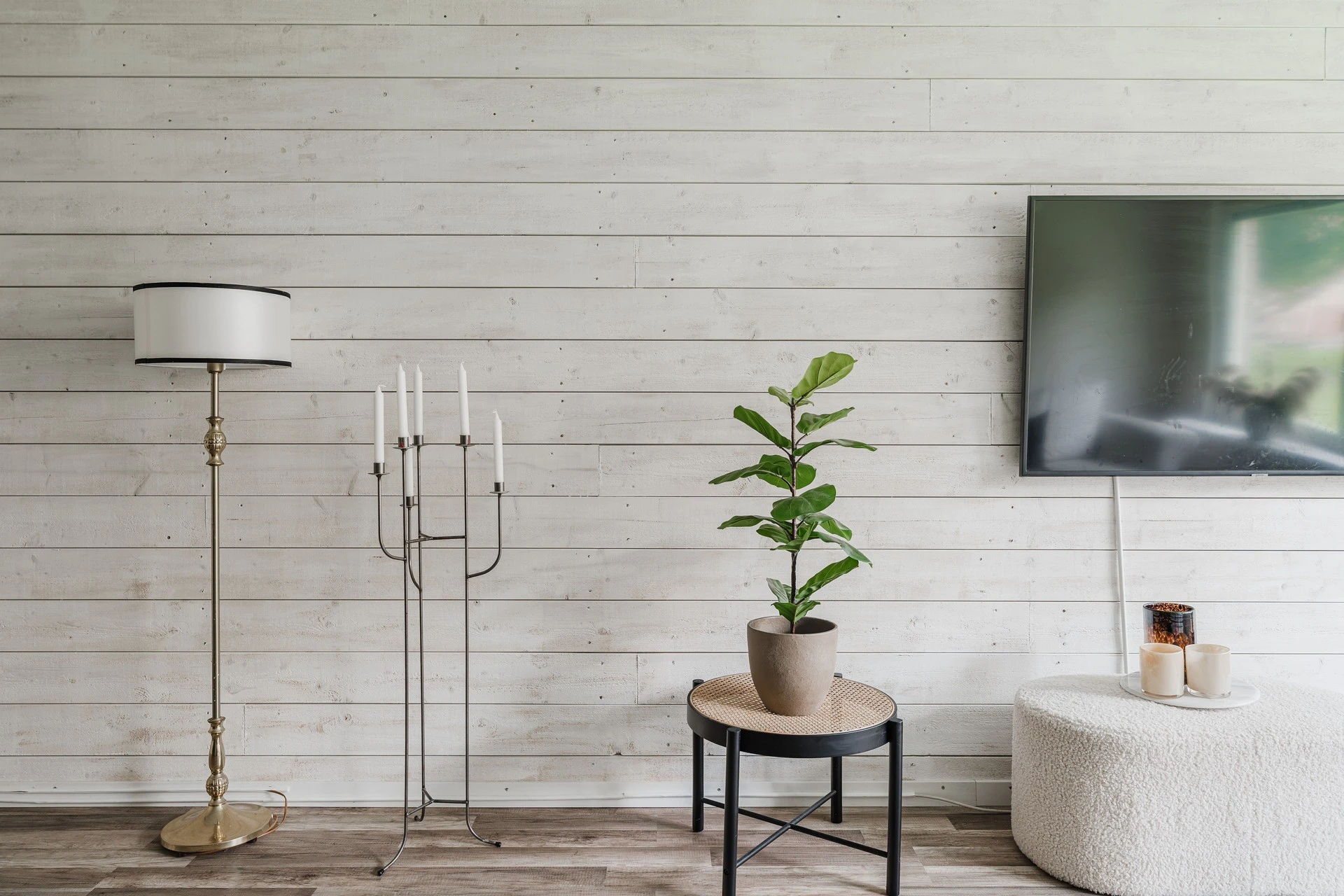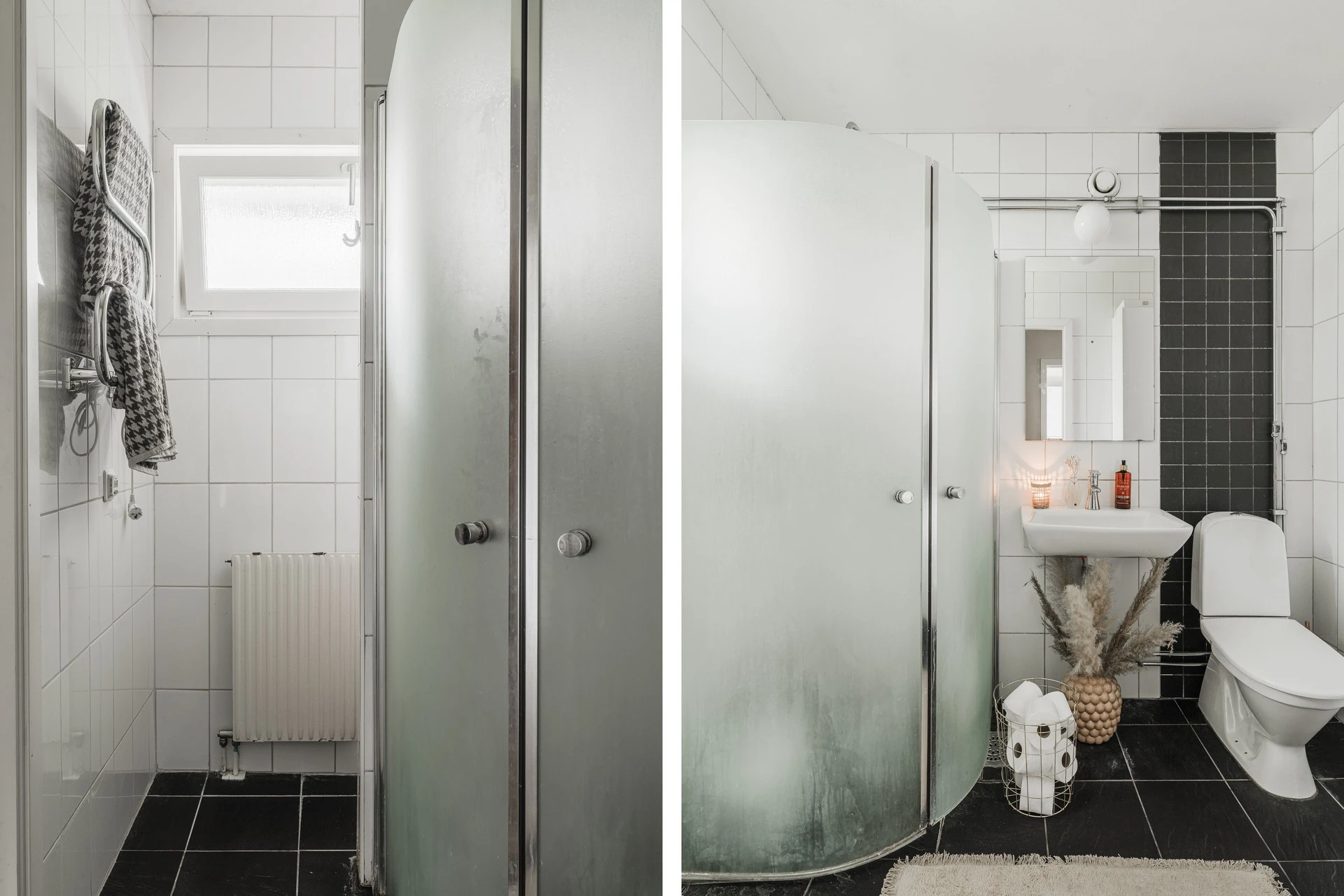 Badrummet som är helkaklat i vitt och grått har duschhörna samt bekvämligheter som handdukstork. Här finns även bra förvaring i klädkammaren som du når från hallen samt garderober i sovrum.