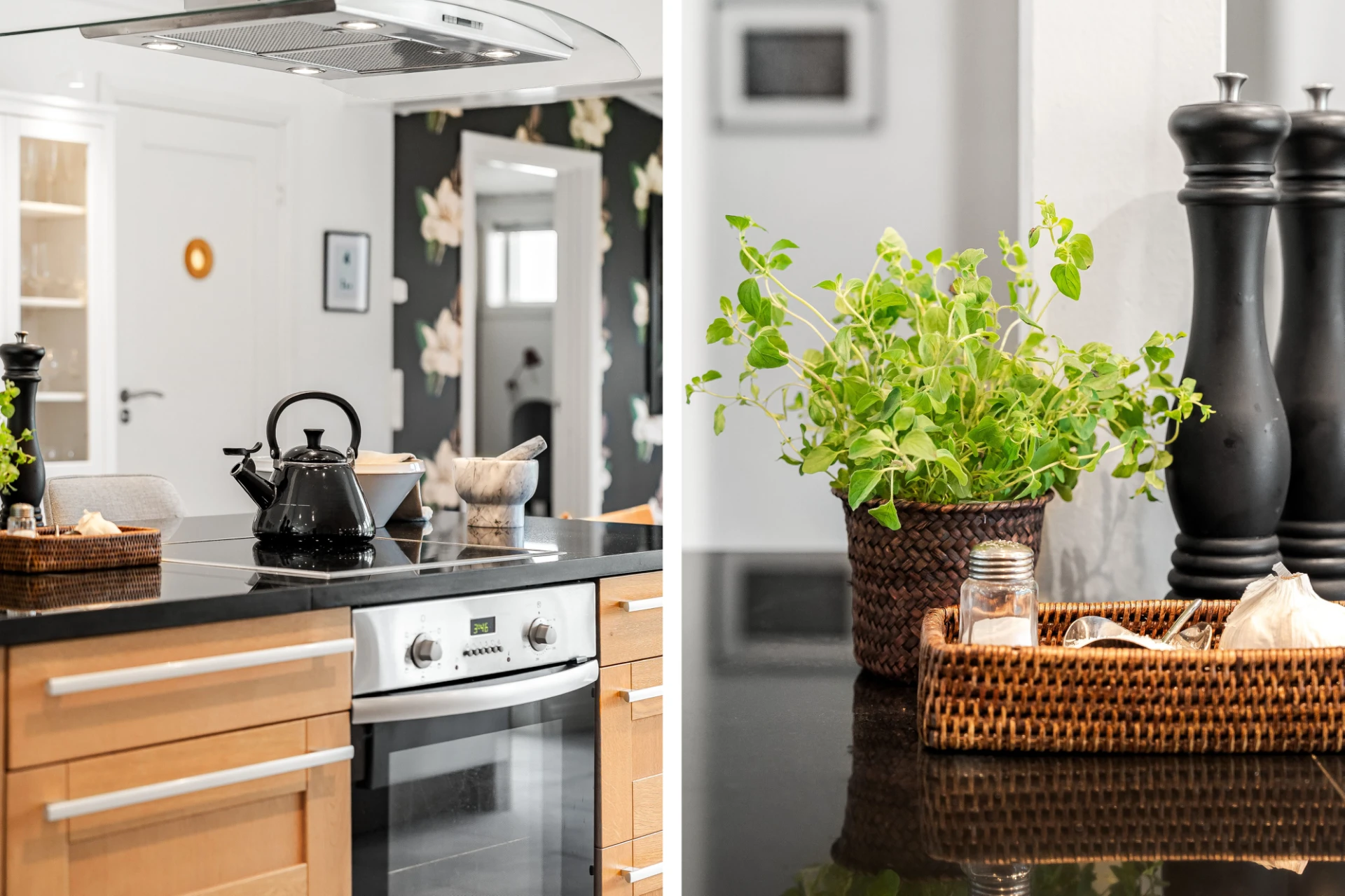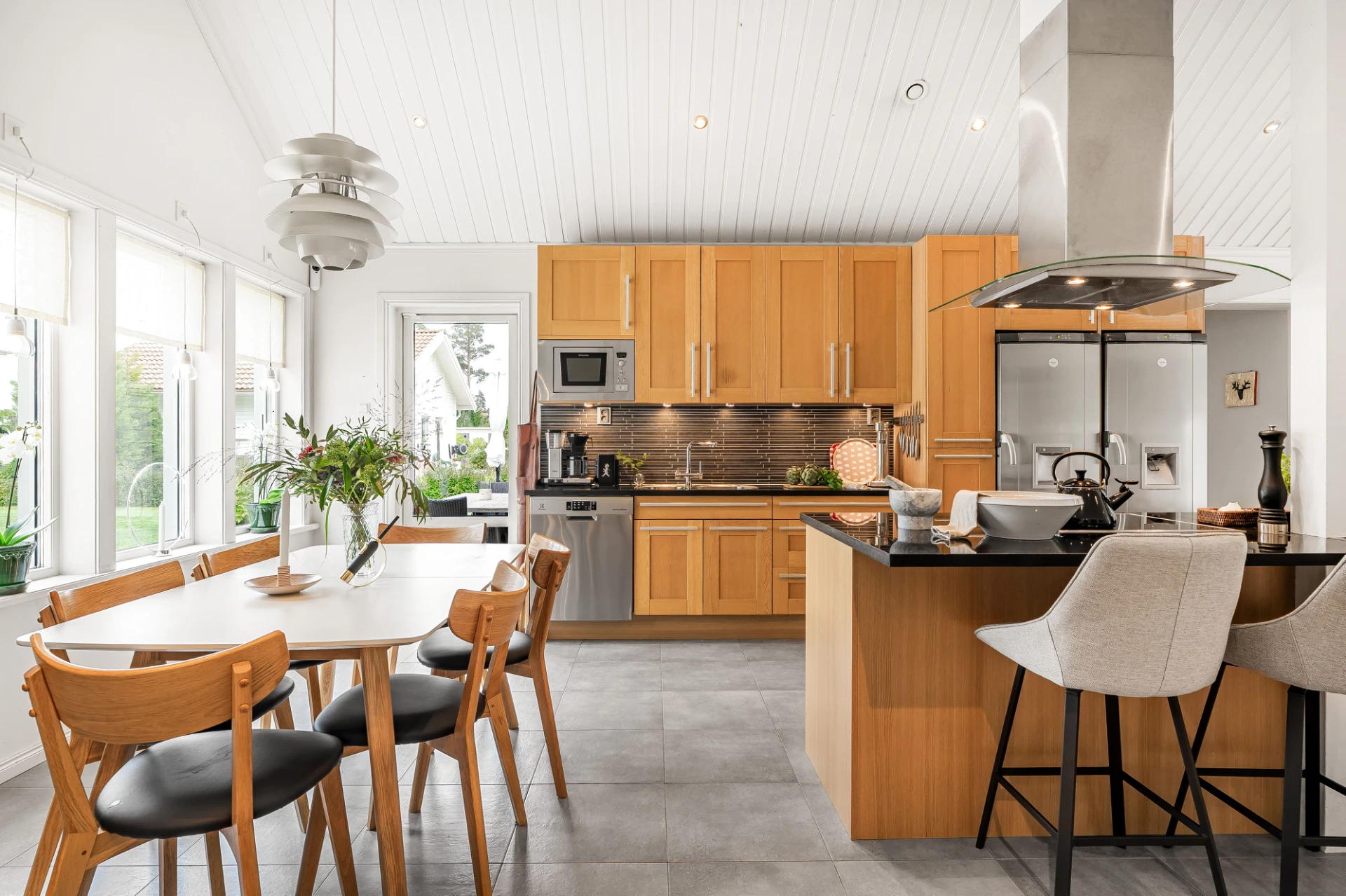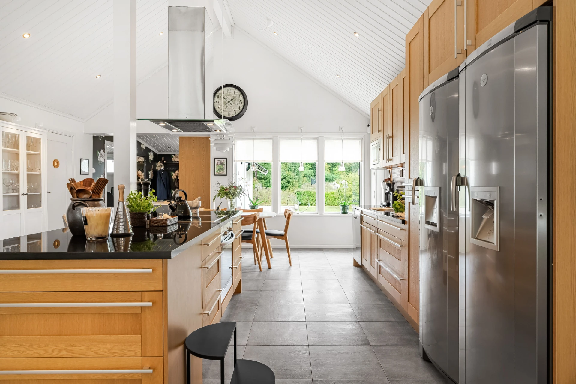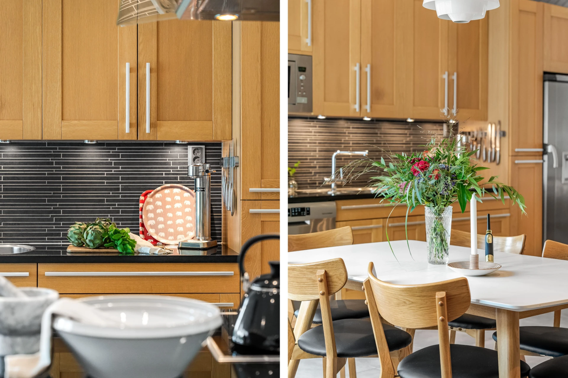 Grått klinkergolv och väggar i en ljus nyans. Spotlights i taket. Träfärgade skåpsluckor och svart kakel ovan bänkskivan i svart sten. Den maskinella utrustningen består av spishäll, spisfläkt, inbyggd ugn, inbyggd mikrovågsugn, diskmaskin samt kyl och frys i fullhöjd. Köksö med plats för 2 barstolar och matplats för 6-8 personer. Från köket nås bostadens stenlagda uteplats i nordostläge med plats för möblering.