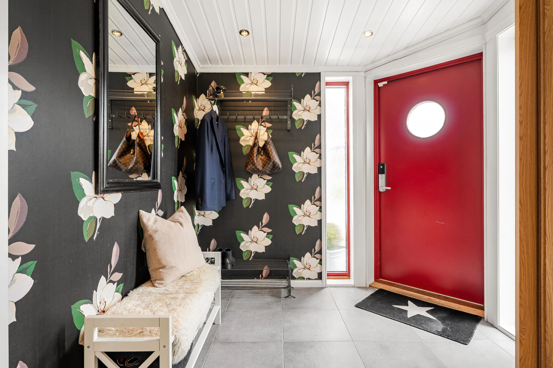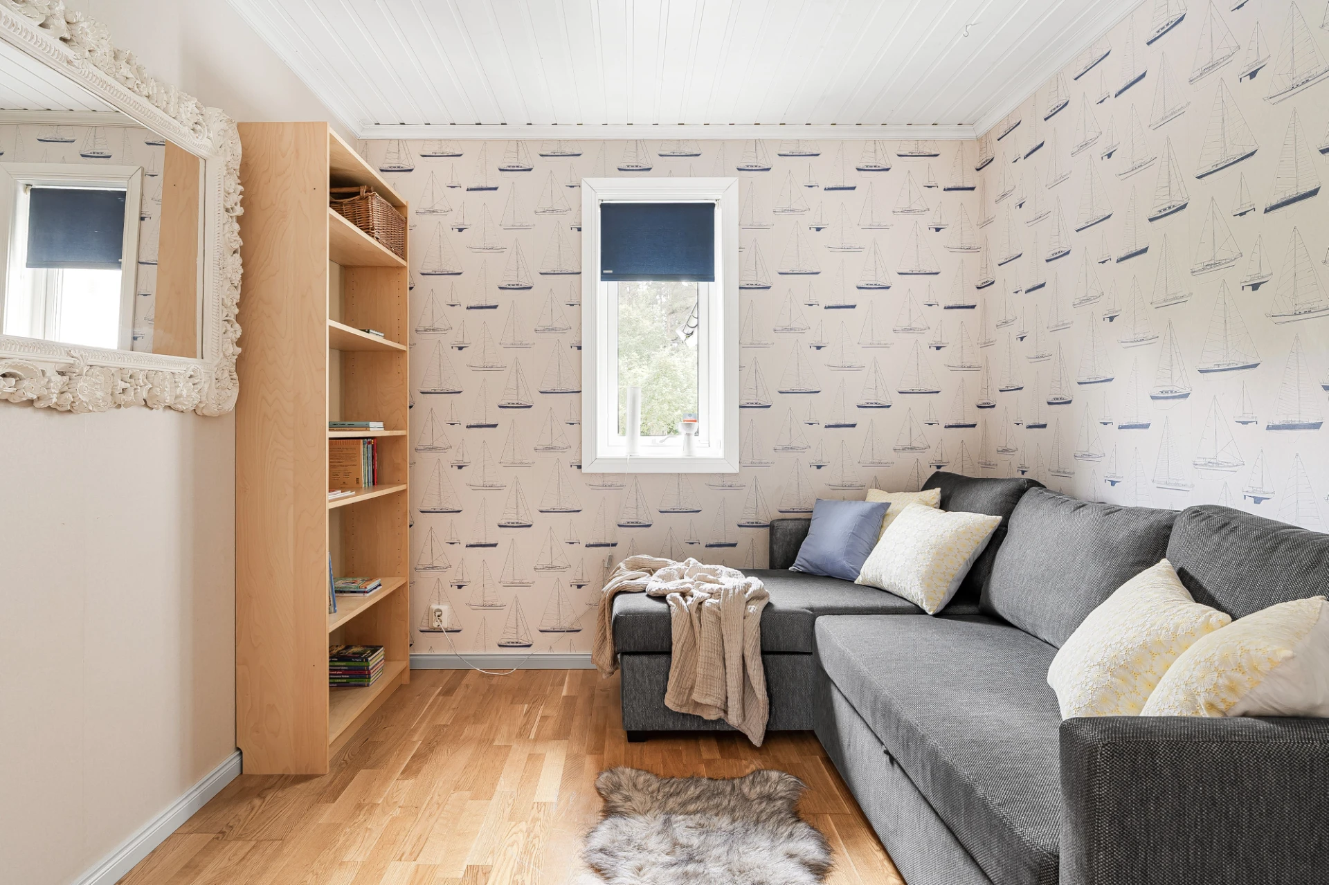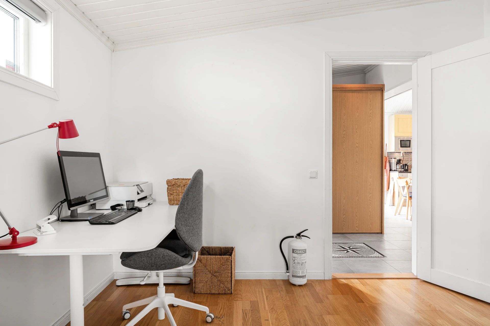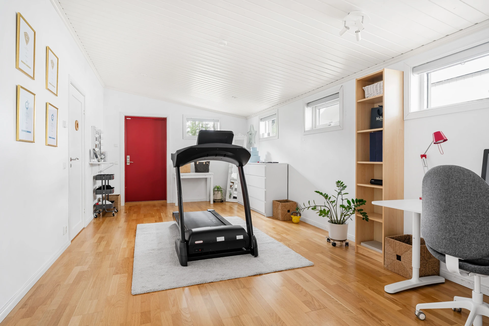 Parkettgolv och väggar i en ljus nyans. Rummet kan exempelvis användas som allrum, kontor, gym eller extra sovrum. Utgång till husets nordvästra sida.