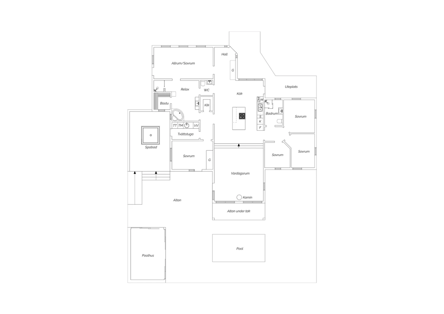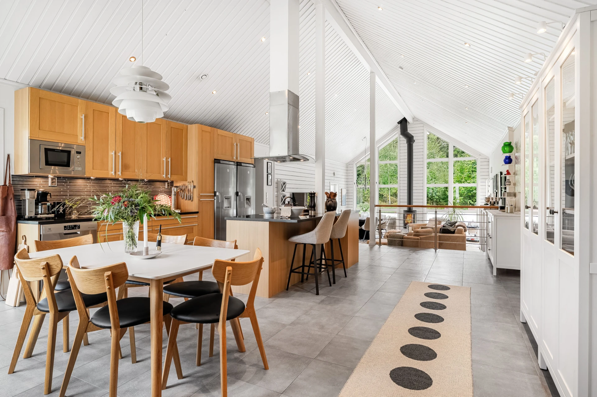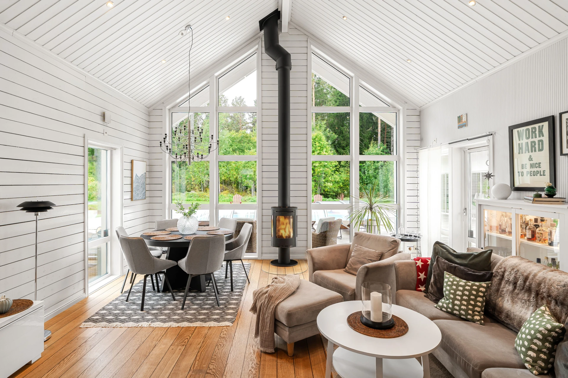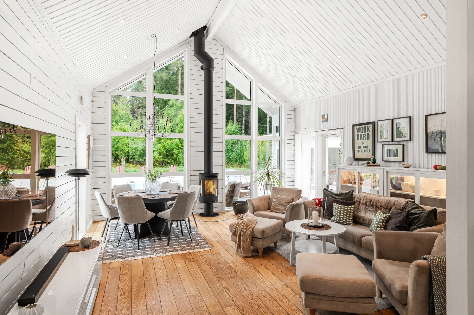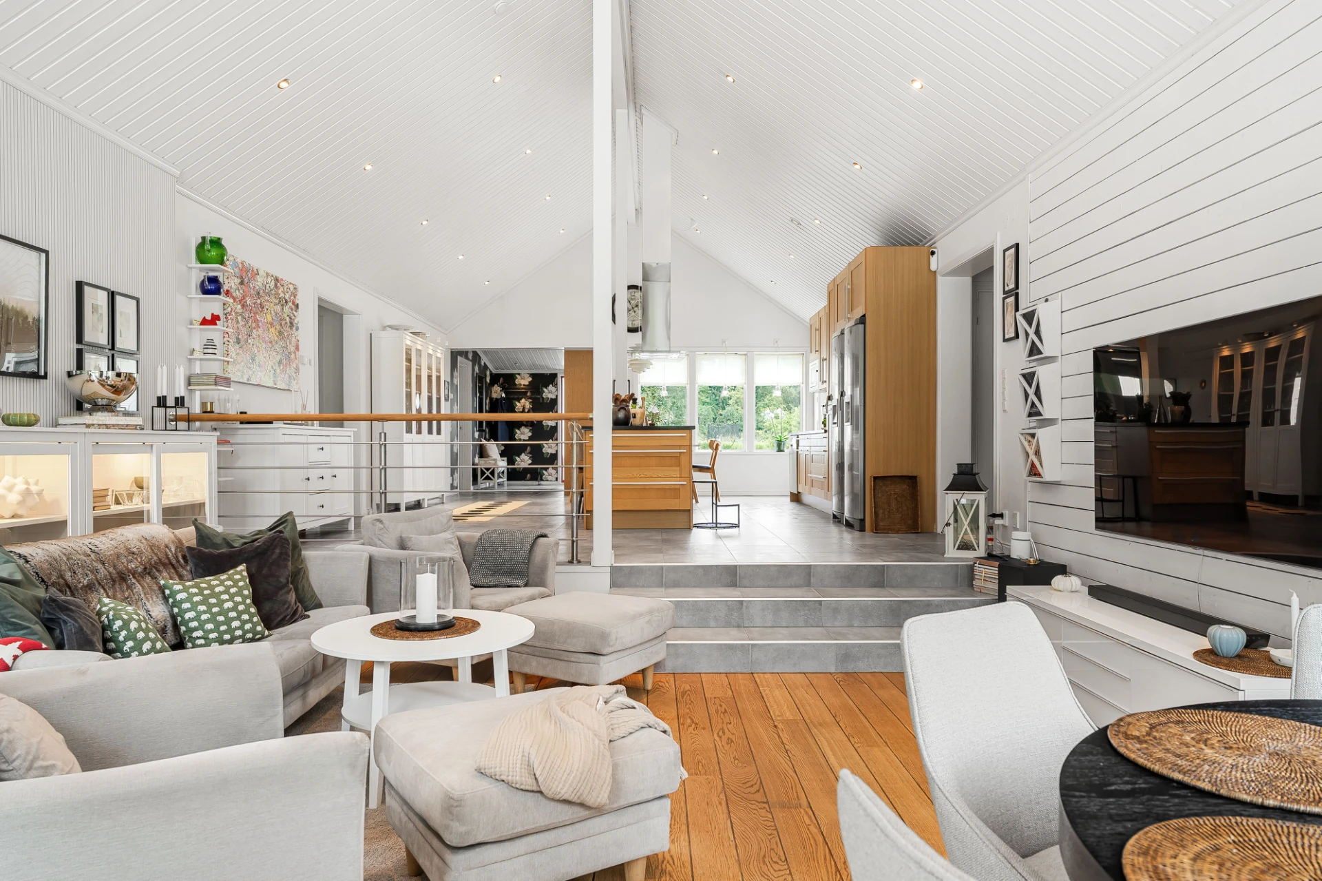 Trägolv och väggar i en ljus nyans och panel. Spotlights i taket. Kamin. Här finns plats för soffa med tillhörande möblemang och matplats för 6-8 personer. Från vardagsrummet nås bostadens pooldäck i sydvästläge med pool, poolhus, spabad och altan delvis under tak.