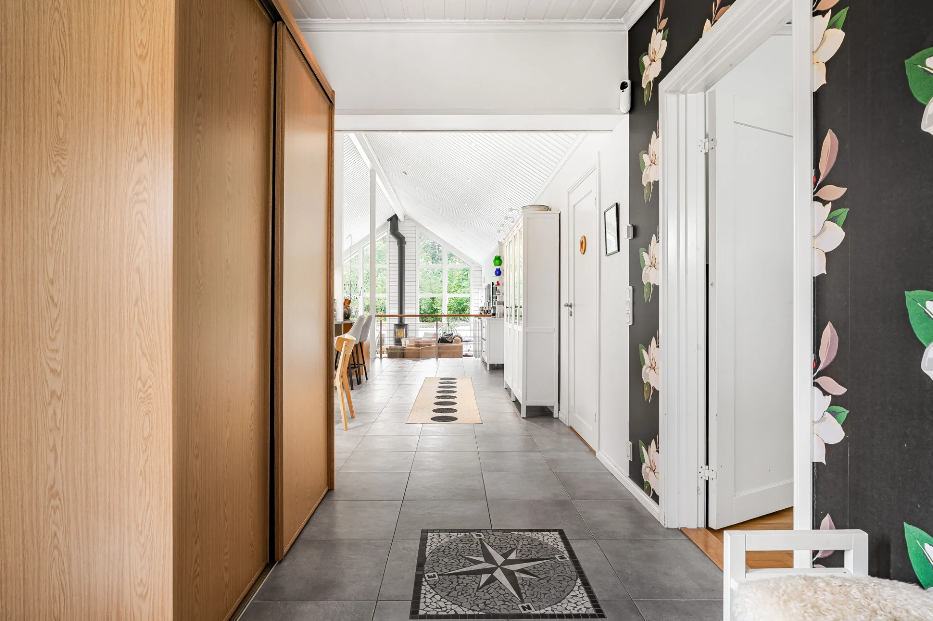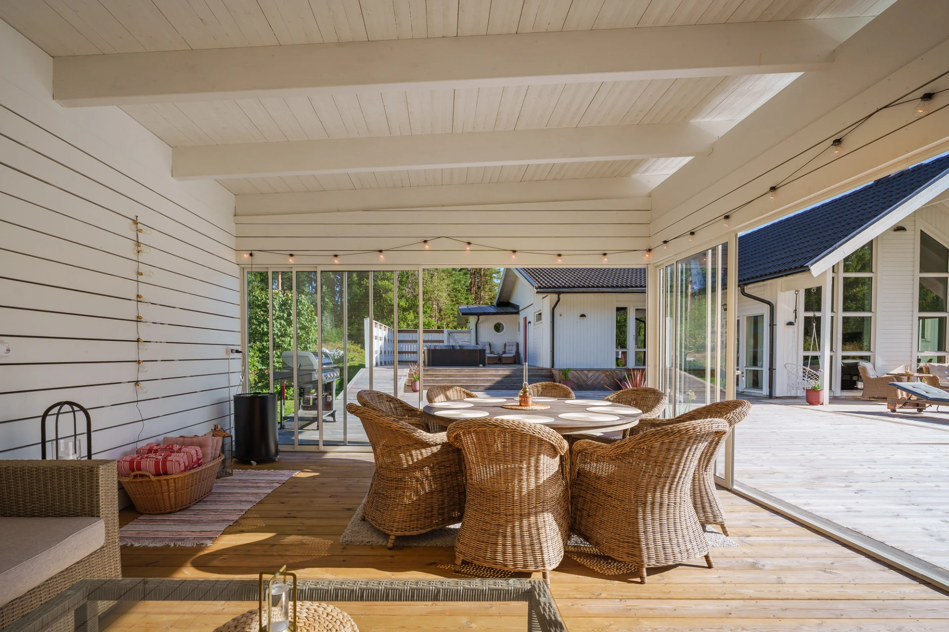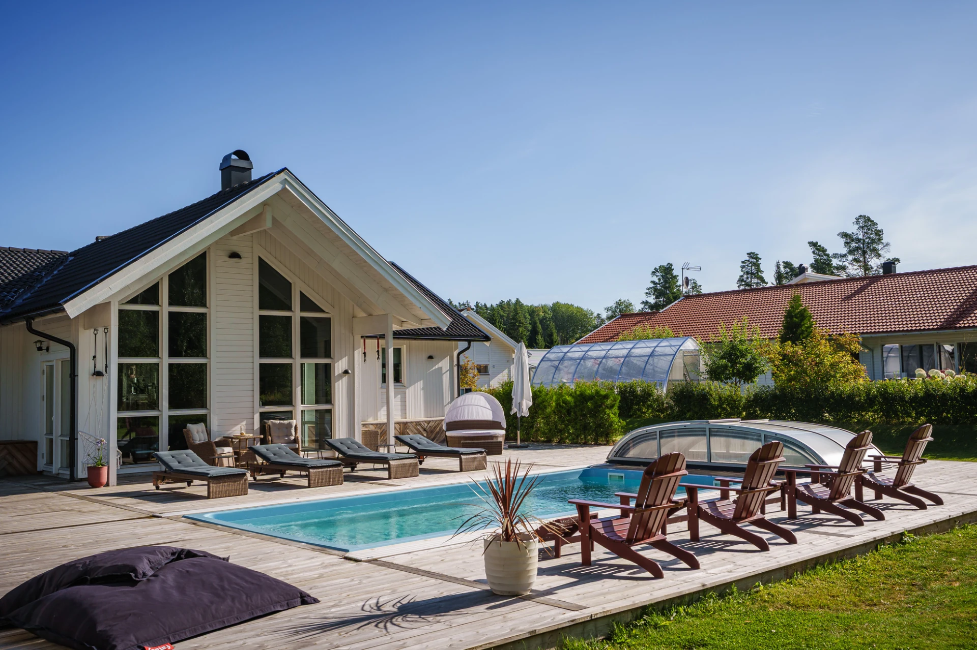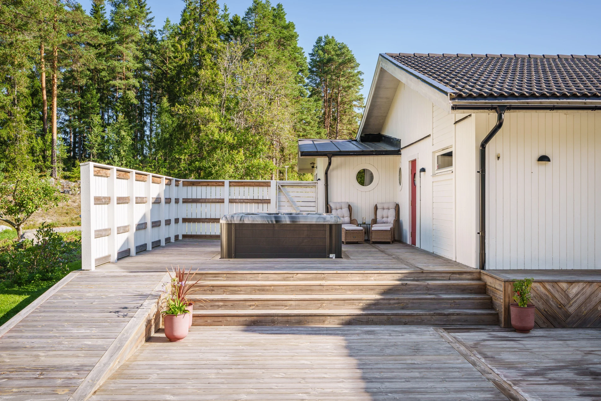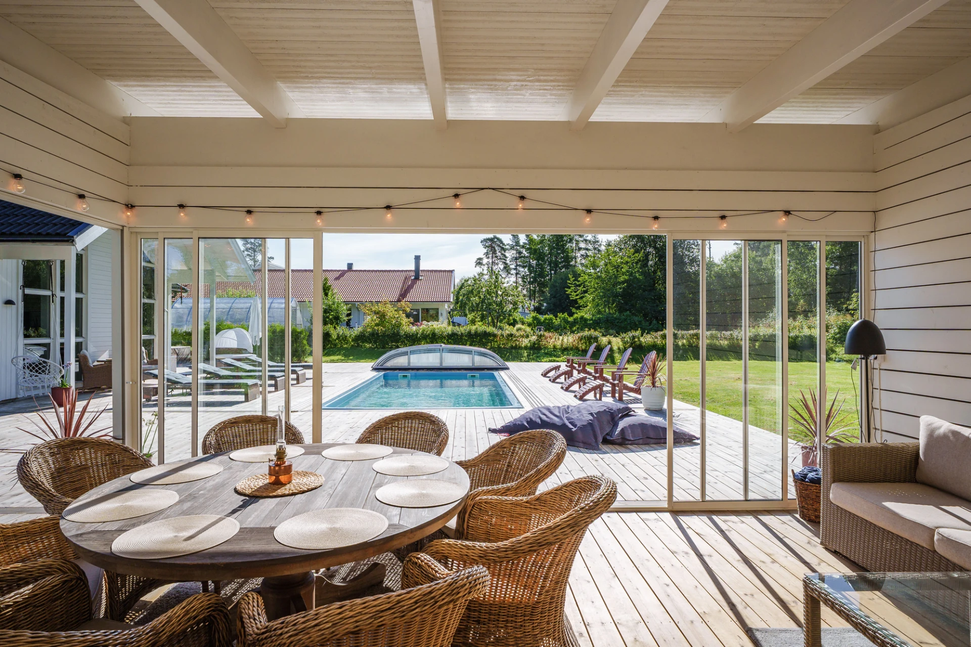 Trägolv och väggar i en ljus nyans och panel. Spotlights i taket. Kamin. Här finns plats för soffa med tillhörande möblemang och matplats för 6-8 personer. Från vardagsrummet nås bostadens pooldäck i sydvästläge med pool, poolhus, spabad och altan delvis under tak.