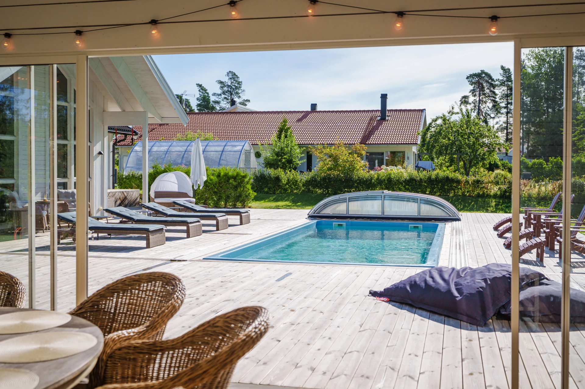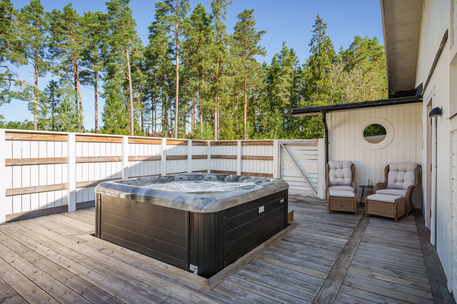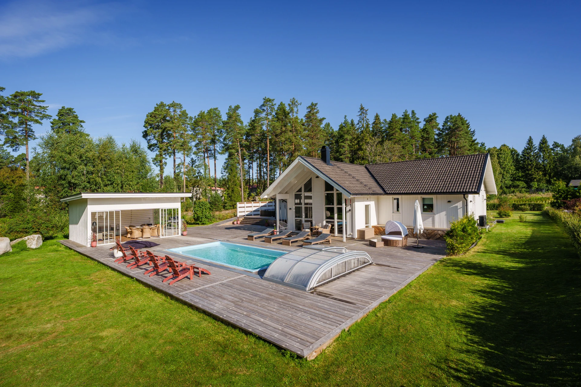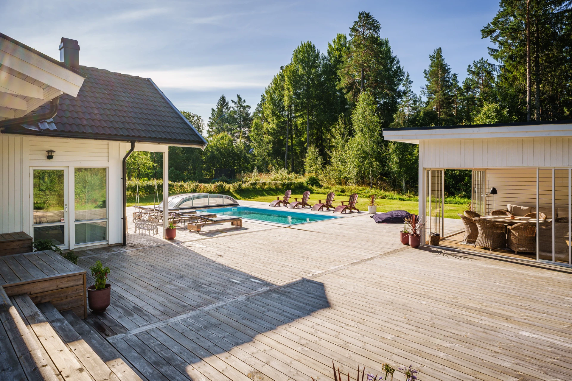 Trägolv och väggar i en ljus nyans och panel. Spotlights i taket. Kamin. Här finns plats för soffa med tillhörande möblemang och matplats för 6-8 personer. Från vardagsrummet nås bostadens pooldäck i sydvästläge med pool, poolhus, spabad och altan delvis under tak.