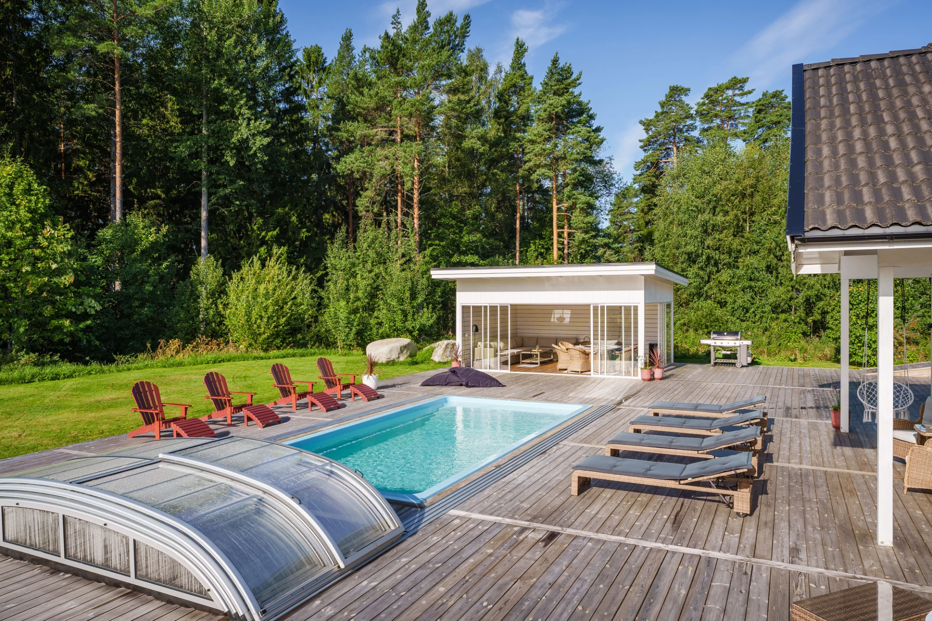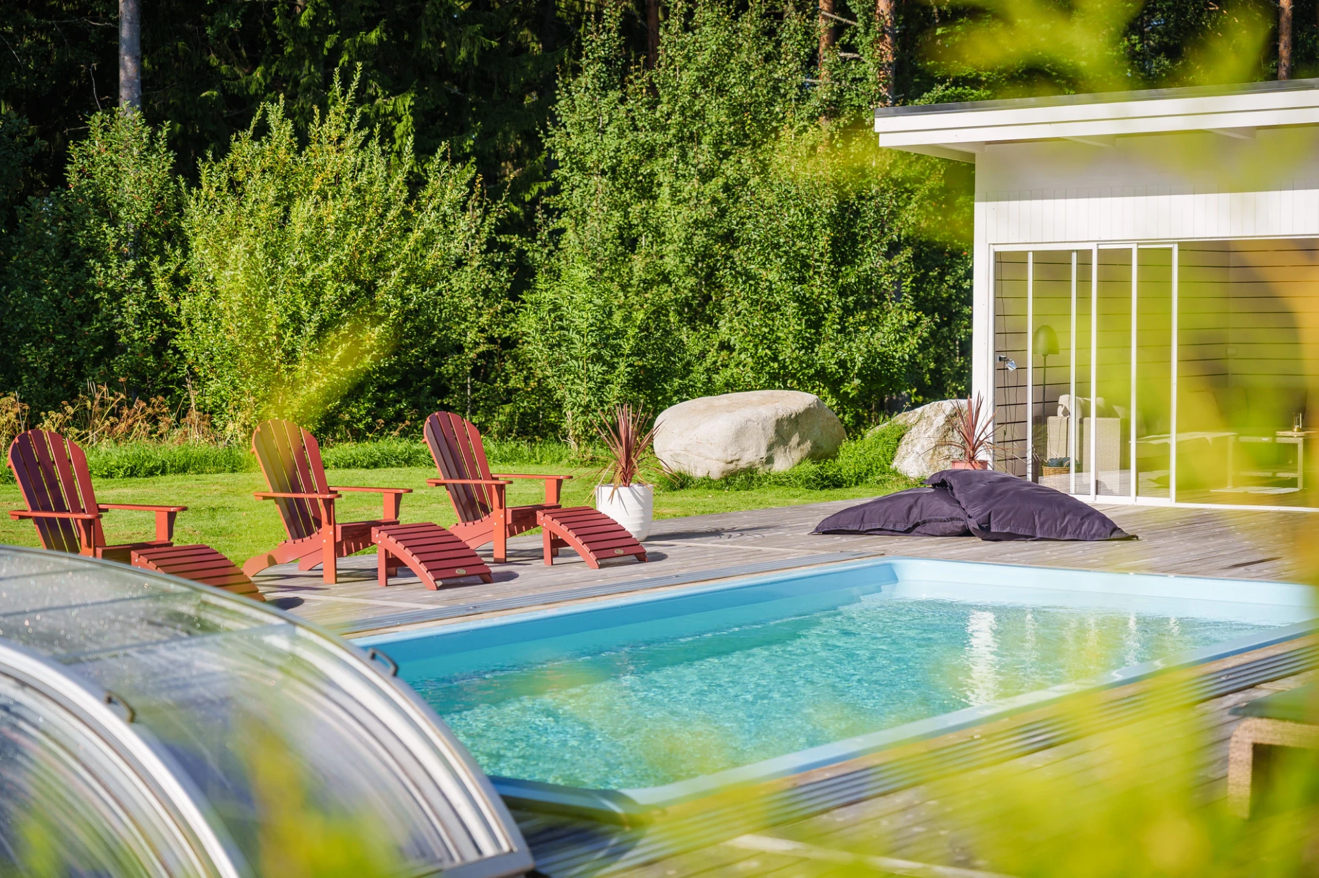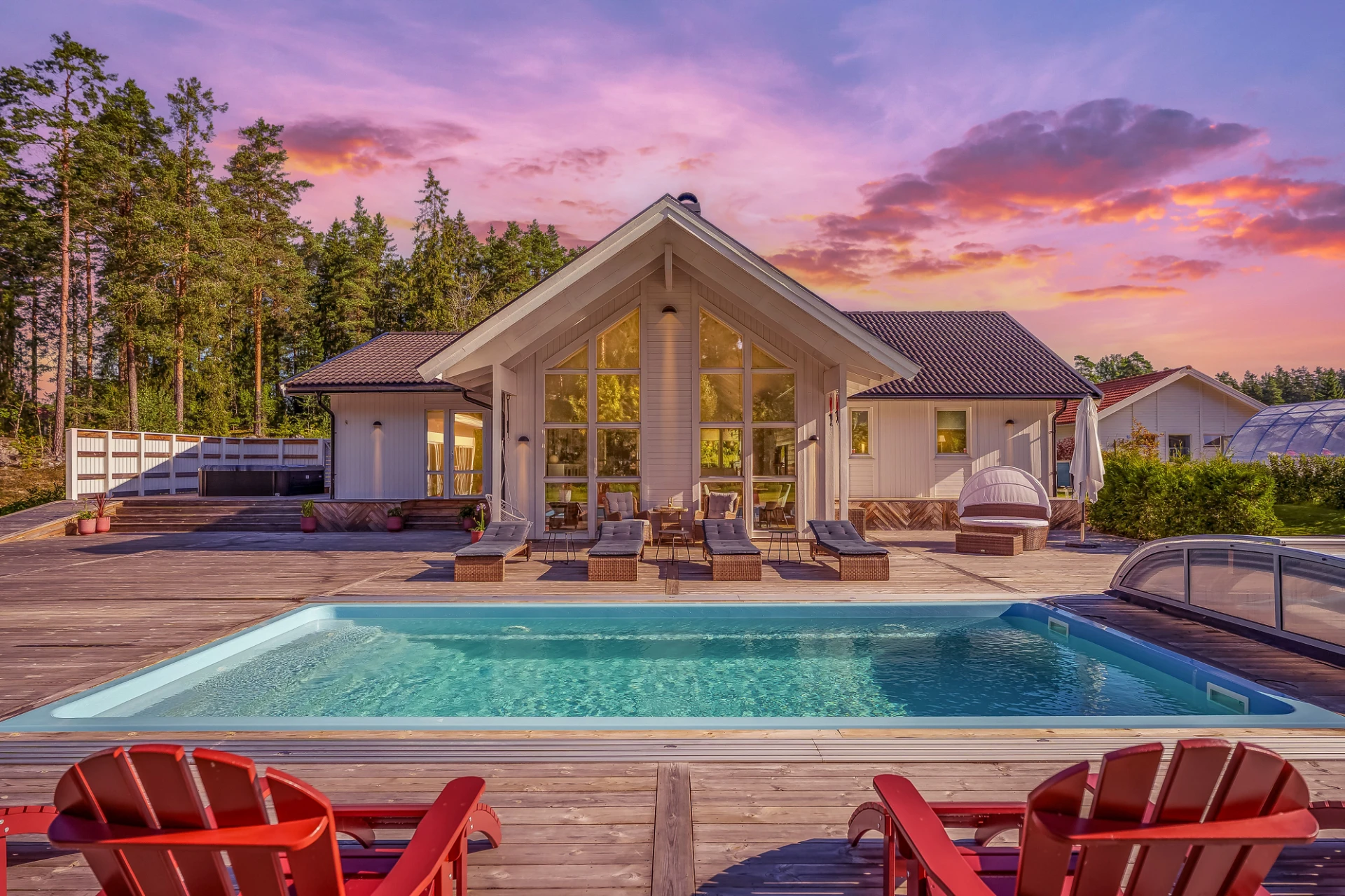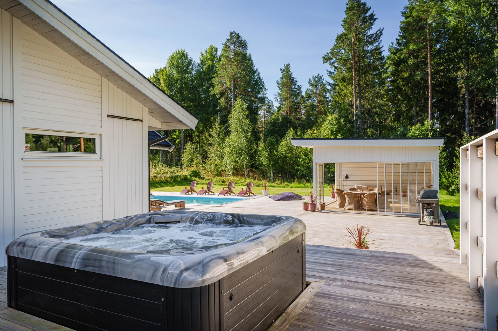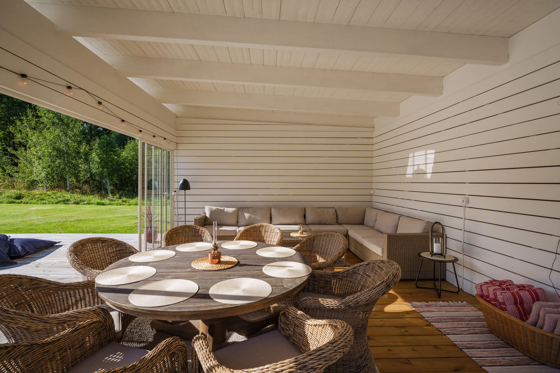 Trägolv och väggar i en ljus nyans och panel. Spotlights i taket. Kamin. Här finns plats för soffa med tillhörande möblemang och matplats för 6-8 personer. Från vardagsrummet nås bostadens pooldäck i sydvästläge med pool, poolhus, spabad och altan delvis under tak.