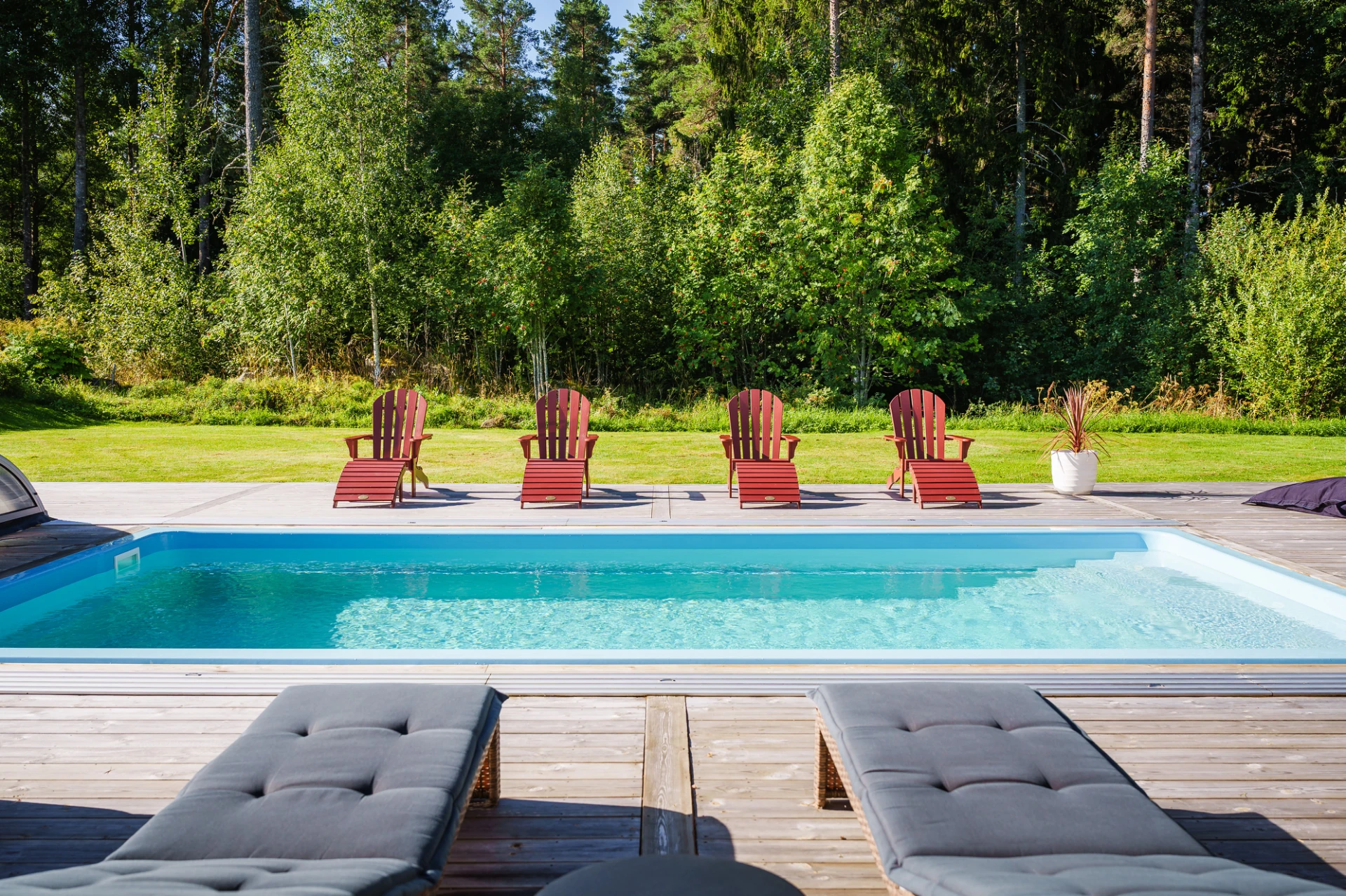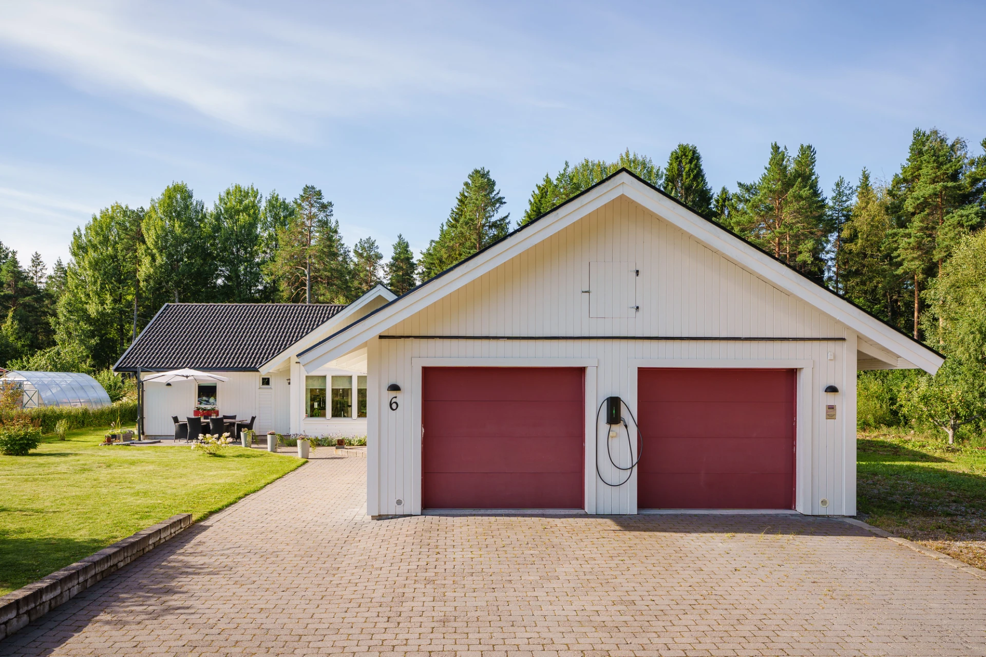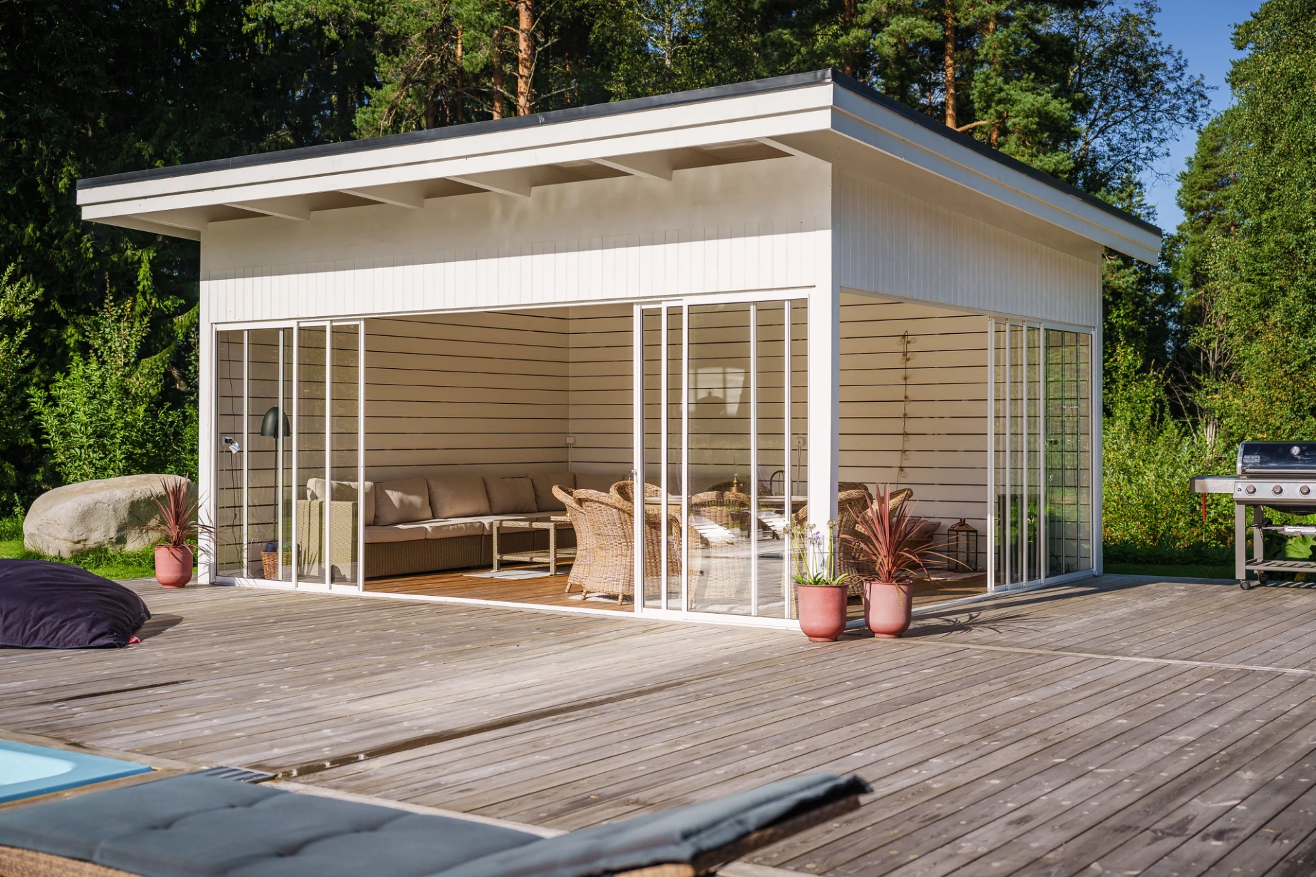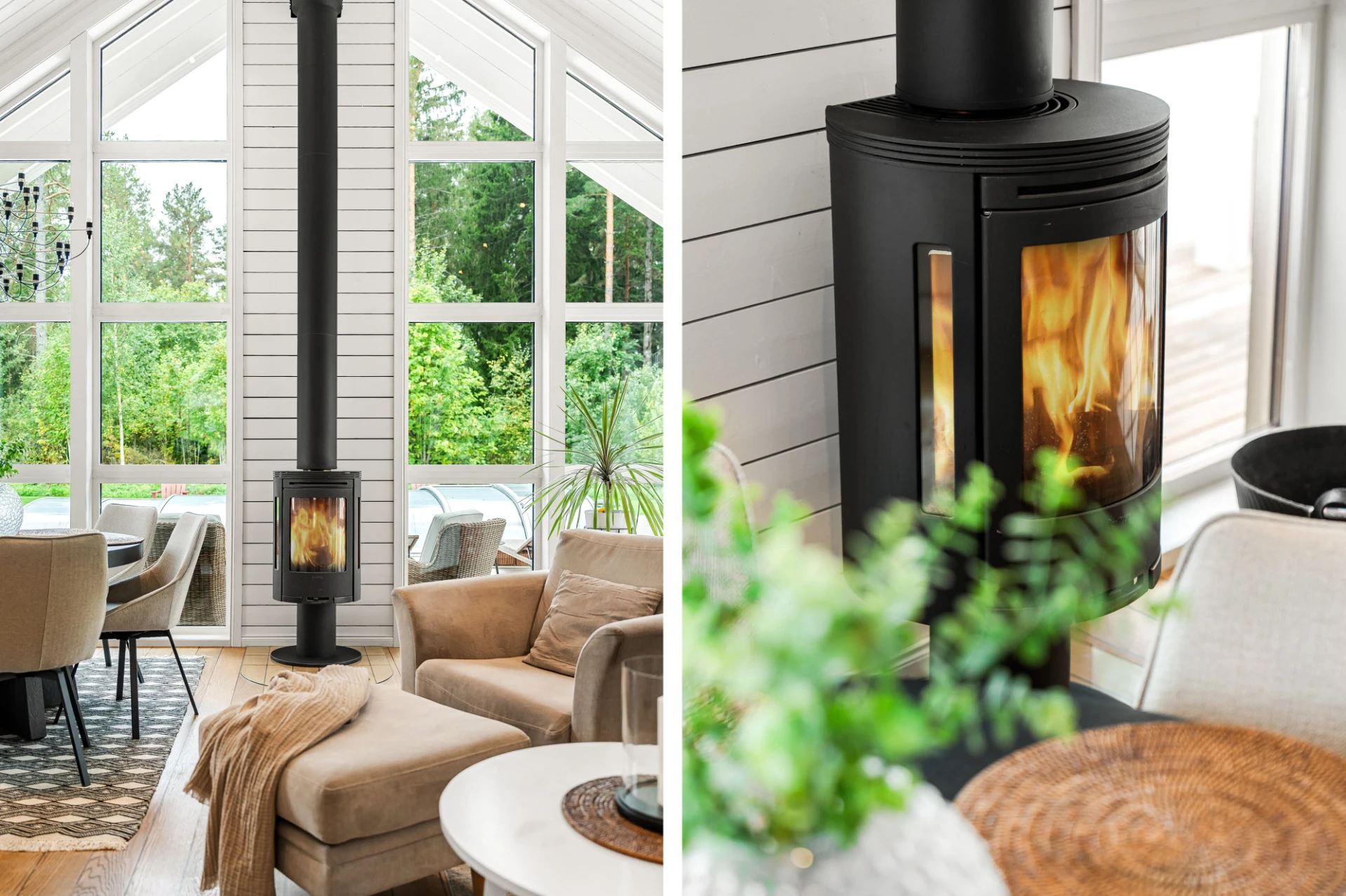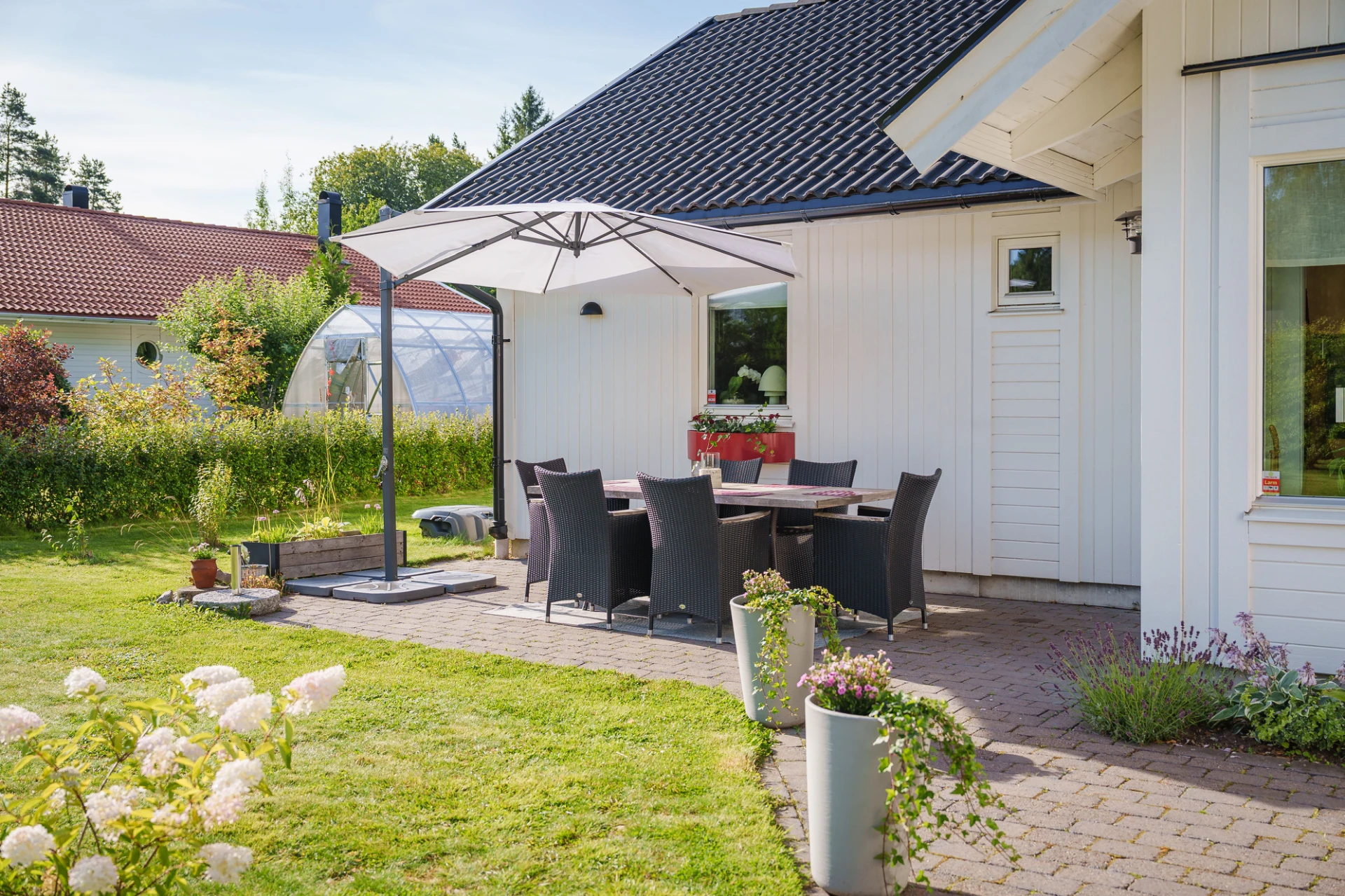 Trägolv och väggar i en ljus nyans och panel. Spotlights i taket. Kamin. Här finns plats för soffa med tillhörande möblemang och matplats för 6-8 personer. Från vardagsrummet nås bostadens pooldäck i sydvästläge med pool, poolhus, spabad och altan delvis under tak.