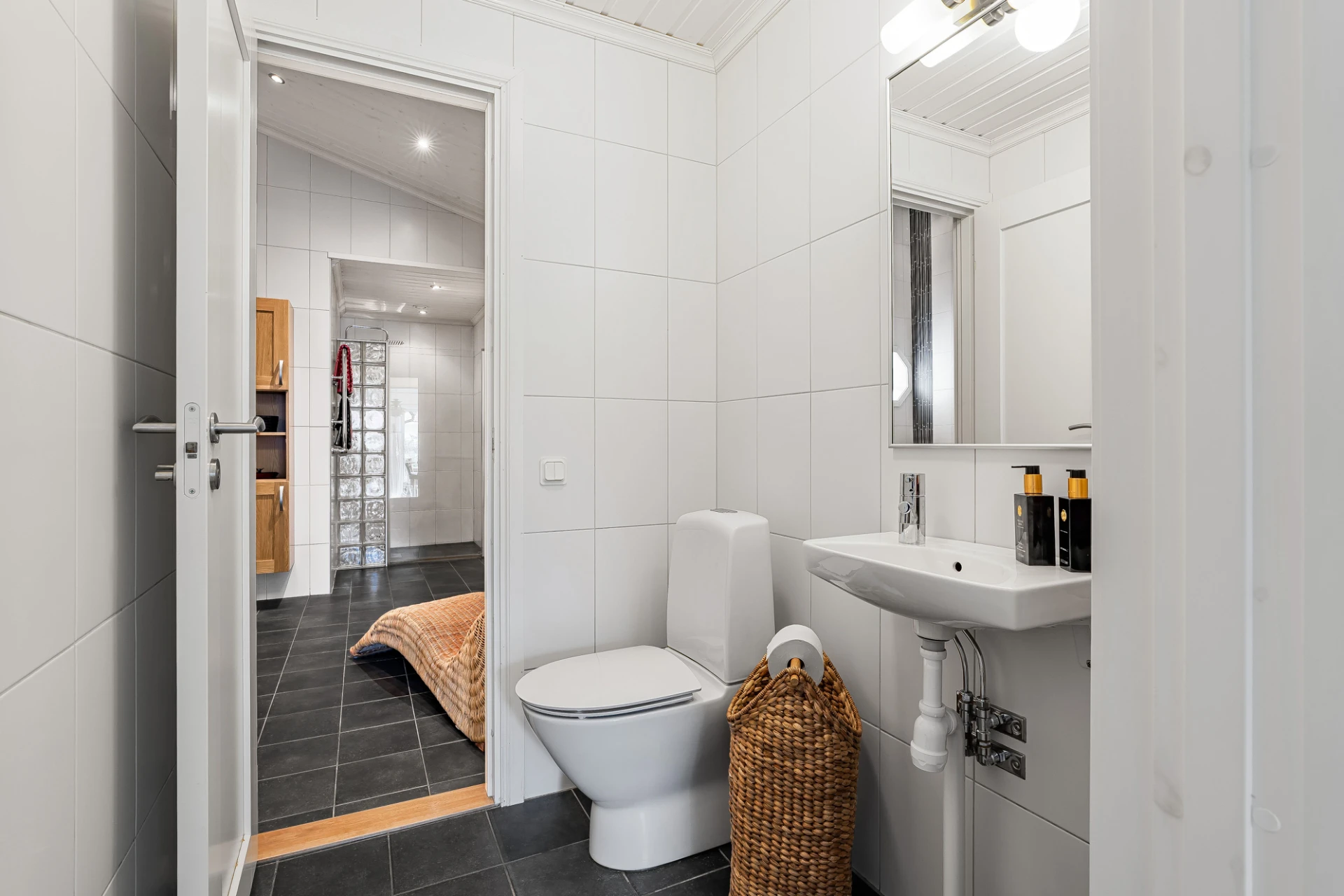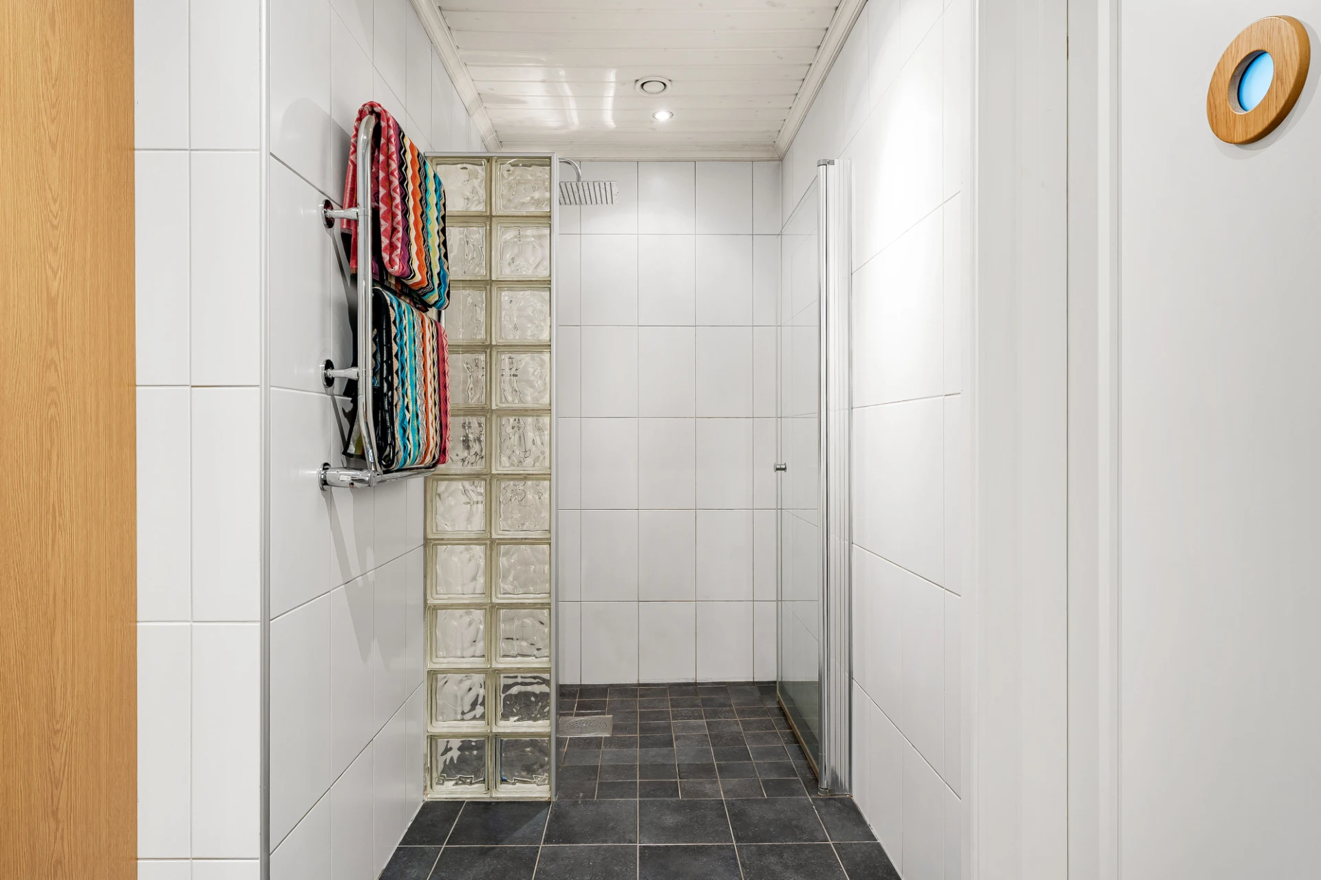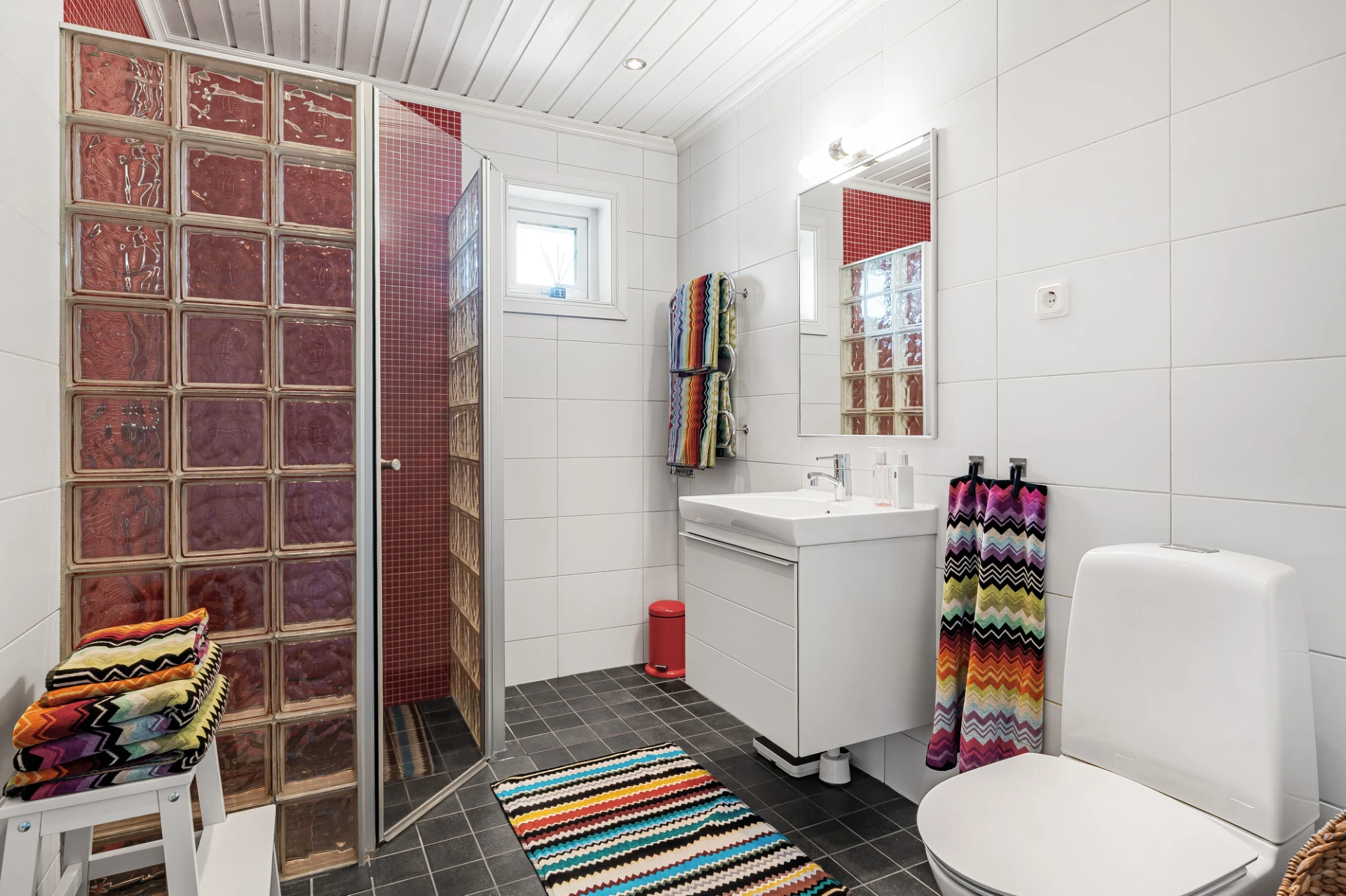 Mörkgrått klinkergolv och helkaklade väggar i vitt samt röd mosaik i duschhörnan. Spotlights i taket. Badrummet är utrustat med WC, handfat med kommod, handdukstork och dusch med glasdörr.