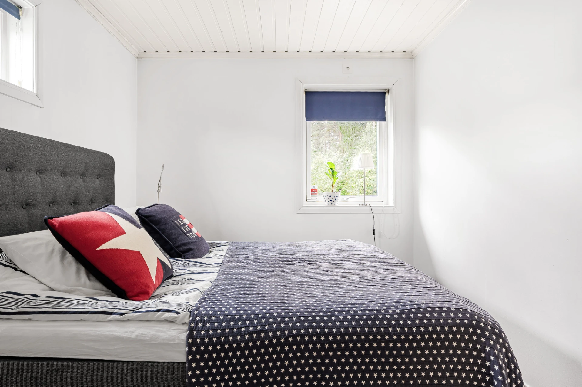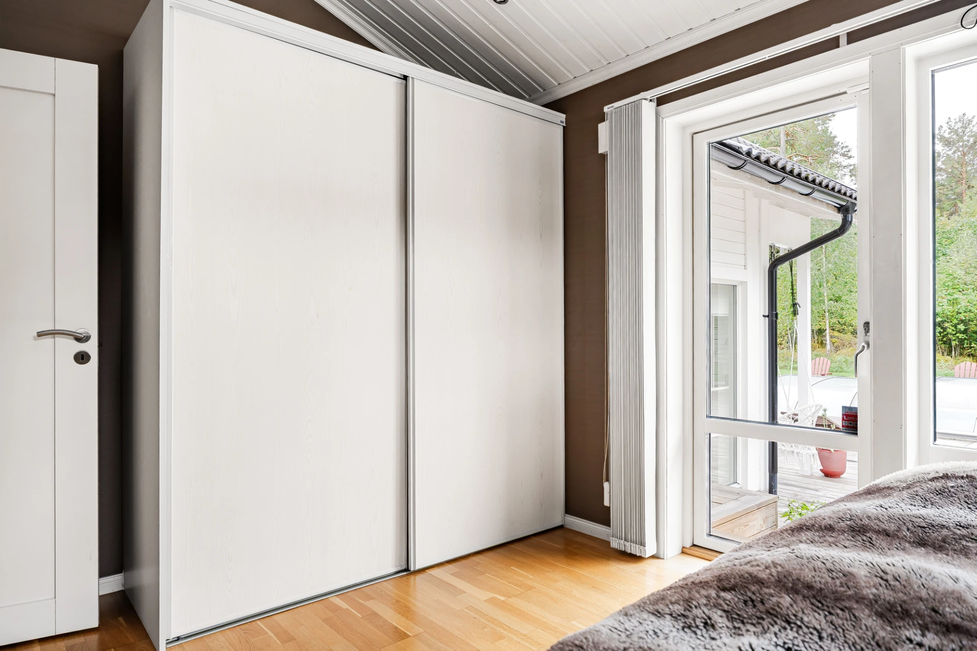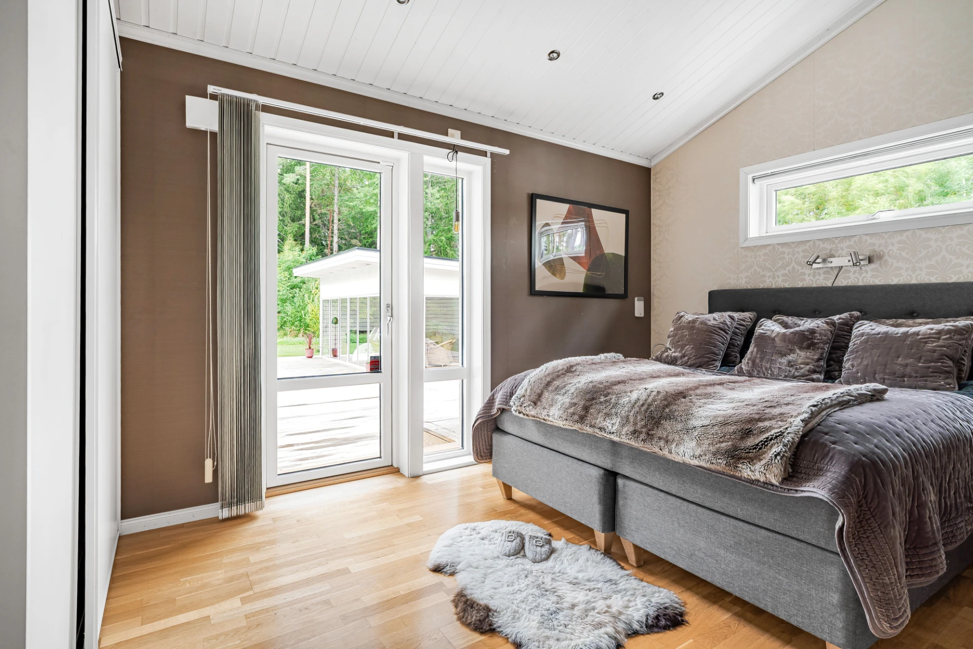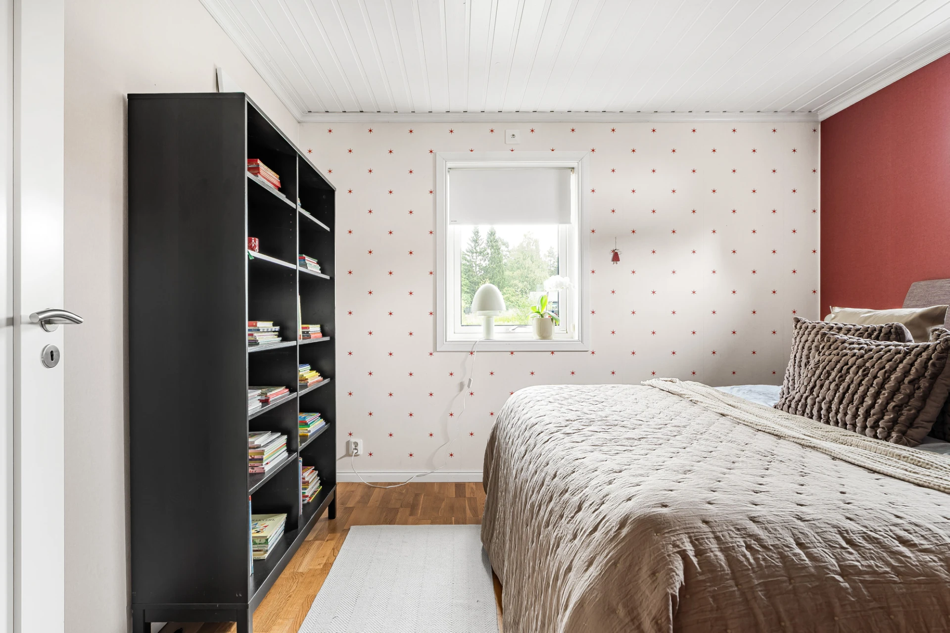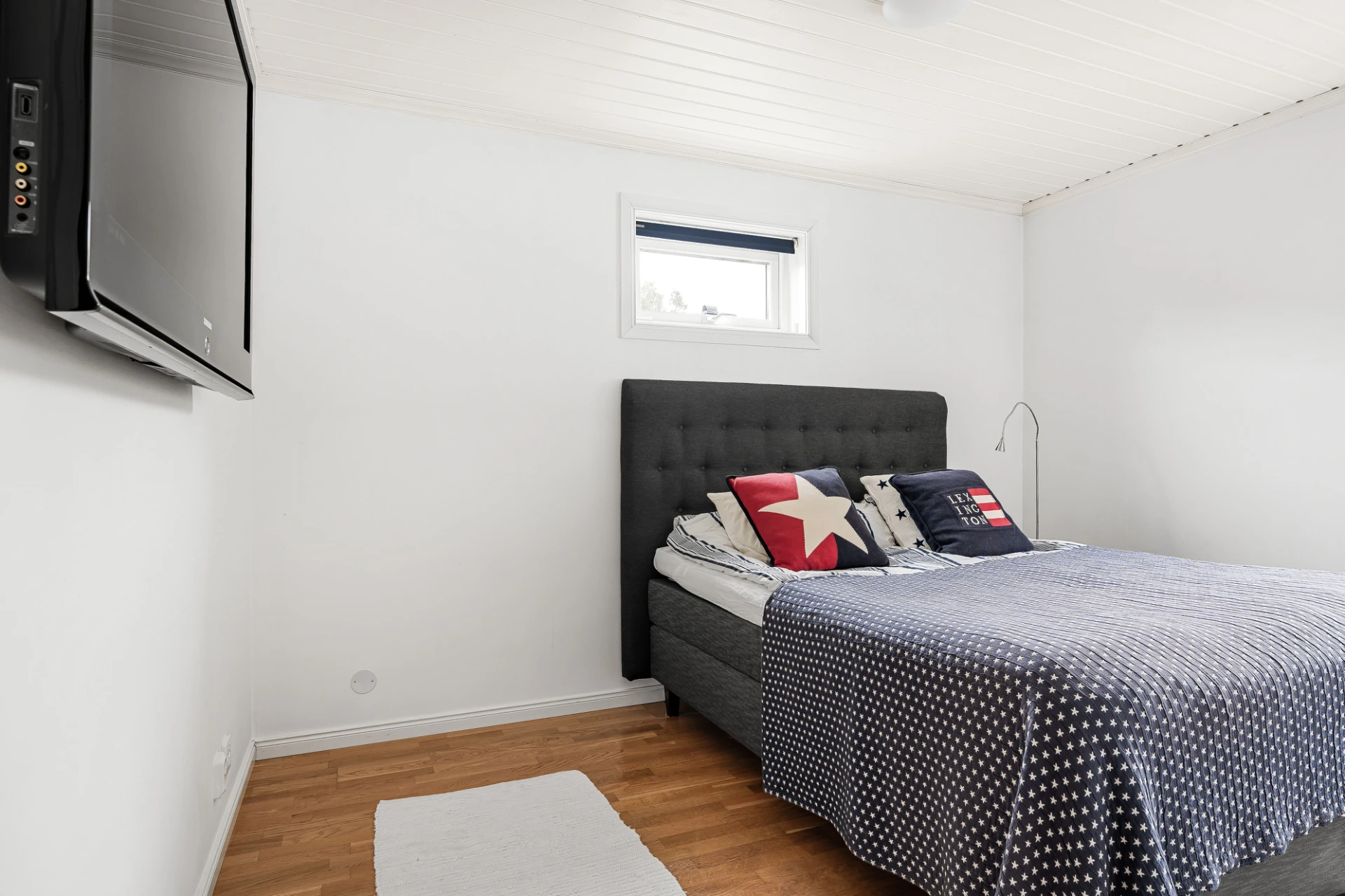 Parkettgolv och väggar i en ljus nyans. Här finns plats för dubbelsäng med tillhörande möblemang.