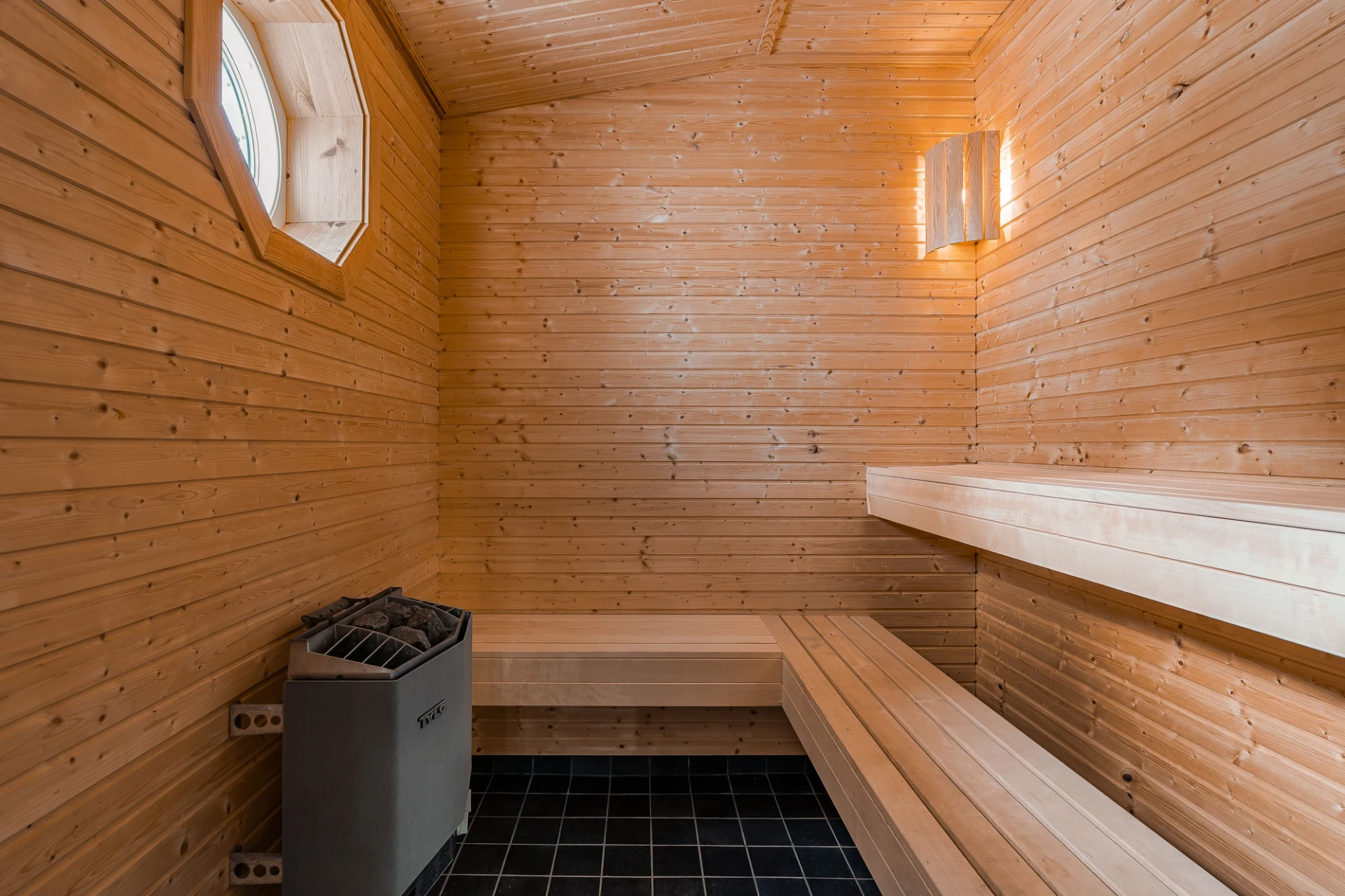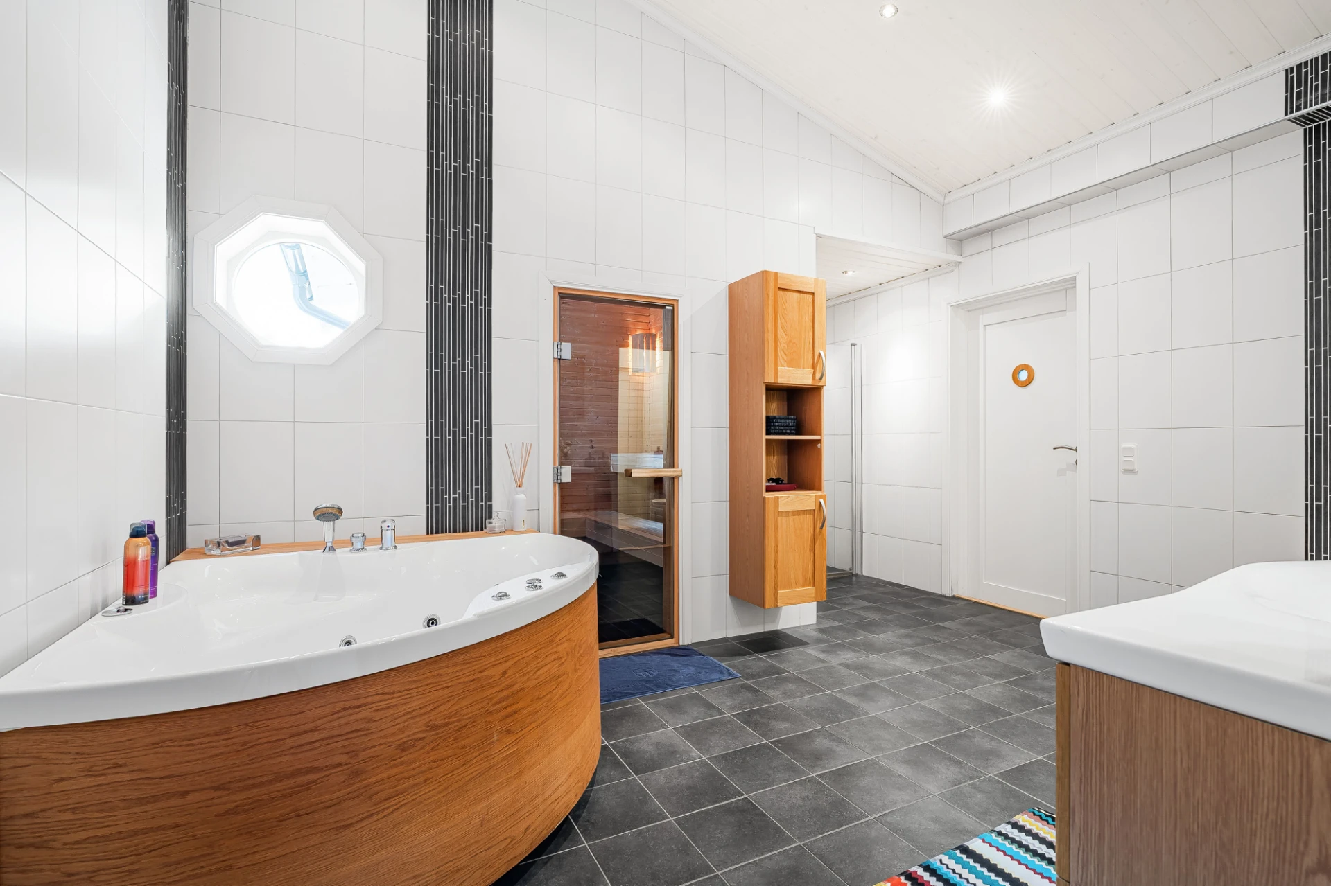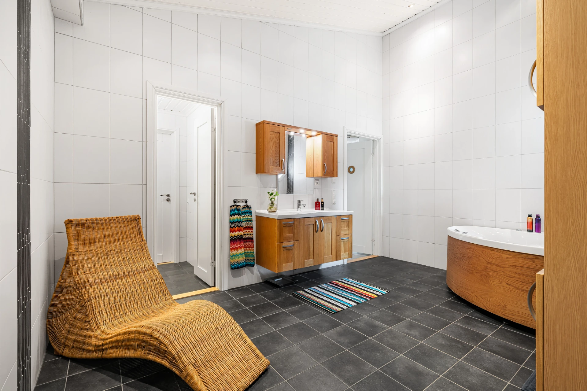 Mörkgrått klinkergolv och helkaklade väggar i vitt med svart bård. Spotlights i taket. Relaxen är utrustad med spabad, bastu, dusch med glasdörr och handfat med kommod. Anslutande gäst-WC med WC och handfat.