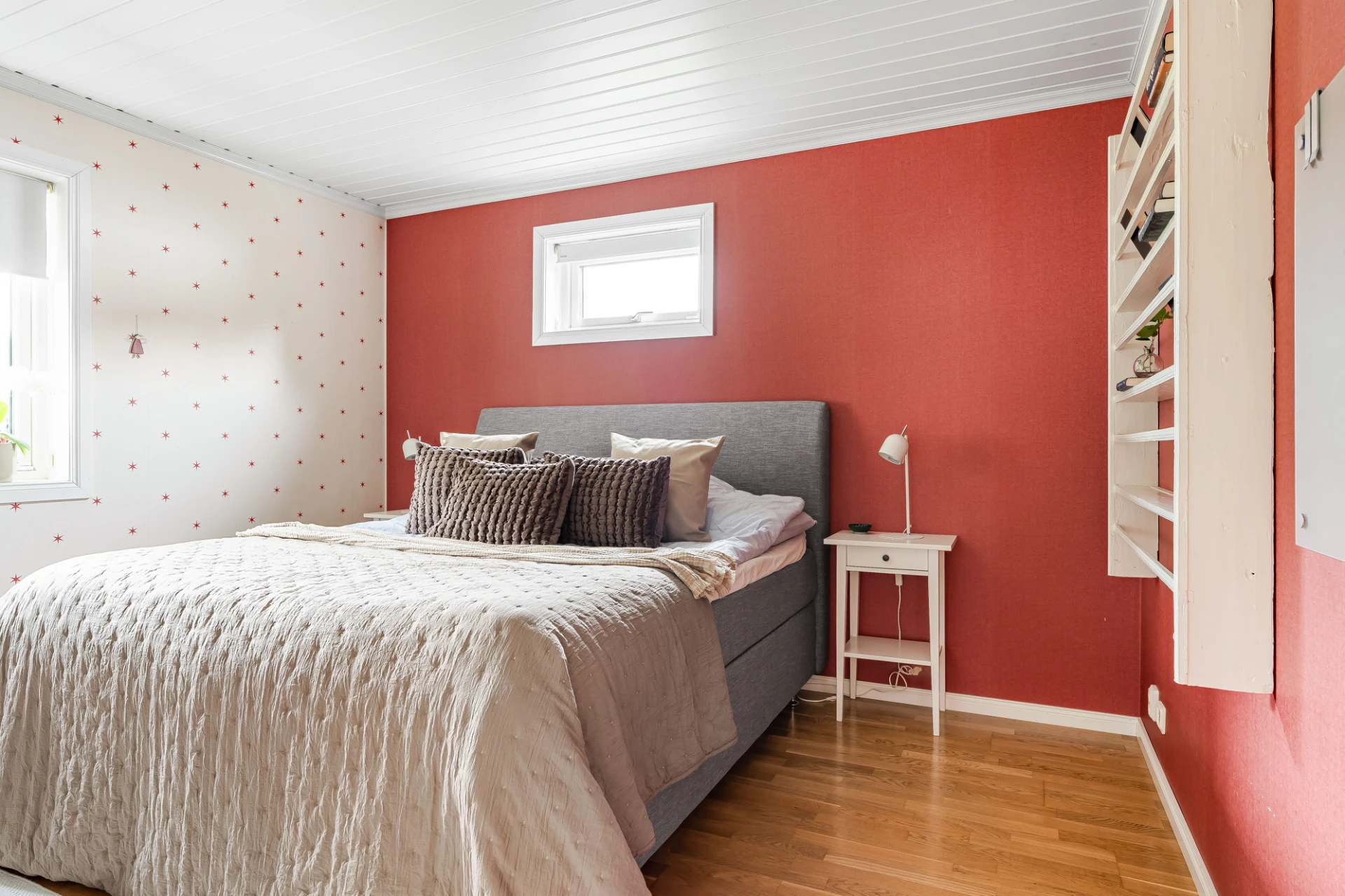 Parkettgolv och väggar i rött samt en ljus nyans med röda prickar. Här finns plats för dubbelsäng med tillhörande möblemang. Plats att sätta upp garderober.