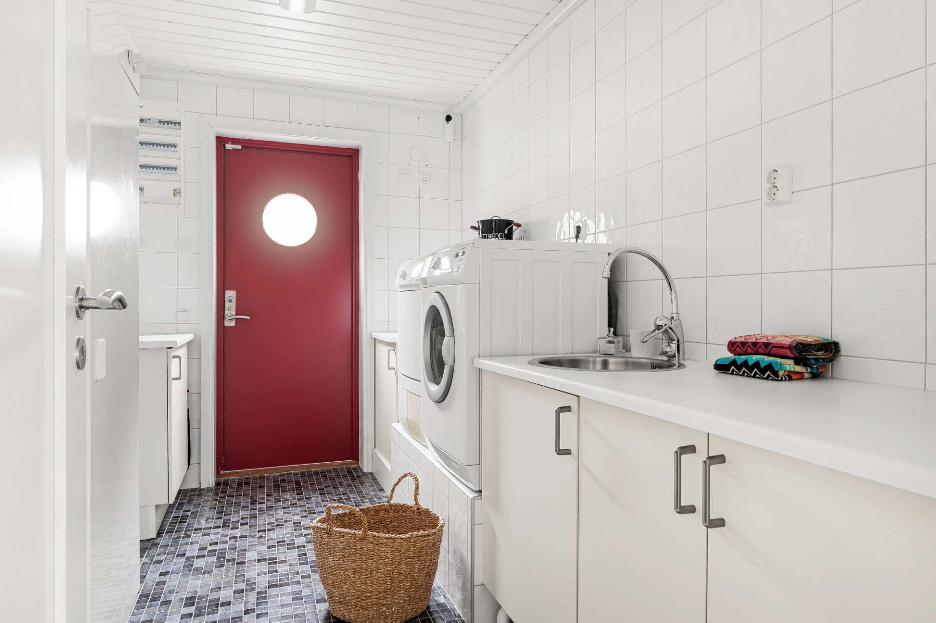 Klinkergolv och helkaklade väggar i vitt. Utrustad med tvättmaskin, torktumlare, tvättho, förvaringsskåp ooch arbetsbänk. Groventré med utgång till pooldäcket.