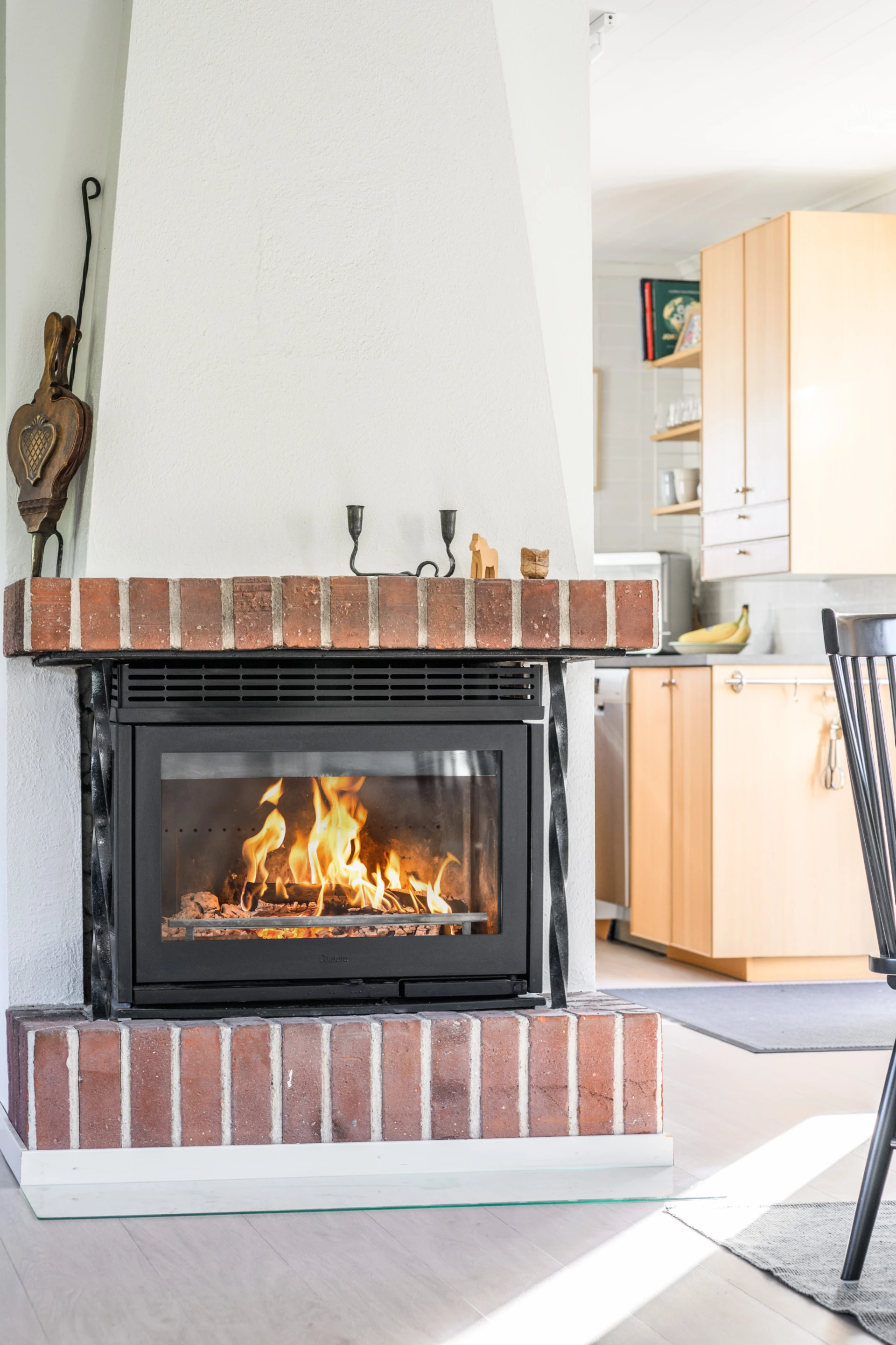 Det praktiska köket är utrustat med bra arbetsytor, alla nödvändiga vitvaror och bjuder på en vacker vy mot havet. Köket ligger i öppen planlösning med matplats och vardagsrum, vilket skapar en social och inbjudande atmosfär. Bostaden värms upp av både luftvärmepump och en stämningsfull öppen spis – perfekt för mysiga kvällar året om.