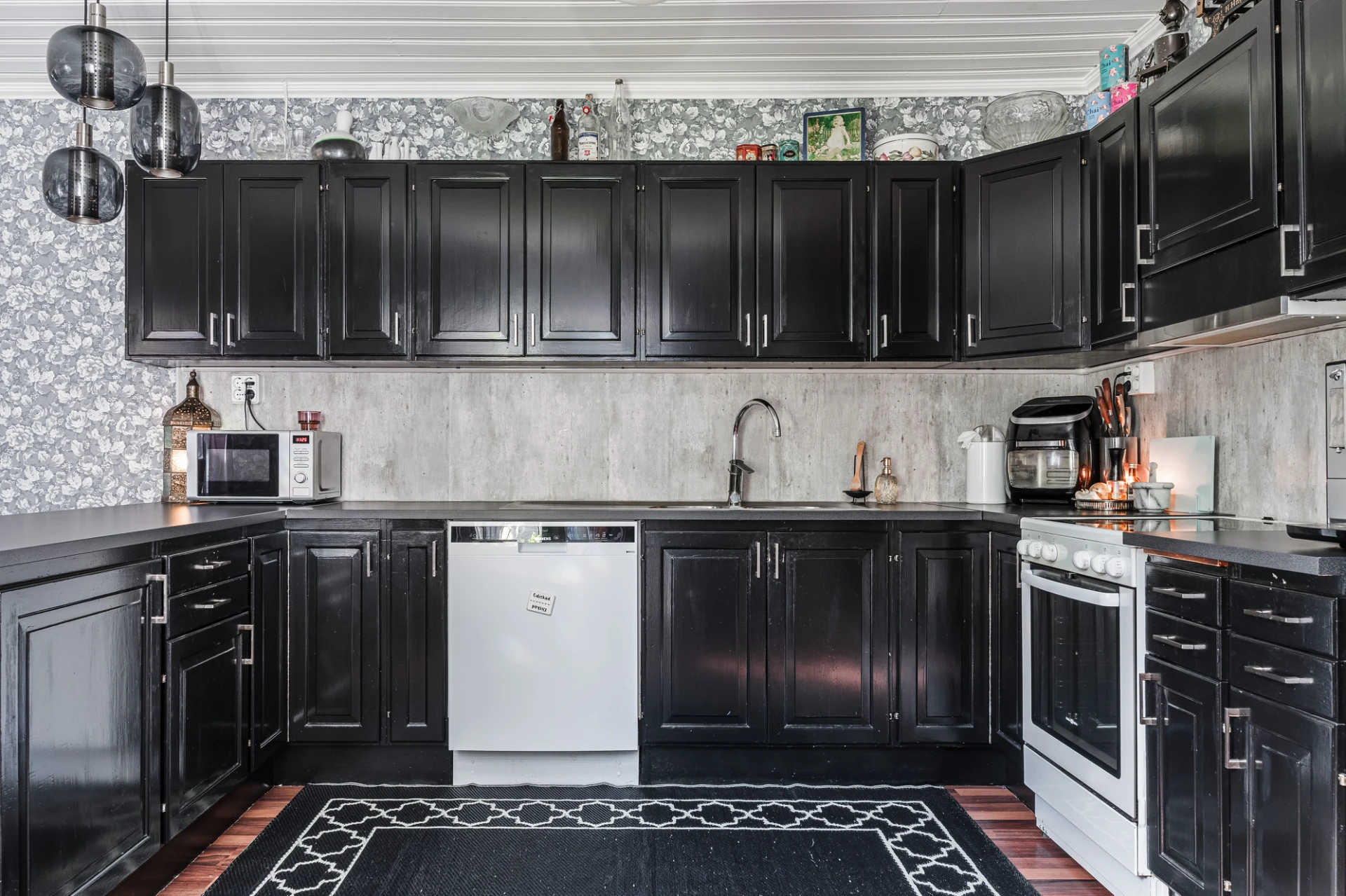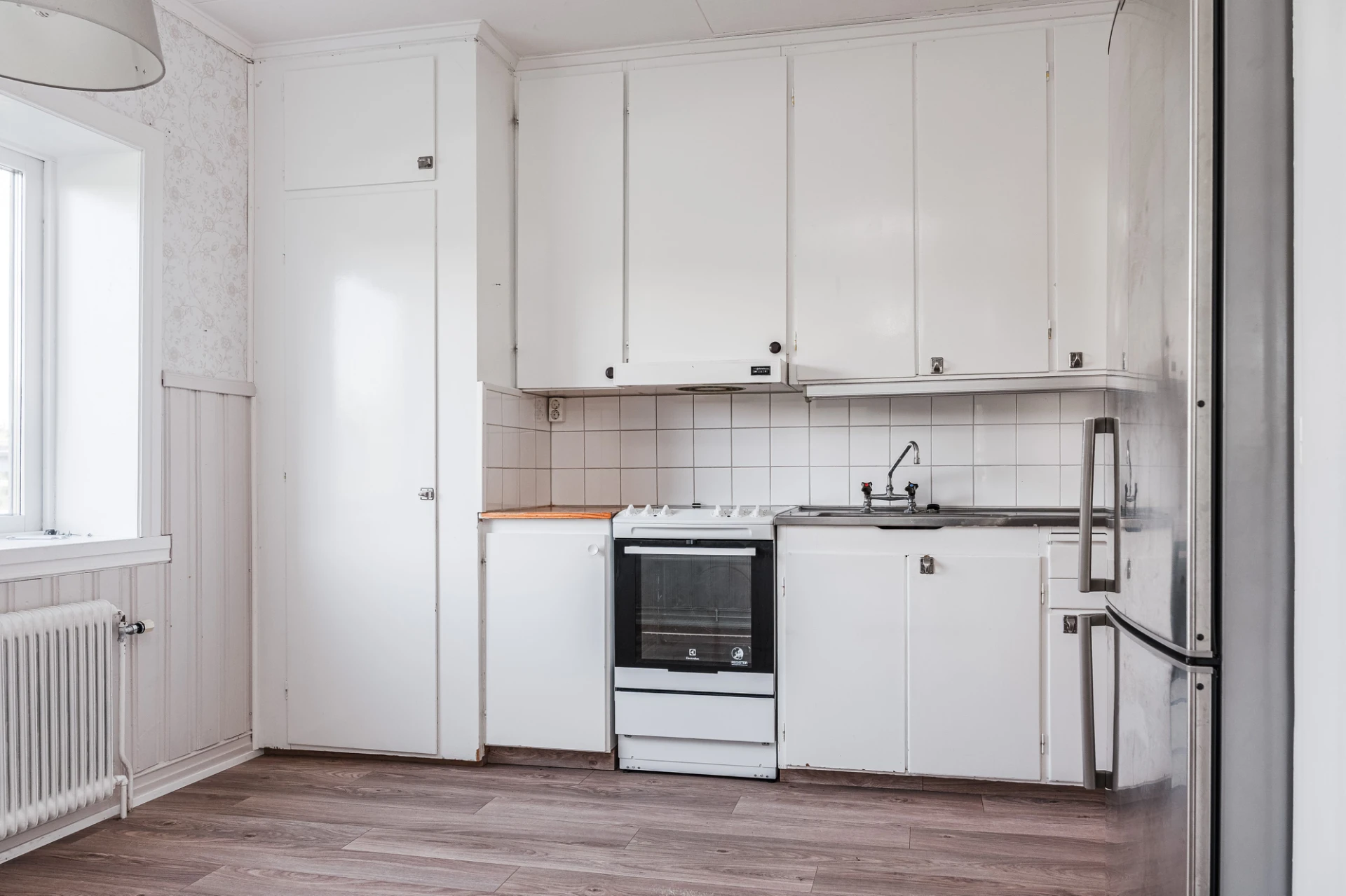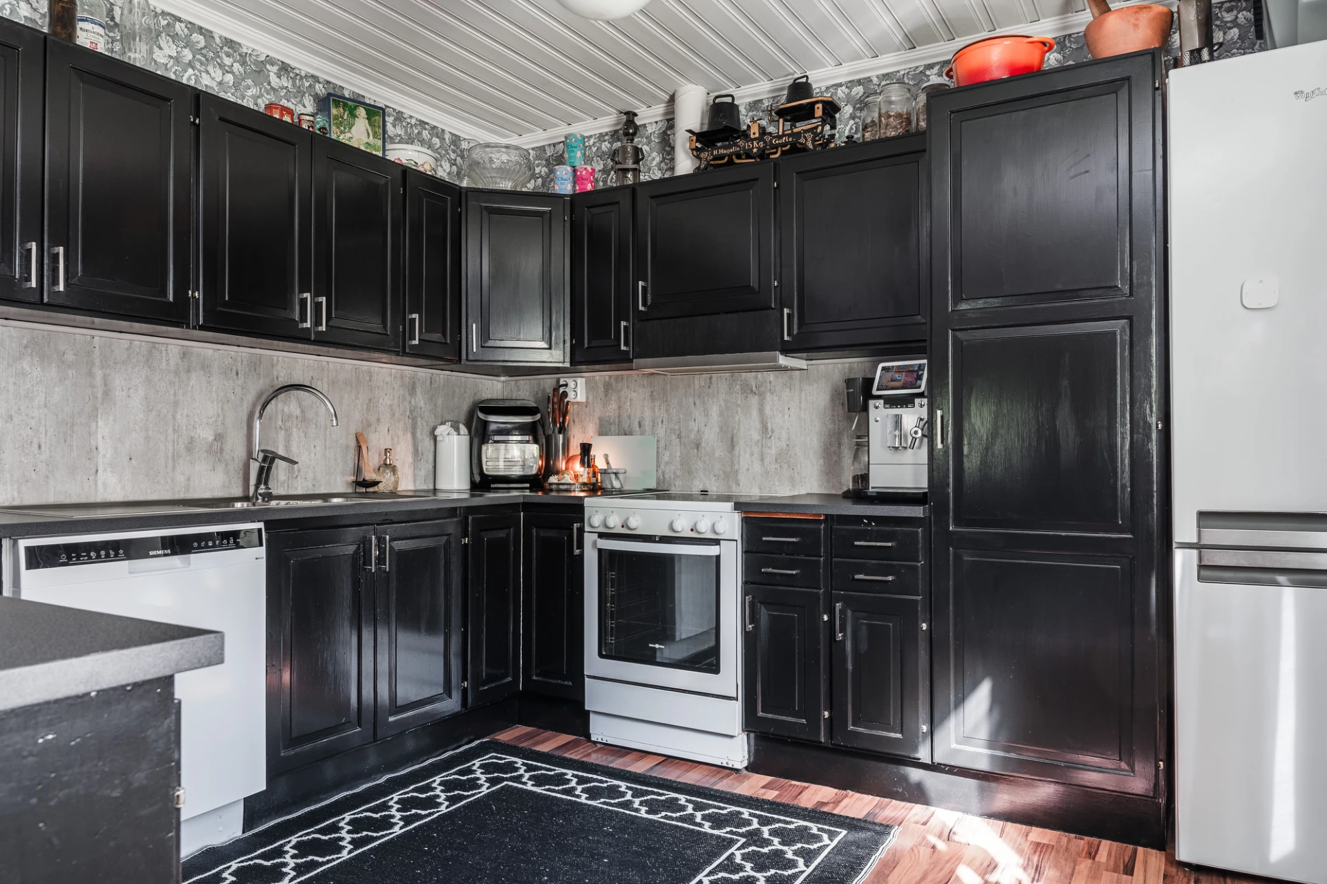 Laminatgolv och blommönstrad tapet på väggar. Svarta köksluckor och grå laminatbänkskiva. Den maskinella utrustningen består av köksfläkt, spis med ugn, diskmaskin samt kyl och frys. Här finns plats för matgrupp.