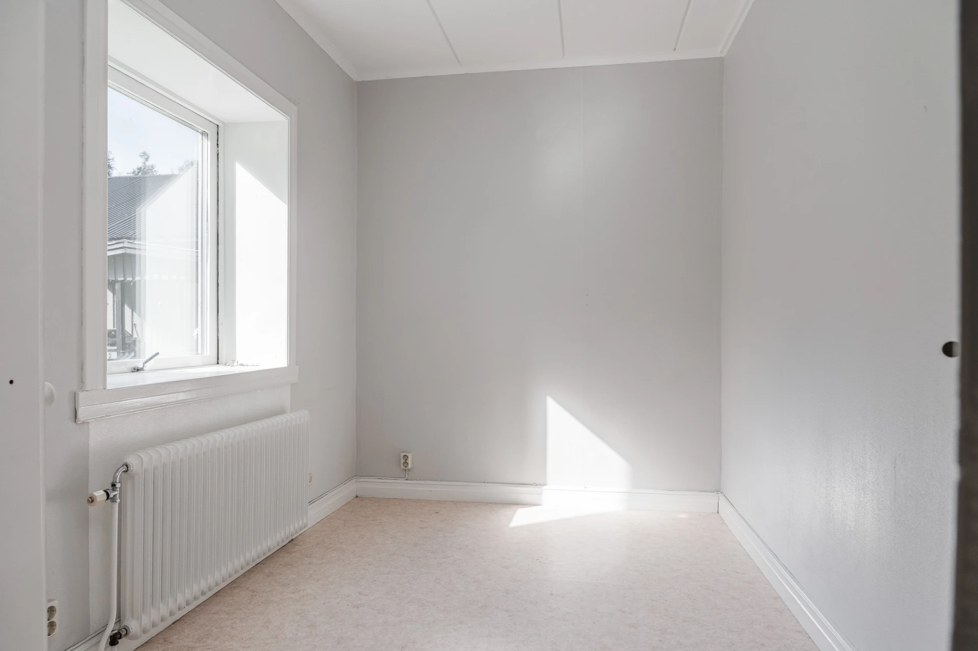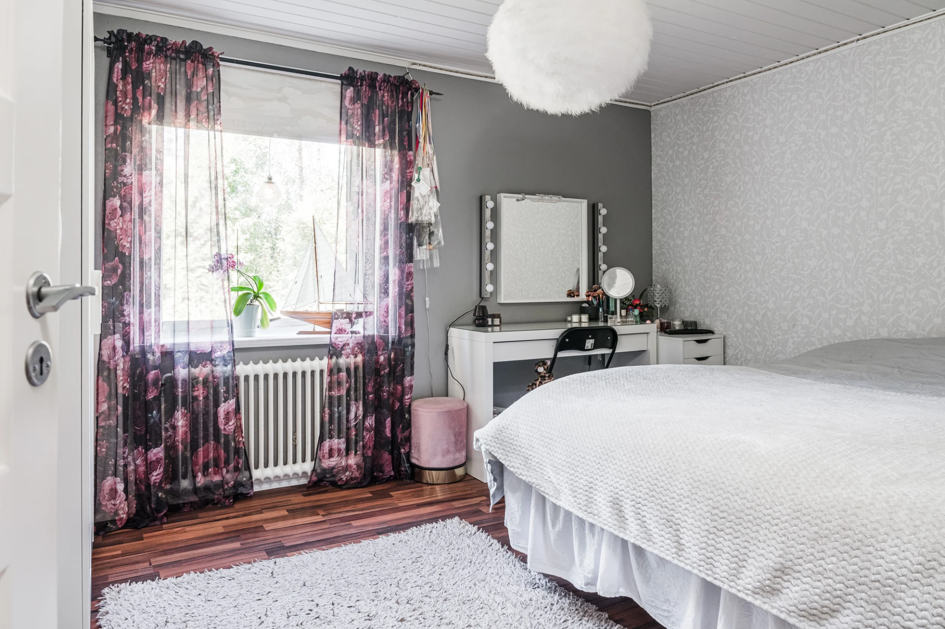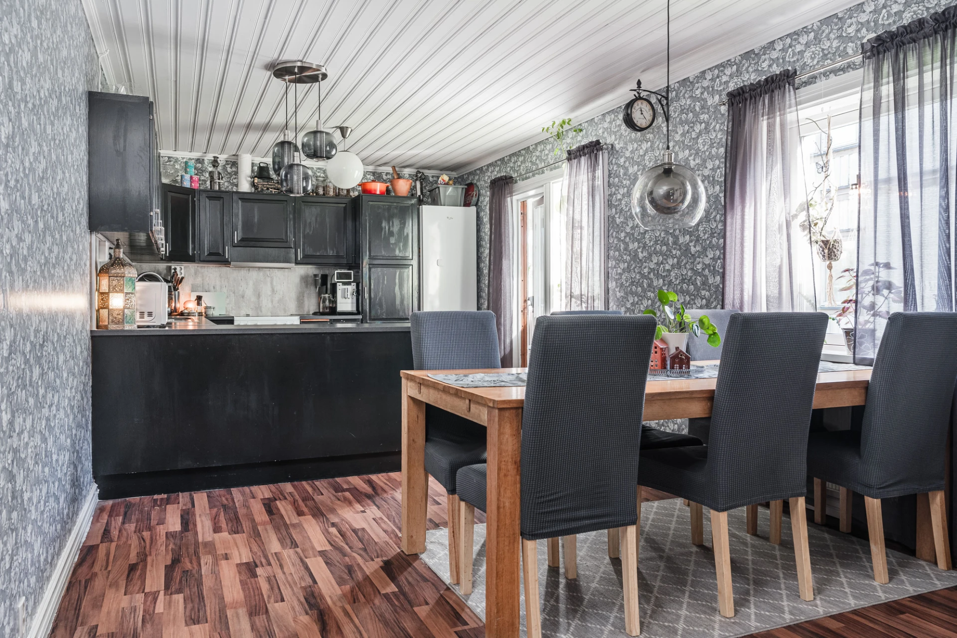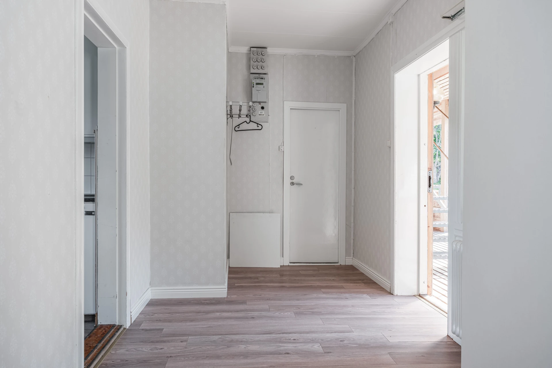 När du stiger in i bostadshuset välkomnas du av en stor hall med avhängning och garderobsförvaring. Vidare når du kök med plats för matgrupp. Vardagsrummet är rymligt och har parkettgolv. Villan erbjuder fyra sovrum i bra storlek, vilket gör att det finns gott om plats för familjen. Ett fräscht duschrum med WC finns också.