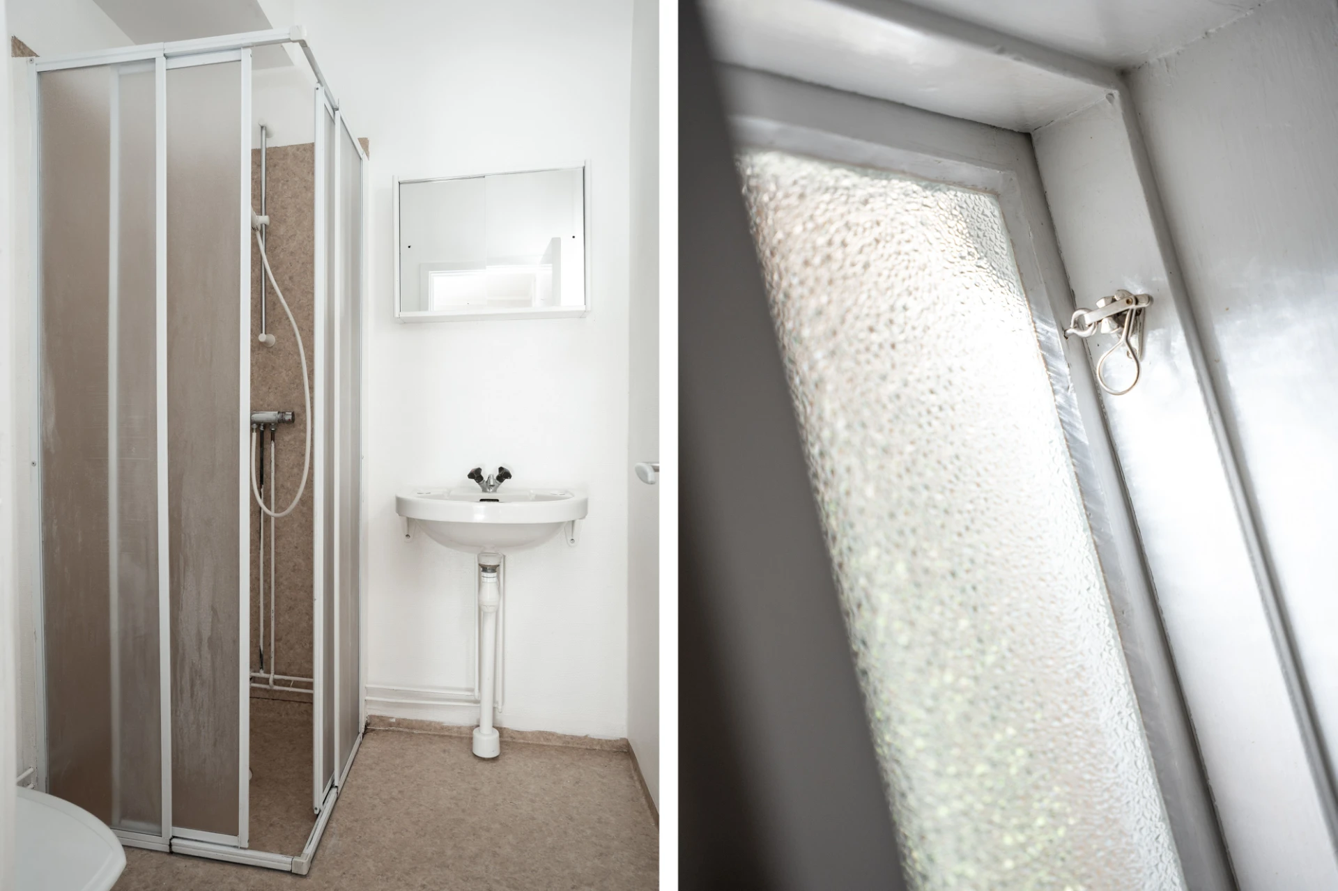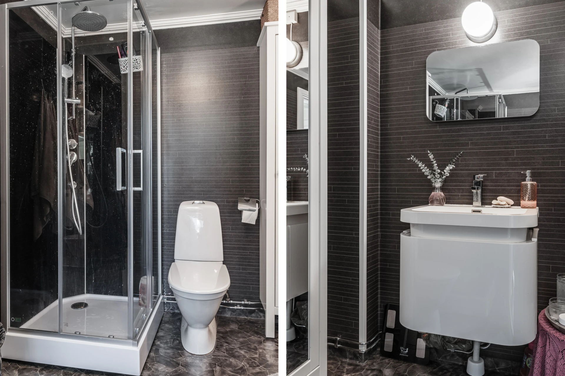 Våtrumsmatta och våtrumstapet på väggar. Handfat, WC och dusch.