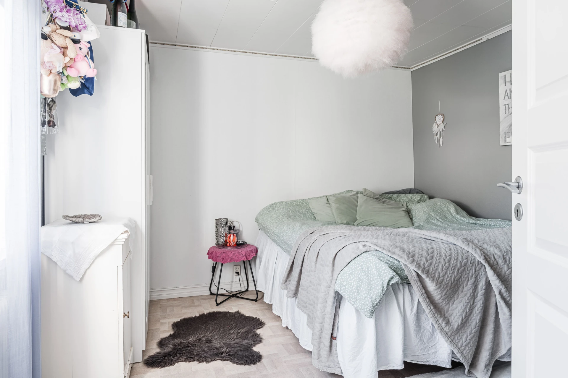 Laminatgolv och vita väggar samt grå fondvägg. Här finns plats för dubbelsäng med tillhörande möblemang. Förvaring i garderob.