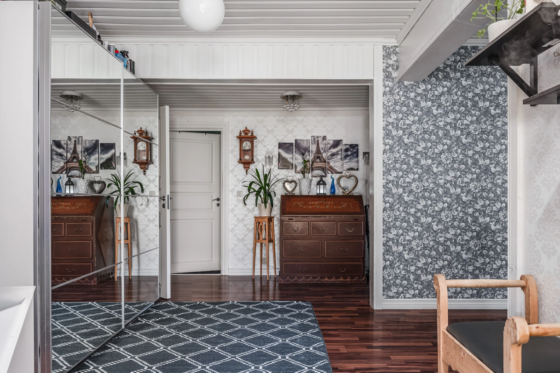 Laminatgolv och ljus mönstrad tapet på väggar. Här finns möjlighet till avhängning och förvaring i garderob.