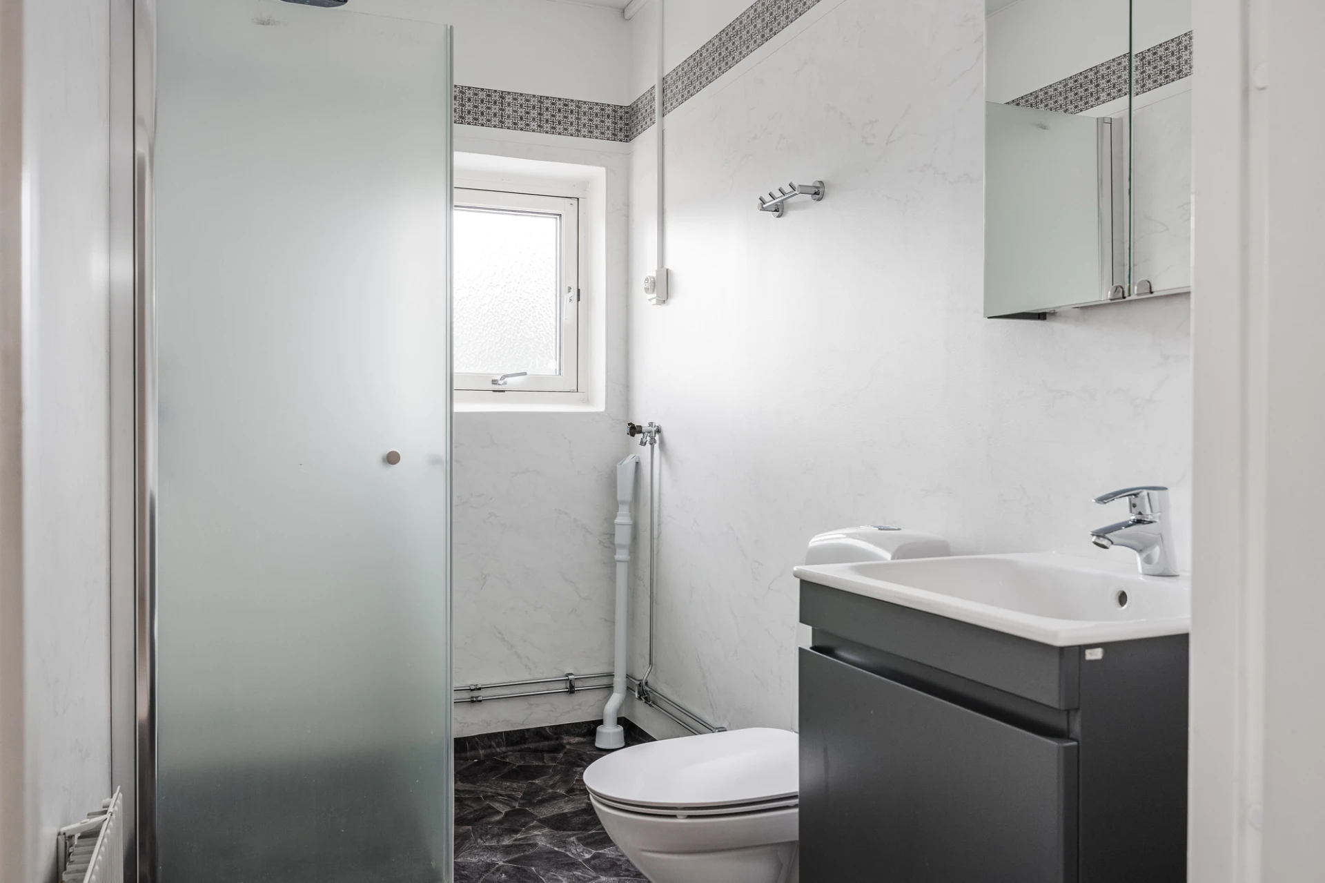 Våtrumsmatta och våtrumstapet på väggar. Handfat i kommod, WC och dusch.